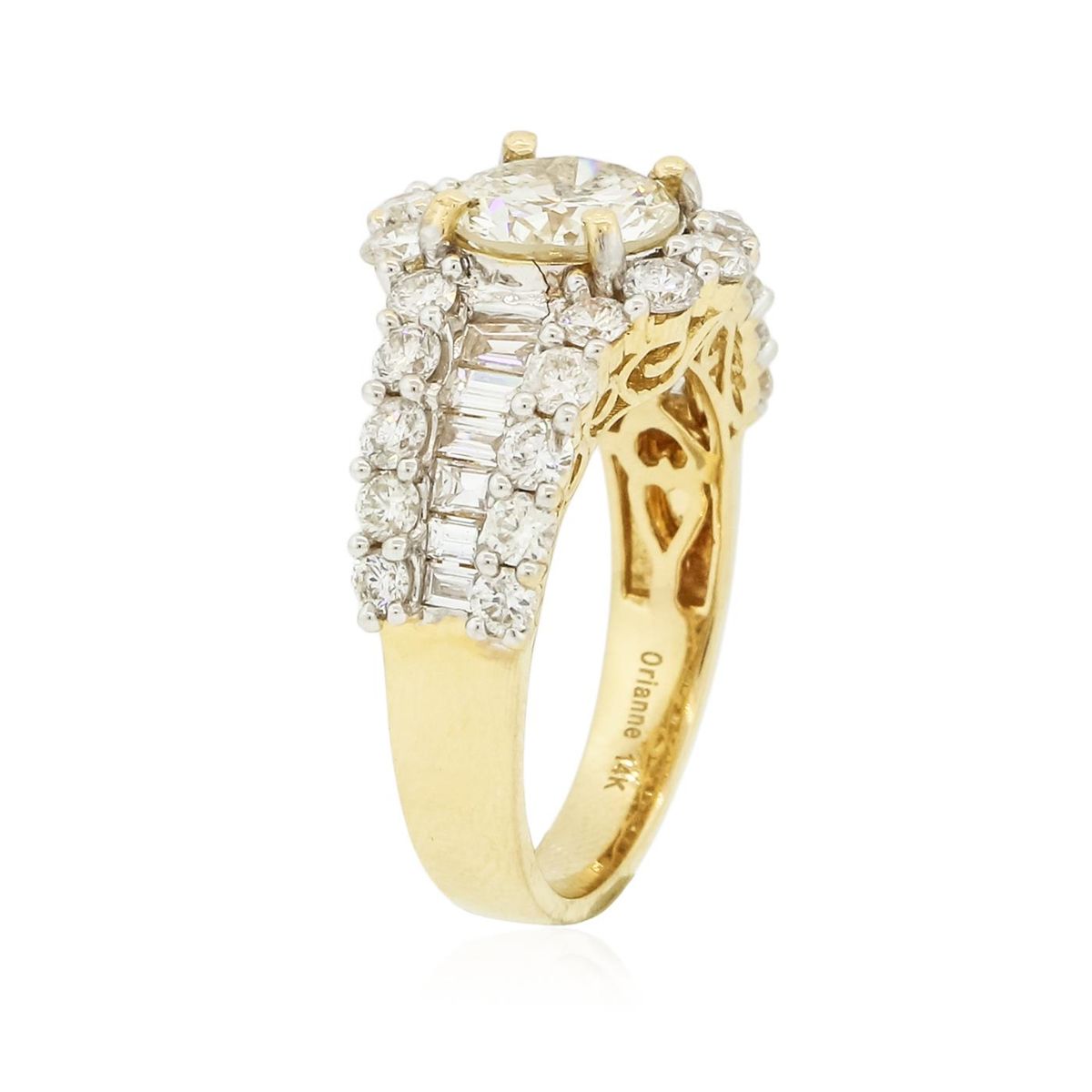 One electronically tested 14KT yellow gold ladies combination cast & assembled engagement ring with a flat shank with a bright polish finish. Identified with markings of "14K". Condition is new. Containing: One prong set round brilliant cut diamond, measuring 7.66 - 7.58 x 4.65mm (depth est.) approximate weight of 1.65ct. Clarity: I-2. Color: L, Cut is Good. Twenty-Six prong set round brilliant cut diamonds, measuring 2.40 - 2.20 x 1.38mm (depth est.) approximate total weight of 26 Stones = 1.16ct. Clarity: SI-1 to I-1. Color: I, Cut is Good. Twelve channel set baguette cut diamonds, measuring from 2.00 x 1.30 x 1.11mm (depth est.) to 2.90 x 2.00 x 1.70mm (depth est.) approximate total weight of 12 Stones = 0.62ct. Clarity: VS-2. Color: J - K, Cut is Good. All diamonds are graded in the mounting, unless otherwise stated. Total Weight of Diamonds 3.43ct. Total Weight of Ring 6.20 grams. GGL Appraised at $18,110.00.