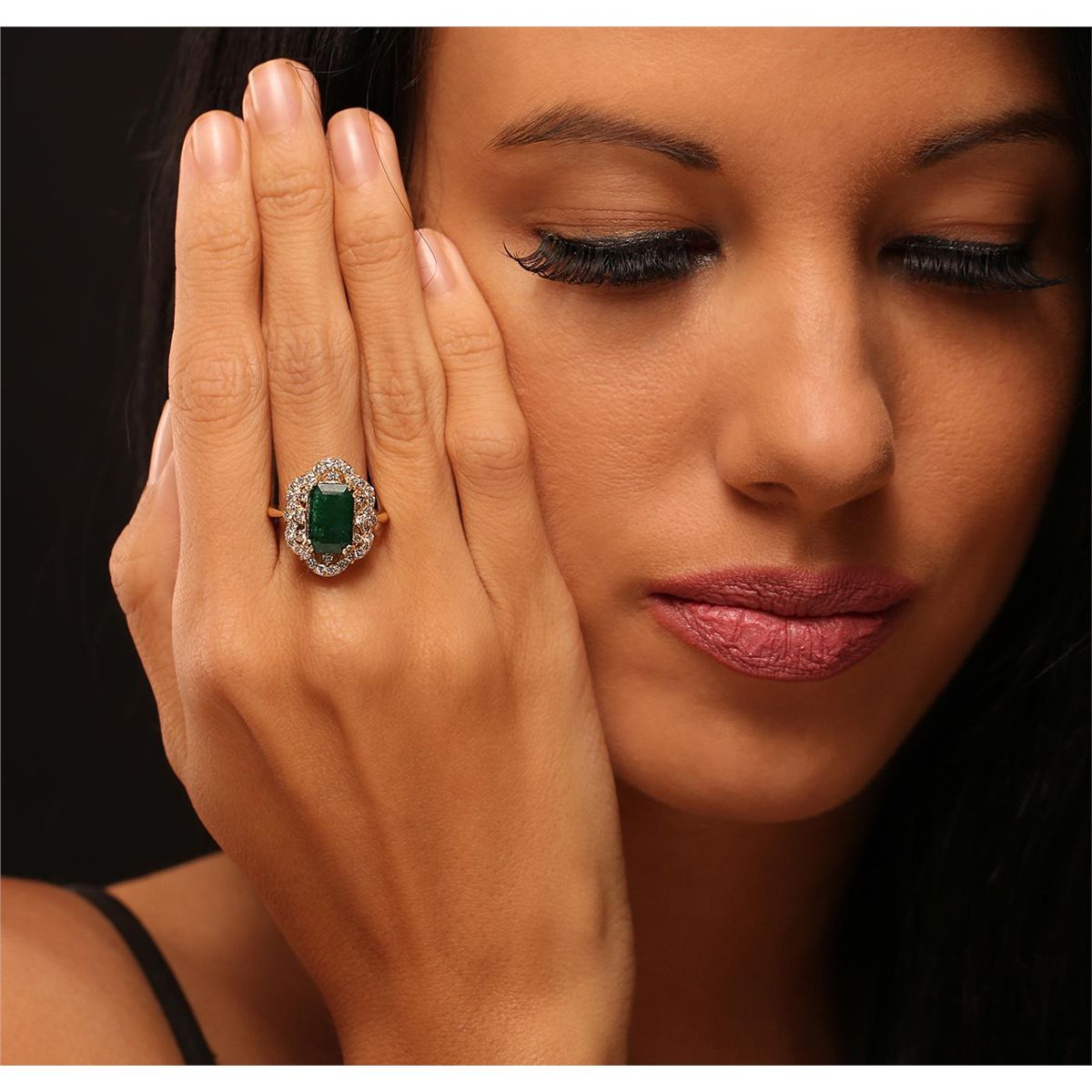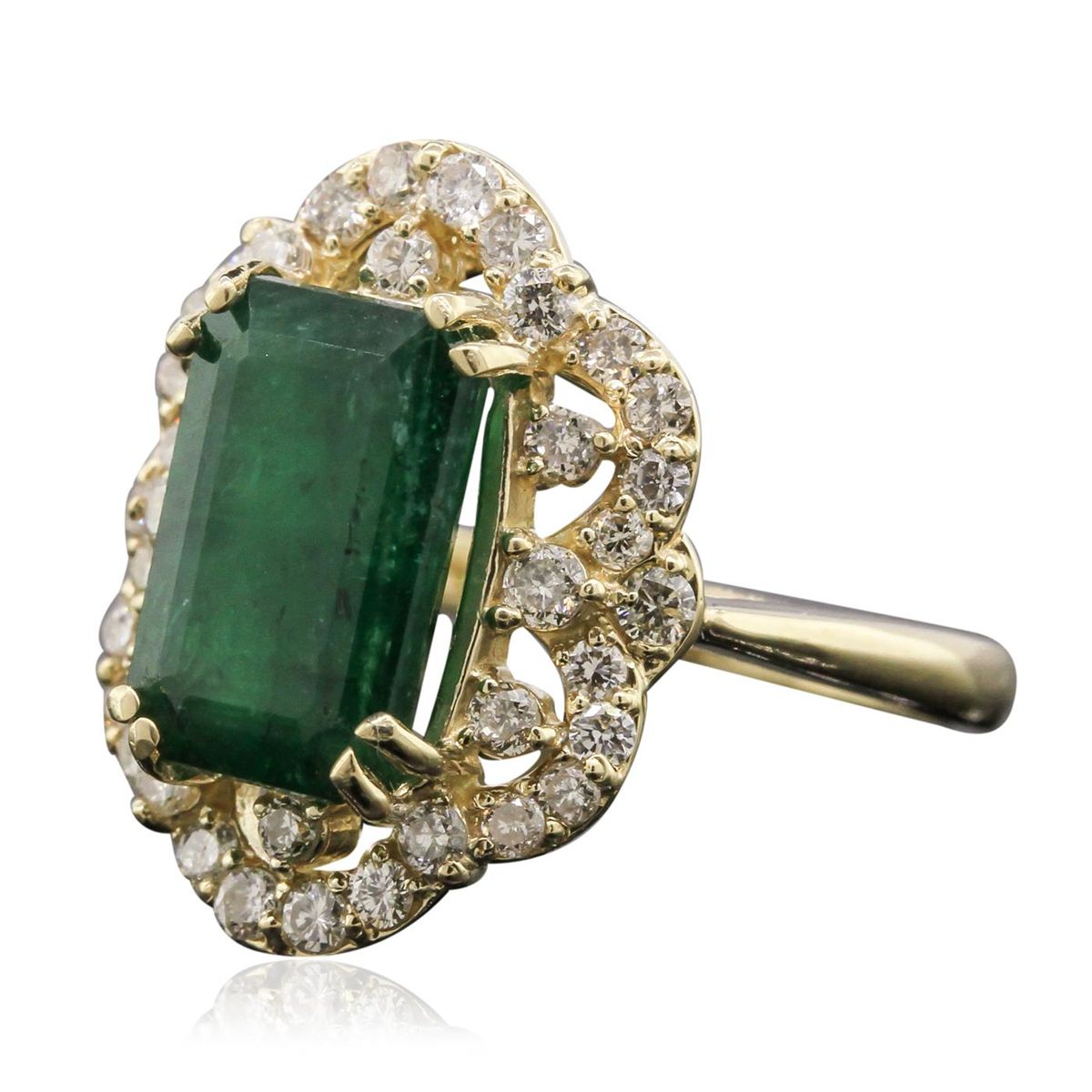 One electronically tested 14KT yellow gold Ladies combination cast & assembled ring with a bright polish finish. Condition is new. Identified with markings of "K14". Containing: One prong set emerald standard step cut natural emerald, measuring 11.80 x 7.50 x 5.30mm, approximate weight of 3.44ct., clarity is heavily included, type III, medium dark, moderately strong, green color, (GIA G 6/4), cut is good. Colored gemstones are presumed to have been subjected to commonly used color/clarity enhancement processes. Forty prong set round brilliant cut diamonds, measuring 2.00 - 1.60 x 1.08mm (depth est.) approximate. Total Weight of 40 Stones = 0.85ct. Clarity: I-1 to I-2. Color: K - L, Cut is Good. Total Weight of Colored Stones 3.44ct. Total Weight of Diamonds 0.85ct. Total Weight of Ring 6.20 grams. GGL Appraised at $9,855.00.