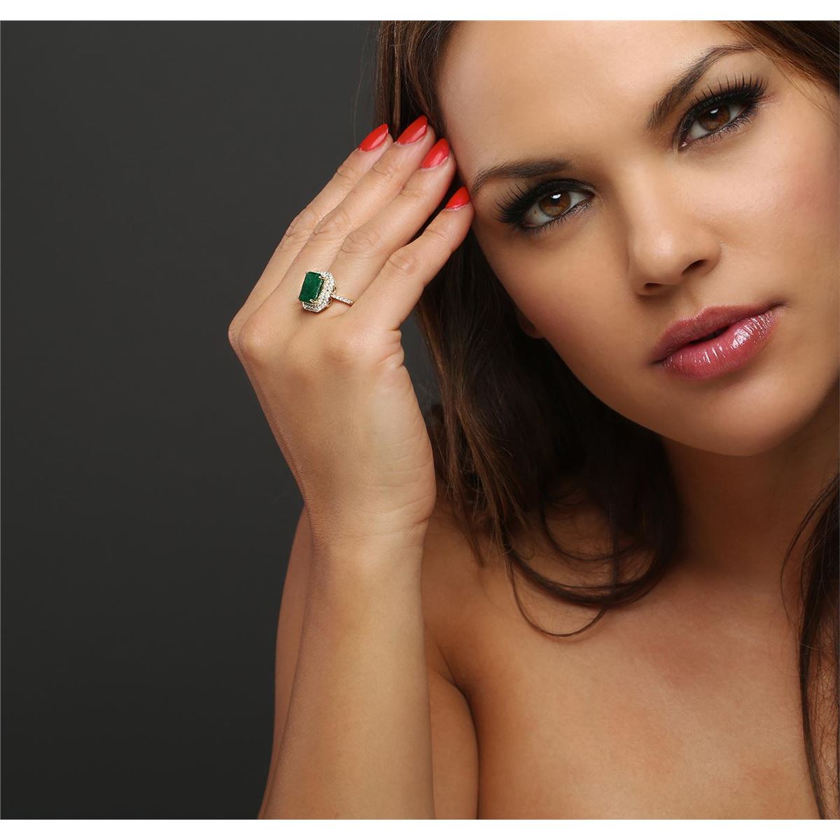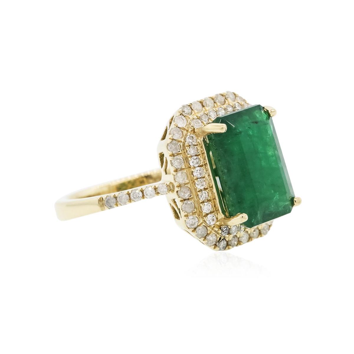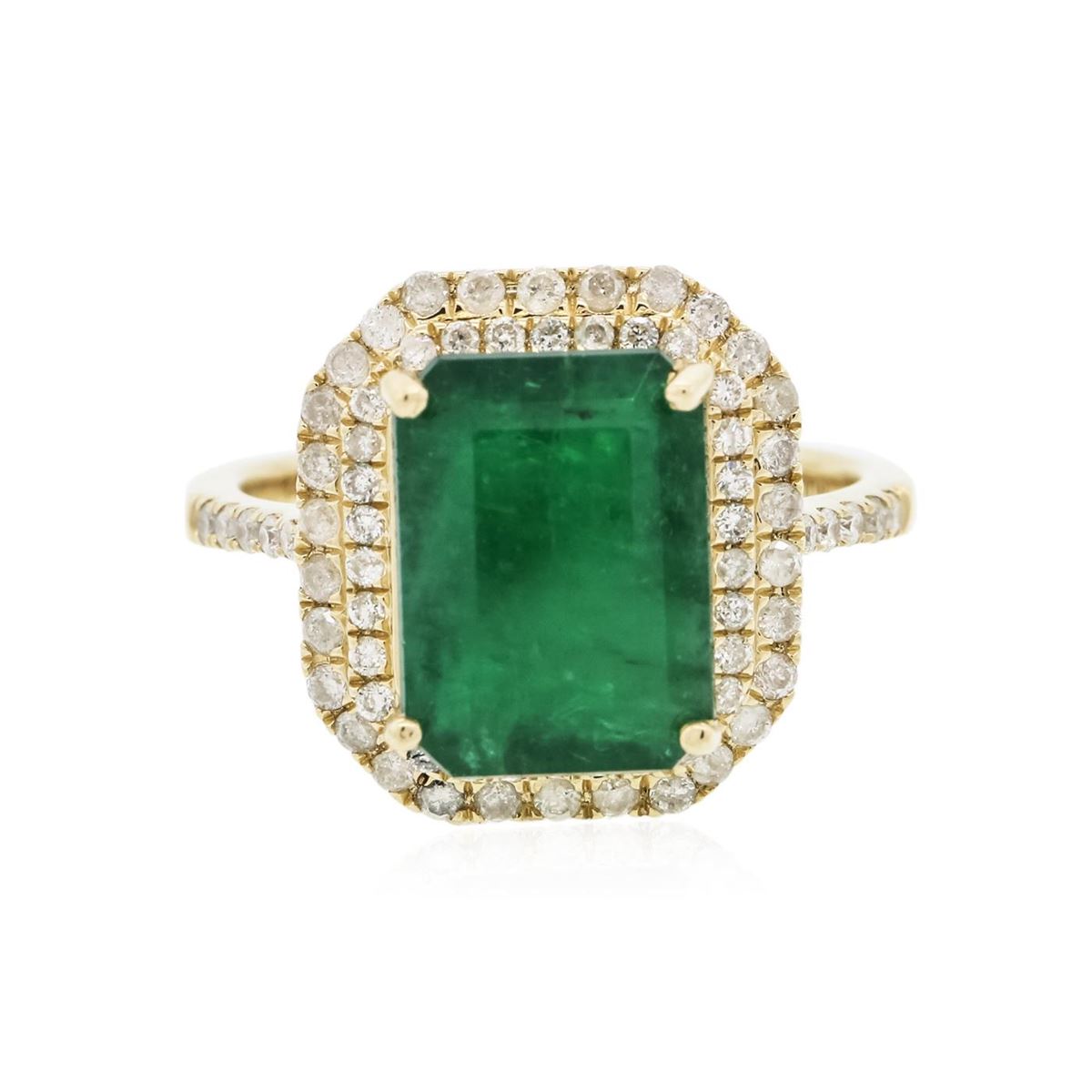 One electronically tested 14KT yellow gold Ladies cast ring with a bright polish finish. Condition is new. Identified with markings of "14K". Containing: One prong set emerald standard step cut natural emerald, measuring 10.19 x 8.45 x 5.49mm, approximate weight of 3.47ct., clarity is heavily included, type III, medium, moderately strong, green color, (GIA G 5/4), cut is good. Colored gemstones are presumed to have been subjected to commonly used color/clarity enhancement processes. Seventy prong set round brilliant cut diamonds, measuring 1.30 - 1.30 x 0.78mm (depth est.) approximate. Total Weight of 70 Stones = 0.56ct. Clarity: I-1 to I-3. Color: I - J. All grading of diamonds and colored gemstones in this piece of jewelry are graded in the mounting, unless otherwise stated. Total Weight of Colored Stones 3.47ct. Total Weight of Diamonds 0.56ct. Total Weight of Ring 4.80 grams. GGL Appraised at $8,900.00.