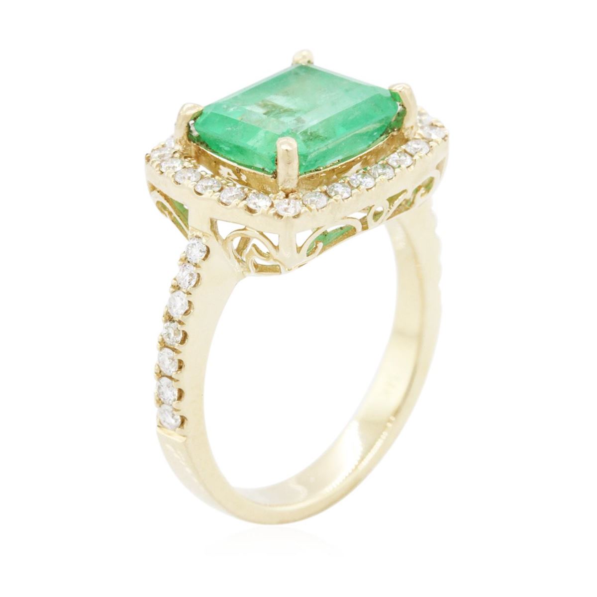 One electronically tested 14KT yellow gold ladies combination cast & assembled emerald and diamond ring with a flat shank with a bright polish finish. Identified with markings of "14K". Condition is new. Containing: One prong set emerald standard step cut natural emerald, measuring 9.90 x 8.40 x 5.68mm, approximate weight of 3.47ct., clarity is slightly included, type III, medium, moderately strong, bluish green color, (GIA bG 5/4), cut is good. Forty-One prong set round brilliant cut diamonds, measuring 1.30 - 1.20 x 0.75mm (depth est.) approximate total weight of 41 Stones = 0.29ct. Clarity: I-1 to I-2. Color: J - K, Cut is Good. Colored gemstones are presumed to have been subjected to commonly used enhancement processes. All diamonds and colored gemstones are graded in the mounting, unless otherwise stated total weight of Colored Stones 3.47ct. Total Weight of Diamonds 0.29ct. Total Weight of Ring 5.40 grams. GGL Appraised at $9,745.00.