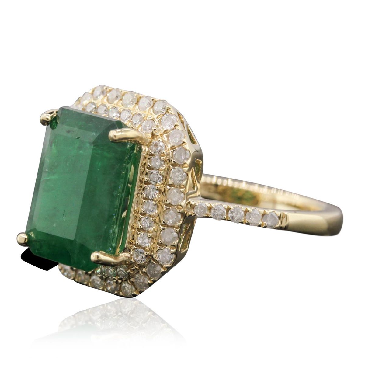 One electronically tested 14KT yellow gold Ladies cast ring with a bright polish finish. Condition is new. Identified with markings of "14K". Containing: One prong set emerald standard step cut natural emerald, measuring 10.19 x 8.45 x 5.49mm, approximate weight of 3.47ct., clarity is heavily included, type III, medium, moderately strong, green color, (GIA G 5/4), cut is good. Colored gemstones are presumed to have been subjected to commonly used color/clarity enhancement processes. Seventy prong set round brilliant cut diamonds, measuring 1.30 - 1.30 x 0.78mm (depth est.) approximate. Total Weight of 70 Stones = 0.56ct. Clarity: I-1 to I-3. Color: I - J. All grading of diamonds and colored gemstones in this piece of jewelry are graded in the mounting, unless otherwise stated. Total Weight of Colored Stones 3.47ct. Total Weight of Diamonds 0.56ct. Total Weight of Ring 4.80 grams. GGL Appraised at $8,900.00.
