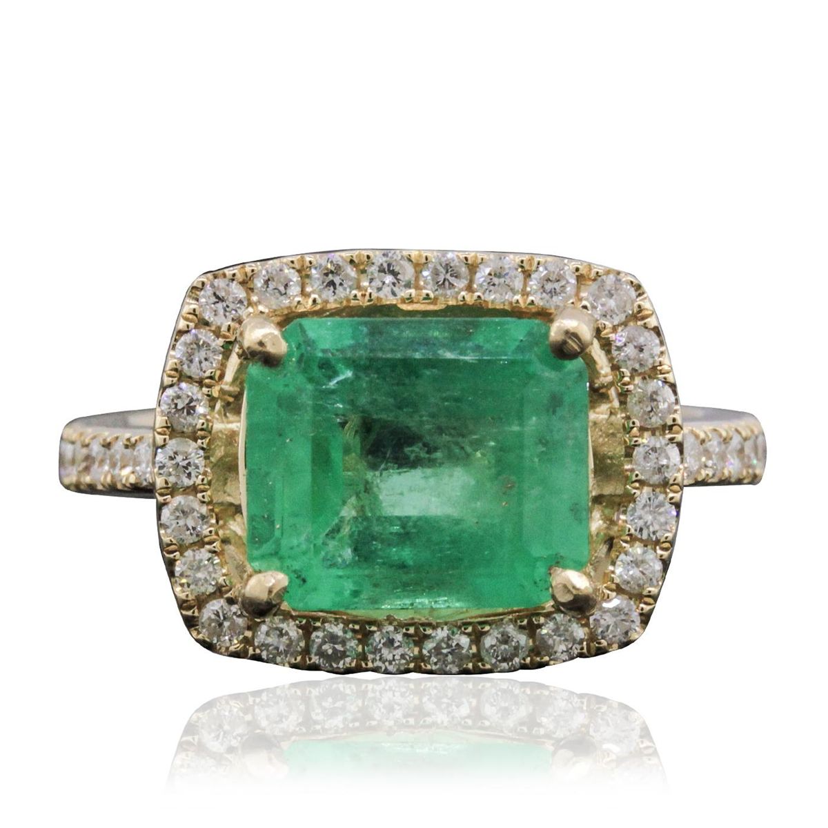 One electronically tested 14KT yellow gold ladies combination cast & assembled emerald and diamond ring with a flat shank with a bright polish finish. Identified with markings of "14K". Condition is new. Containing: One prong set emerald standard step cut natural emerald, measuring 9.90 x 8.40 x 5.68mm, approximate weight of 3.47ct., clarity is slightly included, type III, medium, moderately strong, bluish green color, (GIA bG 5/4), cut is good. Forty-One prong set round brilliant cut diamonds, measuring 1.30 - 1.20 x 0.75mm (depth est.) approximate total weight of 41 Stones = 0.29ct. Clarity: I-1 to I-2. Color: J - K, Cut is Good. Colored gemstones are presumed to have been subjected to commonly used enhancement processes. All diamonds and colored gemstones are graded in the mounting, unless otherwise stated total weight of Colored Stones 3.47ct. Total Weight of Diamonds 0.29ct. Total Weight of Ring 5.40 grams. GGL Appraised at $9,745.00.