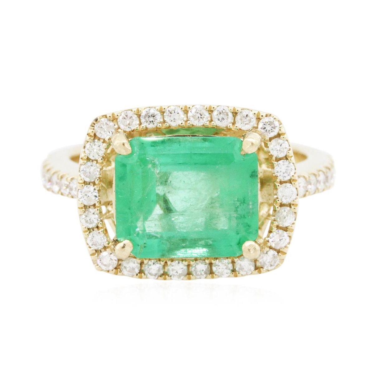 One electronically tested 14KT yellow gold ladies combination cast & assembled emerald and diamond ring with a flat shank with a bright polish finish. Identified with markings of "14K". Condition is new. Containing: One prong set emerald standard step cut natural emerald, measuring 9.90 x 8.40 x 5.68mm, approximate weight of 3.47ct., clarity is slightly included, type III, medium, moderately strong, bluish green color, (GIA bG 5/4), cut is good. Forty-One prong set round brilliant cut diamonds, measuring 1.30 - 1.20 x 0.75mm (depth est.) approximate total weight of 41 Stones = 0.29ct. Clarity: I-1 to I-2. Color: J - K, Cut is Good. Colored gemstones are presumed to have been subjected to commonly used enhancement processes. All diamonds and colored gemstones are graded in the mounting, unless otherwise stated total weight of Colored Stones 3.47ct. Total Weight of Diamonds 0.29ct. Total Weight of Ring 5.40 grams. GGL Appraised at $9,745.00.