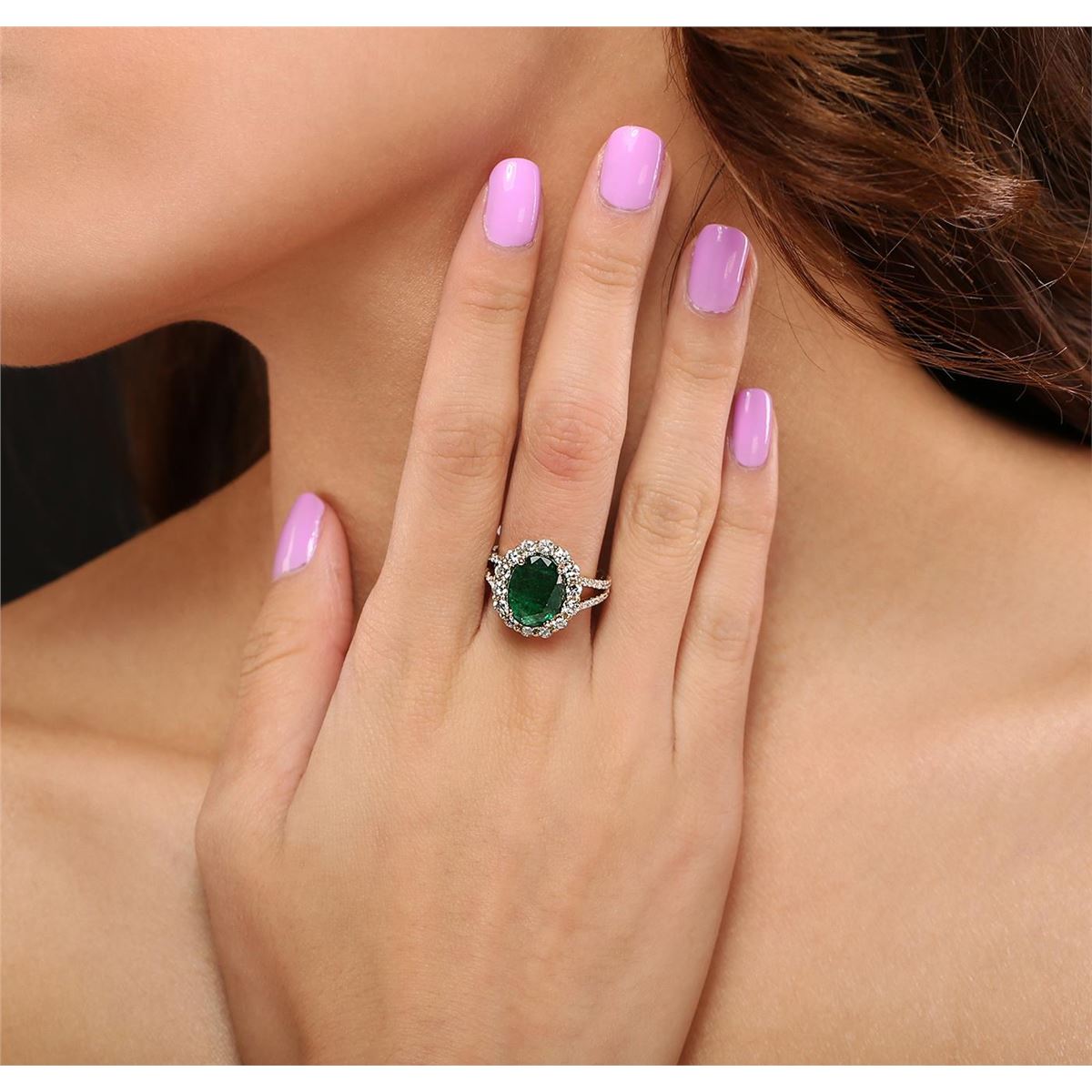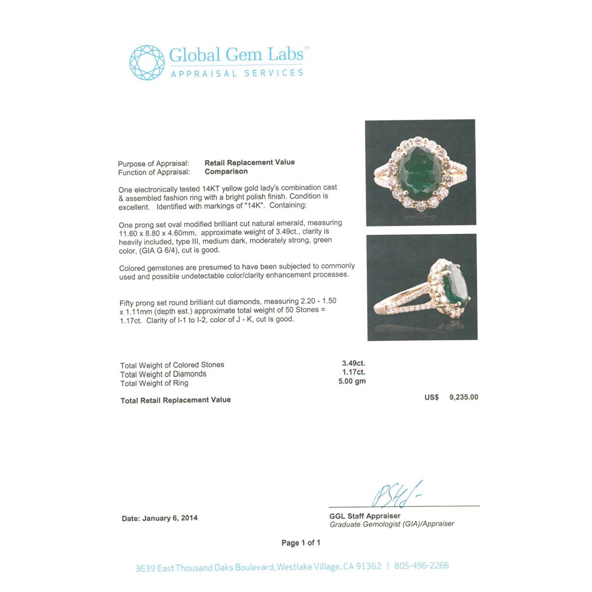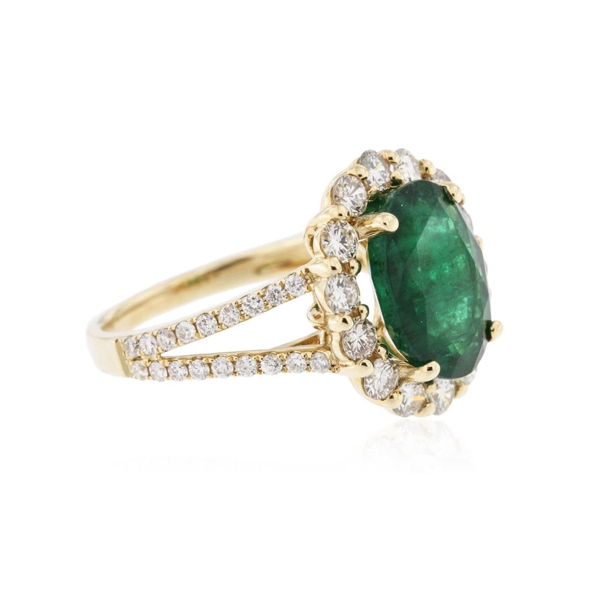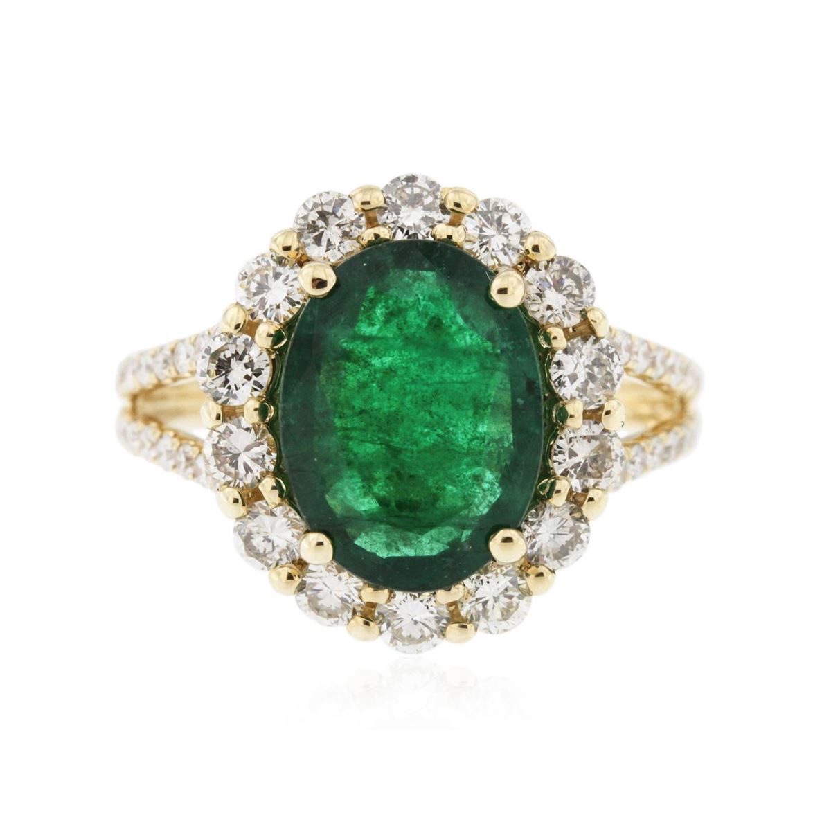 One electronically tested 14KT yellow gold Ladies combination cast & assembled fashion ring with a bright polish finish. Identified with markings of "14K". Condition is excellent. Containing: One prong set oval modified brilliant cut natural emerald, measuring 11.60 x 8.80 x 4.60mm, approximate weight of 3.49ct., clarity is heavily included, type III, medium dark, moderately strong, green color, (GIA G 6/4), cut is good. Colored gemstones are presumed to have been subjected to commonly used and possible undetectable color/clarity enhancement processes. Fifty prong set round brilliant cut diamonds, measuring 2.20 - 1.50 x 1.11mm (depth est.) approximate total weight of 50 Stones = 1.17ct. Clarity of I-1 to I-2, Color of J - K, Cut is Good. Total Weight of Colored Stones 3.49ct. Total Weight of Diamonds 1.17ct. Total Weight of Ring 5.00gm. GGL Appraised at $9,235.00.