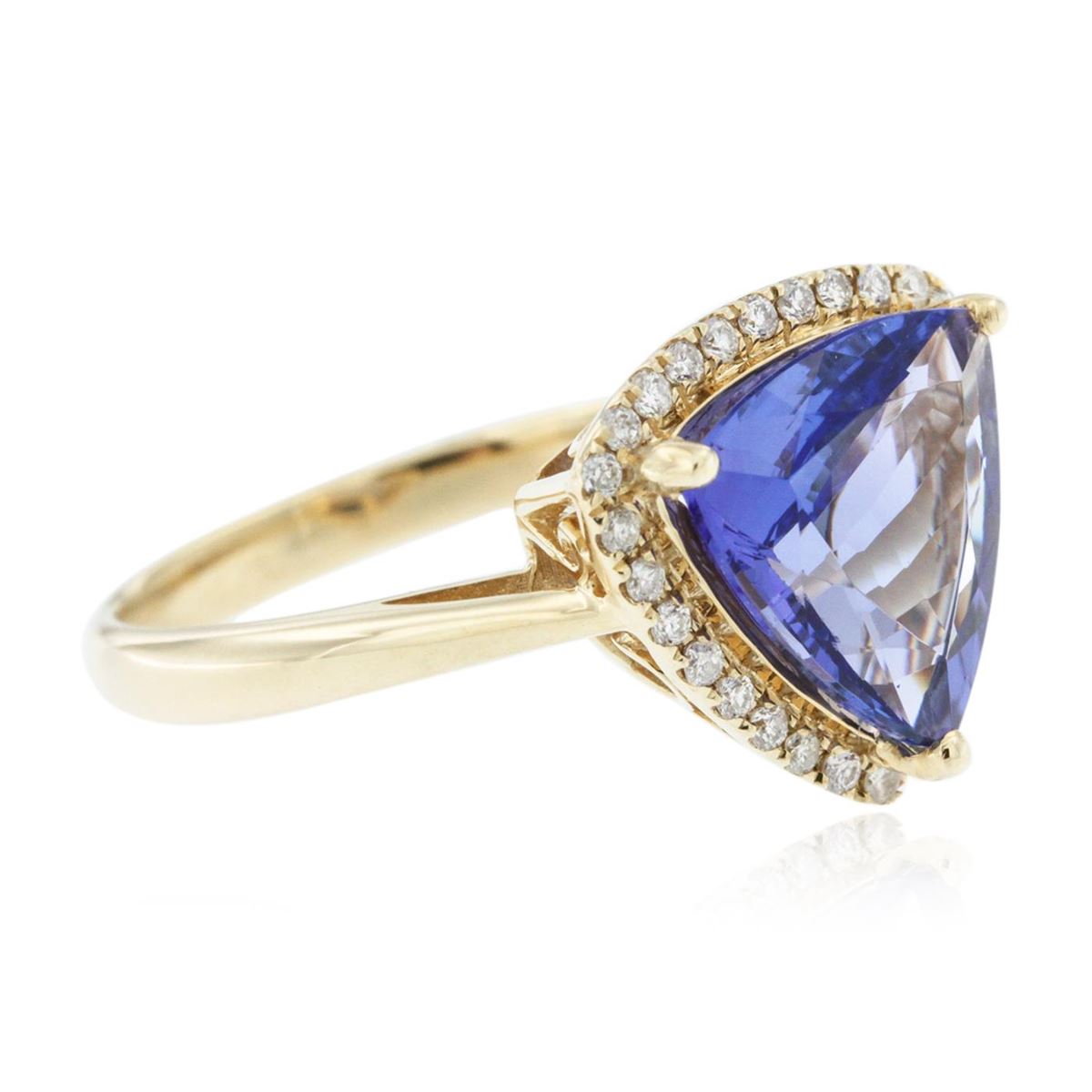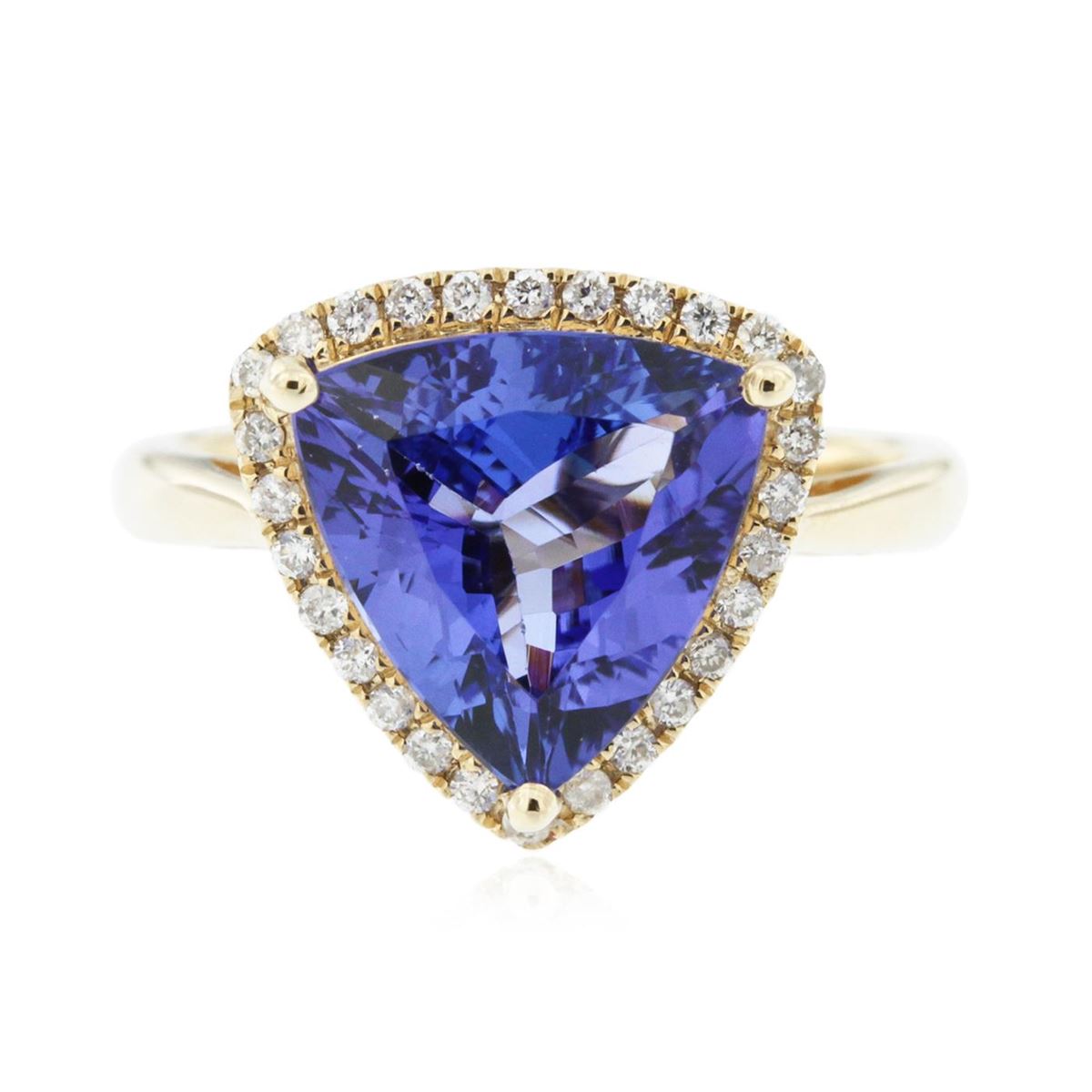 One electronically tested 14KT yellow gold Ladies combination cast & assembled ring with a bright polish finish. Condition is new. Identified with markings of "14K". Containing: Twenty-Eight bead set round brilliant cut diamonds, measuring 1.10 - 1.10 x 0.66mm (depth est.) approximate. Total Weight of 28 Stones = 0.28ct. Clarity: I-1 to I-2. Color: H - I, Cut is Good. One prong set triangle modified brilliant cut natural tanzanite, measuring 9.00 x 9.00 x 5.85mm, exact weight 3.50ct., clarity is eye clean, type I, medium light, very slightly grayish, violet color, (GIA V 4/3), cut is very good. Colored gemstones are presumed to have been subjected to commonly used color/clarity enhancement processes. Total Weight of Colored Stones 3.50ct. Total Weight of Diamonds 0.28ct. Total Weight of Ring 4.00 grams. GGL Appraised at $7,295.00.