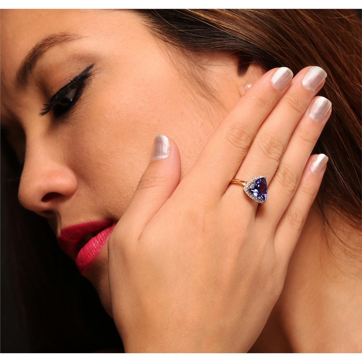 One electronically tested 14KT yellow gold Ladies combination cast & assembled ring with a bright polish finish. Condition is new. Identified with markings of "14K". Containing: Twenty-Eight bead set round brilliant cut diamonds, measuring 1.10 - 1.10 x 0.66mm (depth est.) approximate. Total Weight of 28 Stones = 0.28ct. Clarity: I-1 to I-2. Color: H - I, Cut is Good. One prong set triangle modified brilliant cut natural tanzanite, measuring 9.00 x 9.00 x 5.85mm, exact weight 3.50ct., clarity is eye clean, type I, medium light, very slightly grayish, violet color, (GIA V 4/3), cut is very good. Colored gemstones are presumed to have been subjected to commonly used color/clarity enhancement processes. Total Weight of Colored Stones 3.50ct. Total Weight of Diamonds 0.28ct. Total Weight of Ring 4.00 grams. GGL Appraised at $7,295.00.