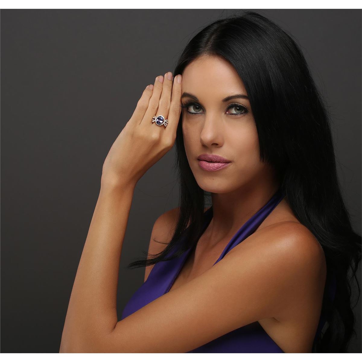 One electronically tested 14KT yellow gold ladies combination cast & assembled tanzanite and diamond ring with a split shank with a bright polish finish. Identified with markings of "14K". Condition is new. Containing: One prong set oval modified brilliant cut natural tanzanite, measuring 10.90 x 8.56 x 5.53mm, approximate weight of 3.51ct., clarity is eye clean, type I, medium light, very slightly grayish, violet color, (GIA V 4/3), cut is good. Seventy-Four prong set round brilliant cut diamonds, measuring 1.10 - 1.10 x 0.66mm (depth est.) approximate total weight of 74 Stones = 0.36ct. Clarity: I-1 to I-2. Color: I - J, Cut is Good. Colored gemstones are presumed to have been subjected to commonly used enhancement processes. All diamonds and colored gemstones are graded in the mounting, unless otherwise stated. Total Weight of Colored Stones 3.51ct. Total Weight of Diamonds 0.36ct. Total Weight of Ring 4.40 grams. GGL Appraised at $7,230.00.