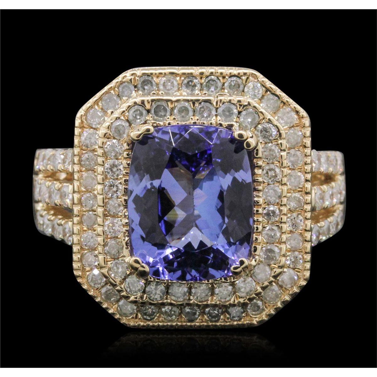 One electronically tested 14KT yellow gold ladies combination cast & assembled tanzanite and diamond ring with a split shank with a bright polish finish. Identified with markings of "14K". Condition is new. Containing: One prong set rectangular cushion modified brilliant cut natural tanzanite, measuring 10.52 x 8.11 x 5.24mm, approximate weight of 3.52ct., clarity is eye clean, type I, medium light, very slightly grayish, violet color, (GIA V 4/3), cut is good. Eighty-Six prong set round brilliant cut diamonds, measuring 1.40 - 1.40 x 0.84mm (depth est.) approximate total weight of 86 Stones = 0.86ct. Clarity: I-1 to I-2. Color: I - J, Cut is Good. Colored gemstones are presumed to have been subjected to commonly used enhancement processes. All diamonds and colored gemstones are graded in the mounting, unless otherwise stated. Total Weight of Colored Stones 3.52ct. Total Weight of Diamonds 0.86ct. Total Weight of Ring 7.90 grams. GGL Appraised at $9,070.00.