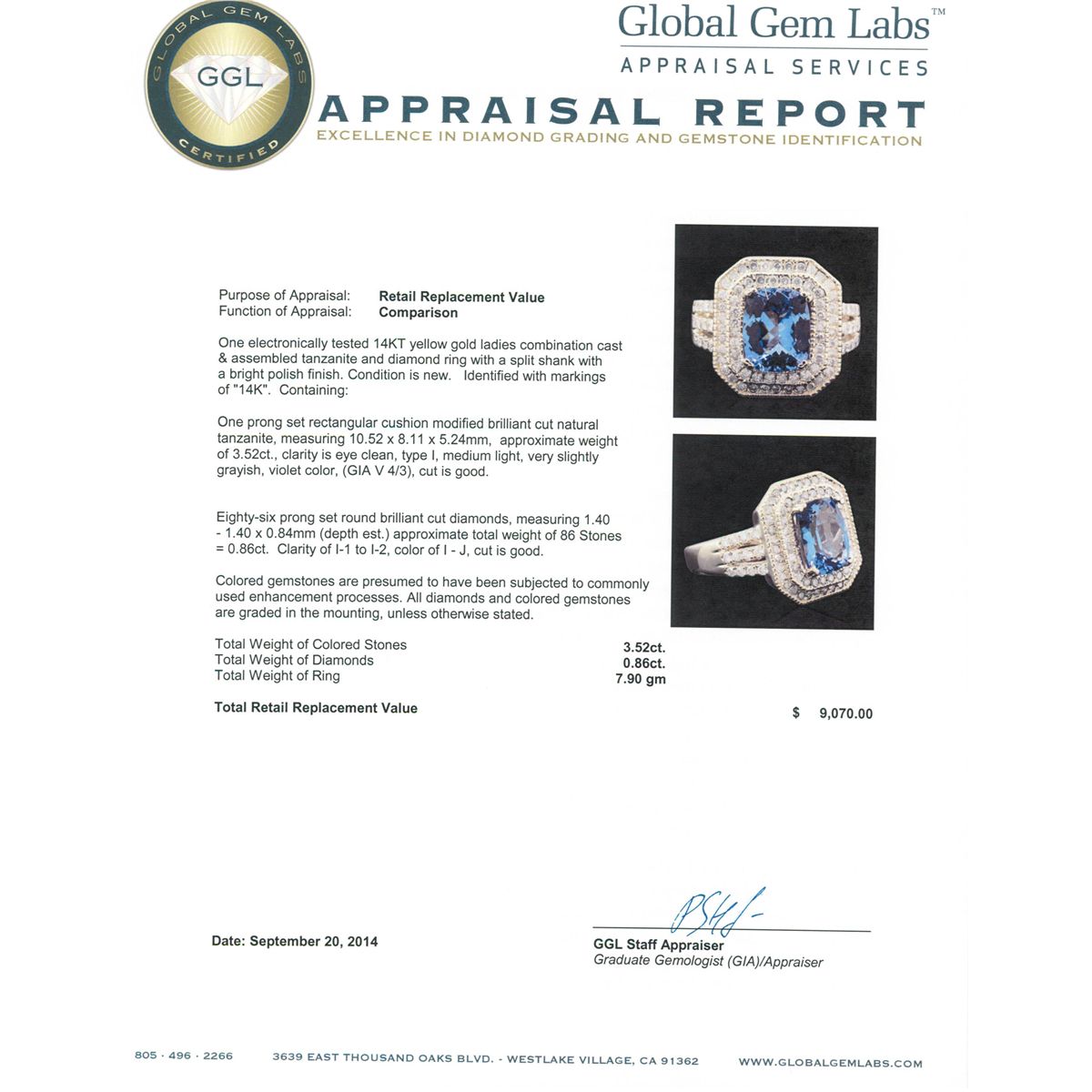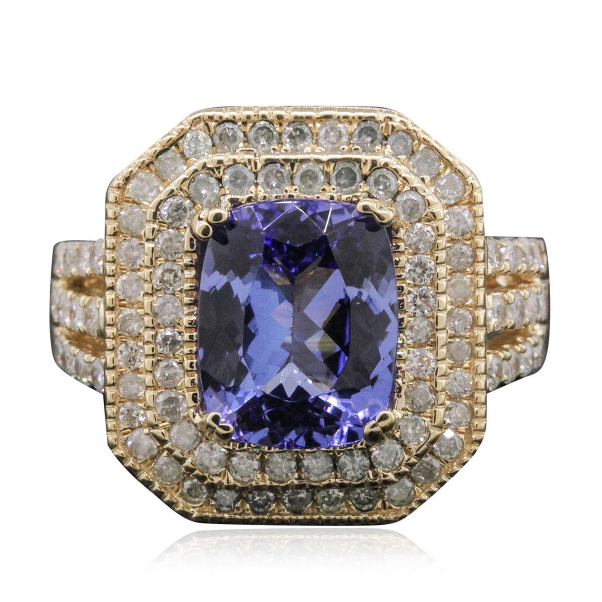 One electronically tested 14KT yellow gold ladies combination cast & assembled tanzanite and diamond ring with a split shank with a bright polish finish. Identified with markings of "14K". Condition is new. Containing: One prong set rectangular cushion modified brilliant cut natural tanzanite, measuring 10.52 x 8.11 x 5.24mm, approximate weight of 3.52ct., clarity is eye clean, type I, medium light, very slightly grayish, violet color, (GIA V 4/3), cut is good. Eighty-Six prong set round brilliant cut diamonds, measuring 1.40 - 1.40 x 0.84mm (depth est.) approximate total weight of 86 Stones = 0.86ct. Clarity: I-1 to I-2. Color: I - J, Cut is Good. Colored gemstones are presumed to have been subjected to commonly used enhancement processes. All diamonds and colored gemstones are graded in the mounting, unless otherwise stated. Total Weight of Colored Stones 3.52ct. Total Weight of Diamonds 0.86ct. Total Weight of Ring 7.90 grams. GGL Appraised at $9,070.00.
