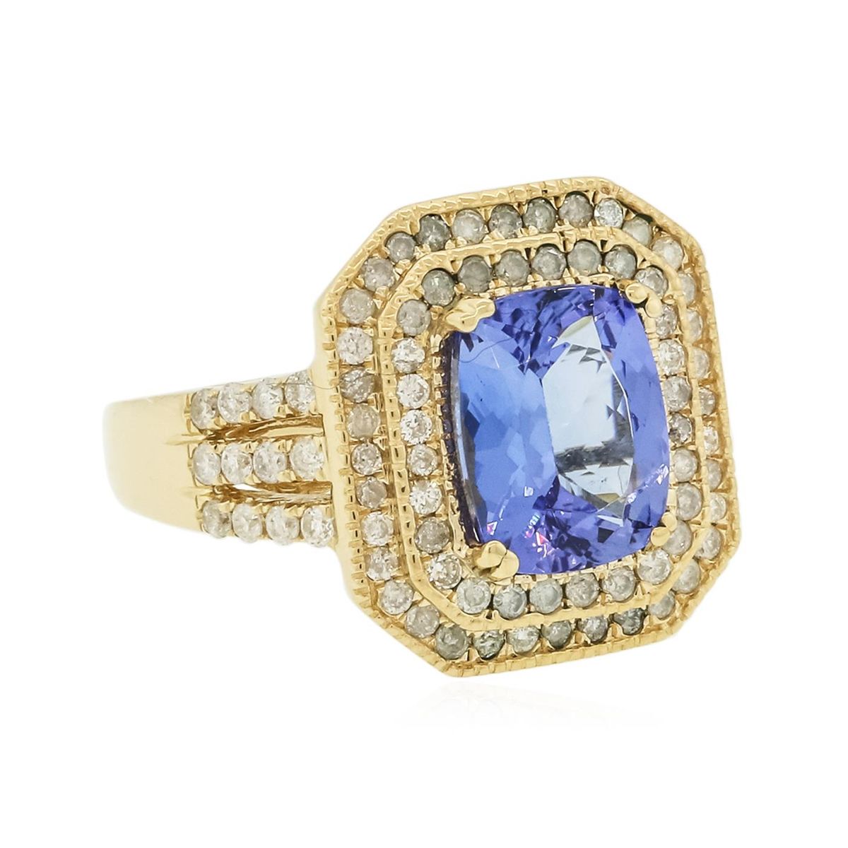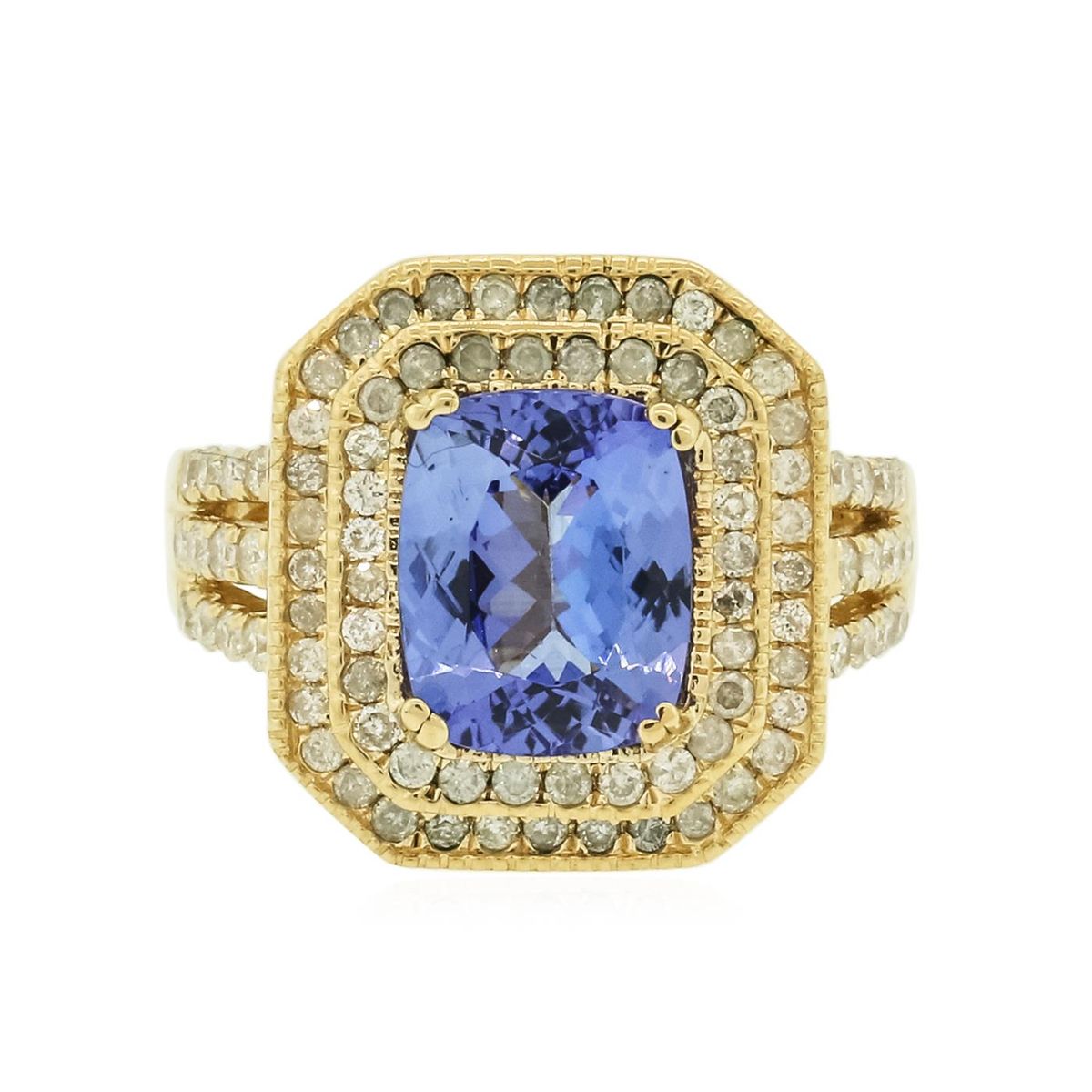 One electronically tested 14KT yellow gold ladies combination cast & assembled tanzanite and diamond ring with a split shank with a bright polish finish. Identified with markings of "14K". Condition is new. Containing: One prong set rectangular cushion modified brilliant cut natural tanzanite, measuring 10.52 x 8.11 x 5.24mm, approximate weight of 3.52ct., clarity is eye clean, type I, medium light, very slightly grayish, violet color, (GIA V 4/3), cut is good. Eighty-Six prong set round brilliant cut diamonds, measuring 1.40 - 1.40 x 0.84mm (depth est.) approximate total weight of 86 Stones = 0.86ct. Clarity: I-1 to I-2. Color: I - J, Cut is Good. Colored gemstones are presumed to have been subjected to commonly used enhancement processes. All diamonds and colored gemstones are graded in the mounting, unless otherwise stated. Total Weight of Colored Stones 3.52ct. Total Weight of Diamonds 0.86ct. Total Weight of Ring 7.90 grams. GGL Appraised at $9,070.00.