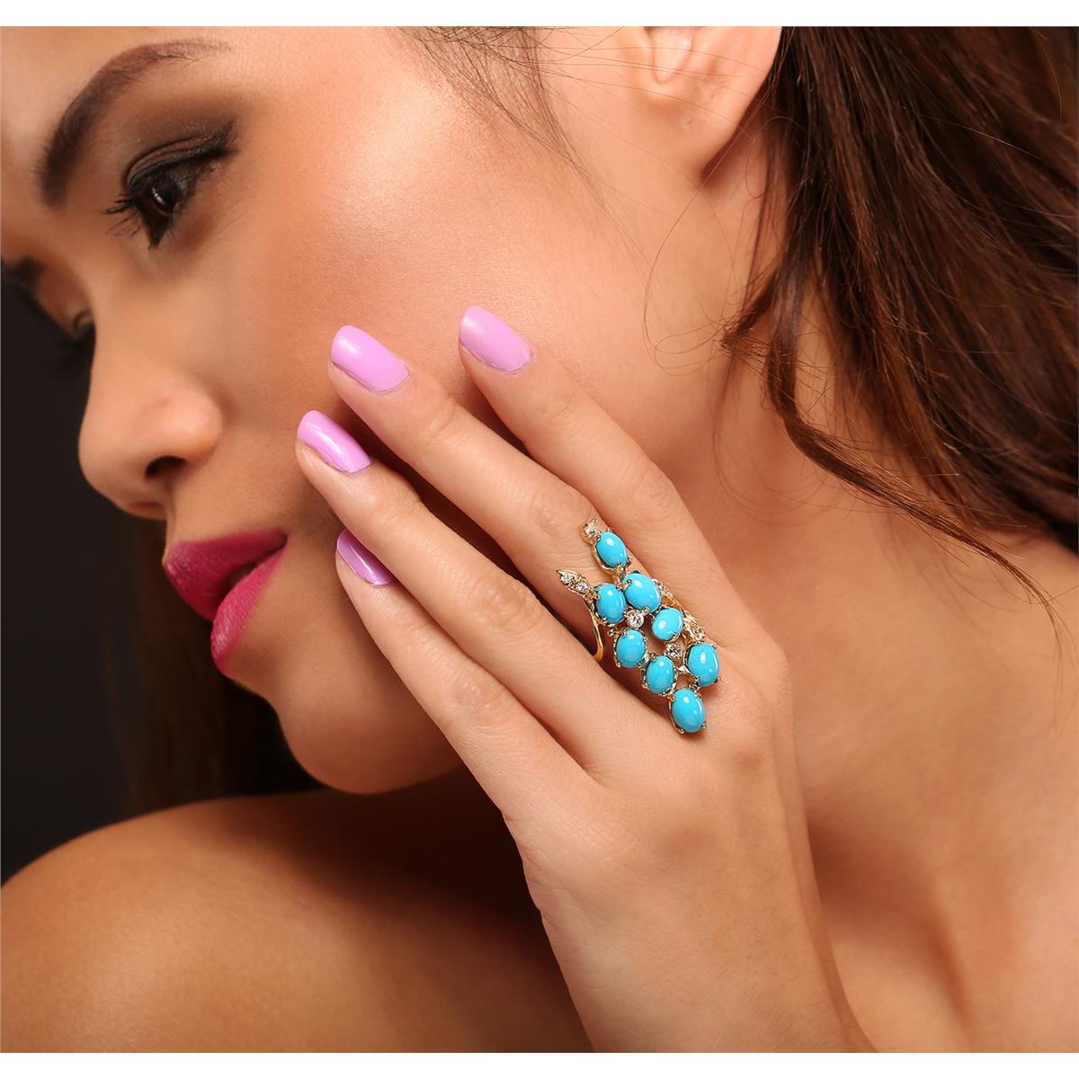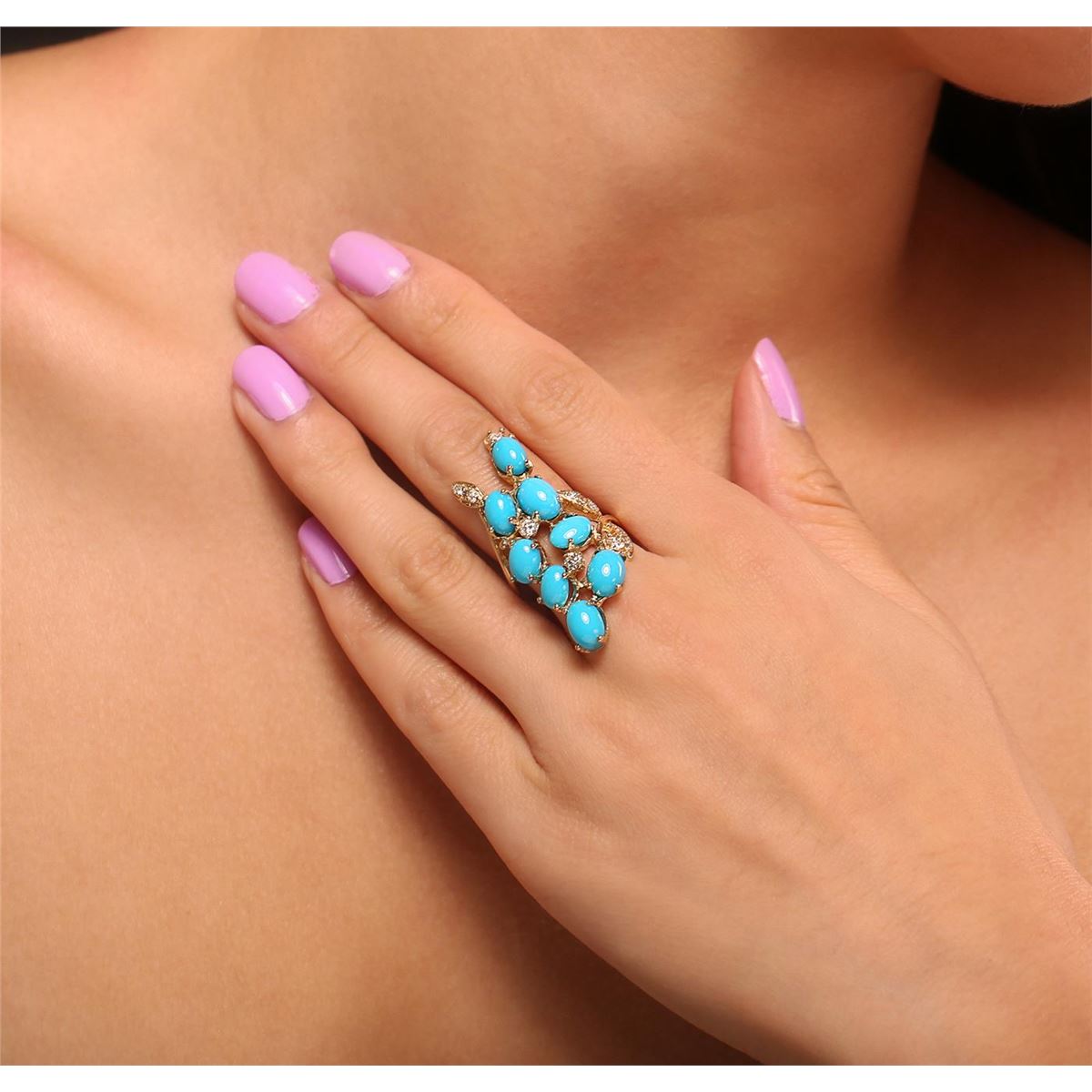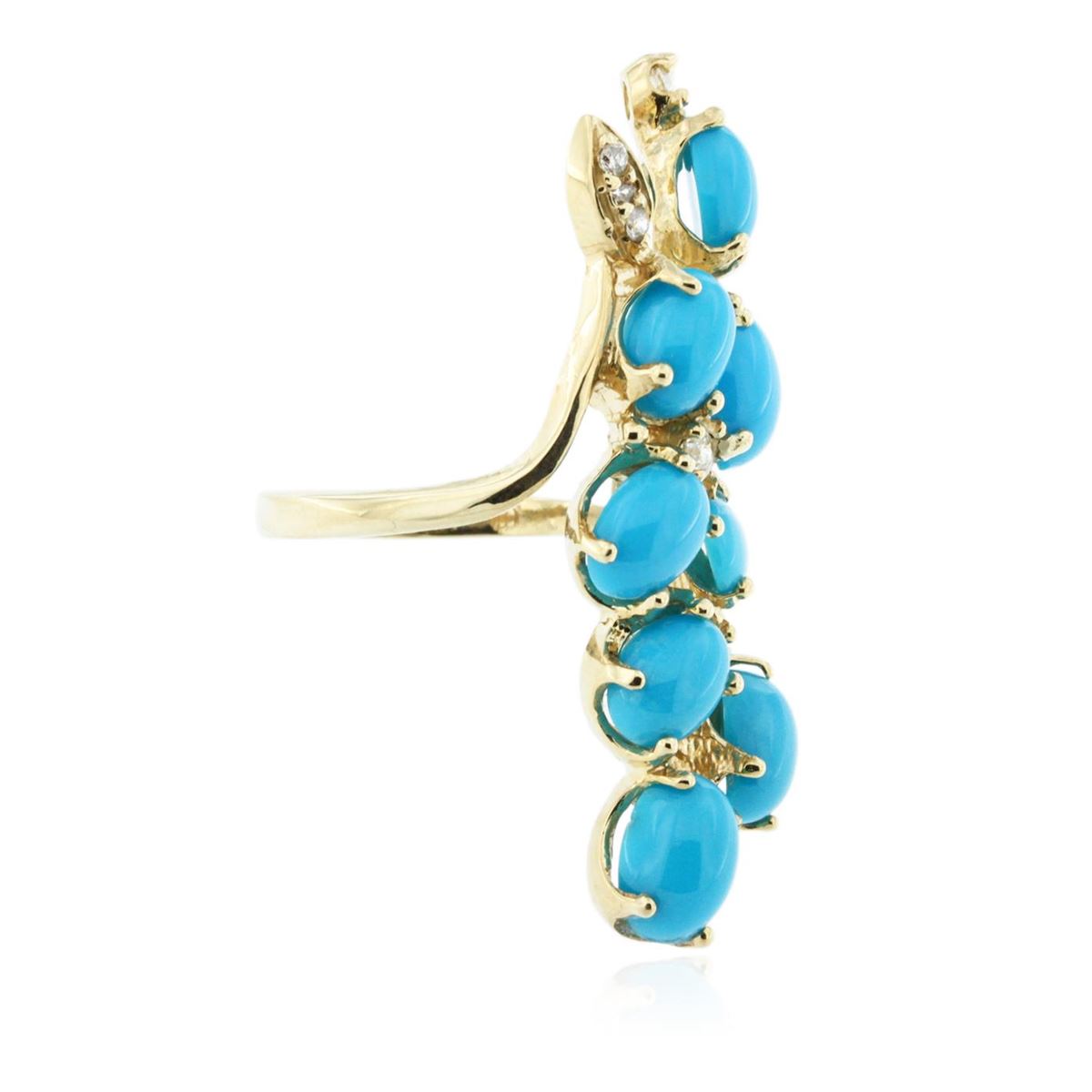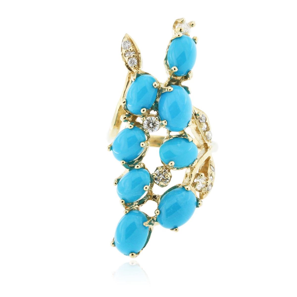 One electronically tested 14KT yellow gold Ladies combination cast & assembled cocktail ring with a bright polish finish. Condition is new. Identified with markings of "14K". Containing: Eight prong set oval cabochon standard cut natural turquoises, measuring 5.50 x 3.50 x 3.10mm, approximate total weight of 3.52ct., clarity is heavily included, medium, moderately strong, blue color, (GIA B 5/4), cut is good. Nine prong set round brilliant cut diamonds, measuring 1.60 - 1.50 x 0.93mm (depth est.) approximate total weight of 9 Stones = 0.12ct. Clarity of SI-2 to I-1, Color of I - J, Cut is Good. Four prong set round brilliant cut diamonds, measuring 3.00 - 3.00 x 1.80mm (depth est.) approximate total weight of 4 Stones = 0.40ct. Clarity of SI-1 to SI-2, Color of J - K, Cut is Good. Total Weight of Colored Stones 3.52ct. Total Weight of Diamonds 0.52ct. Total Weight of Ring 8.20gm. GGL Appraised at $4,110.00.