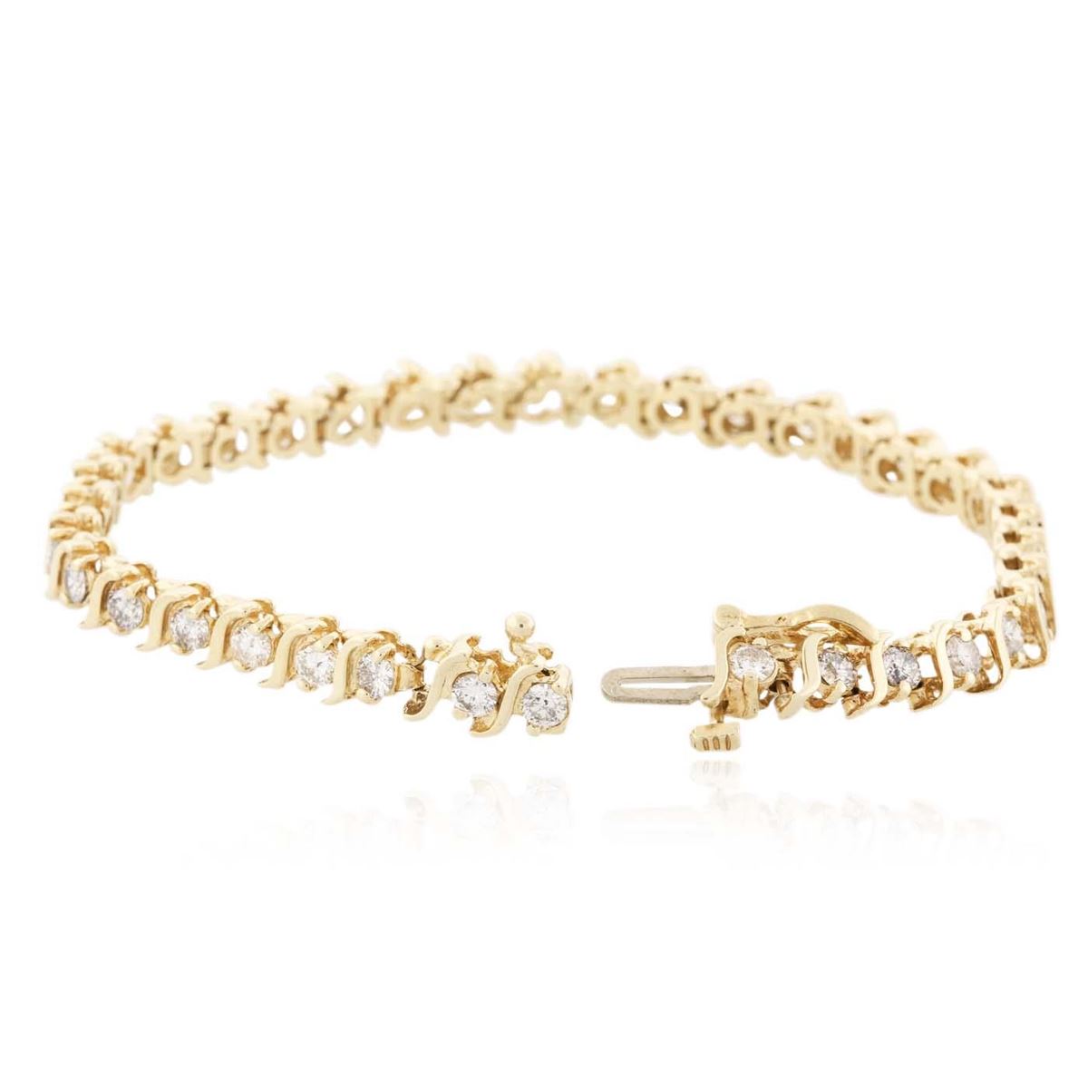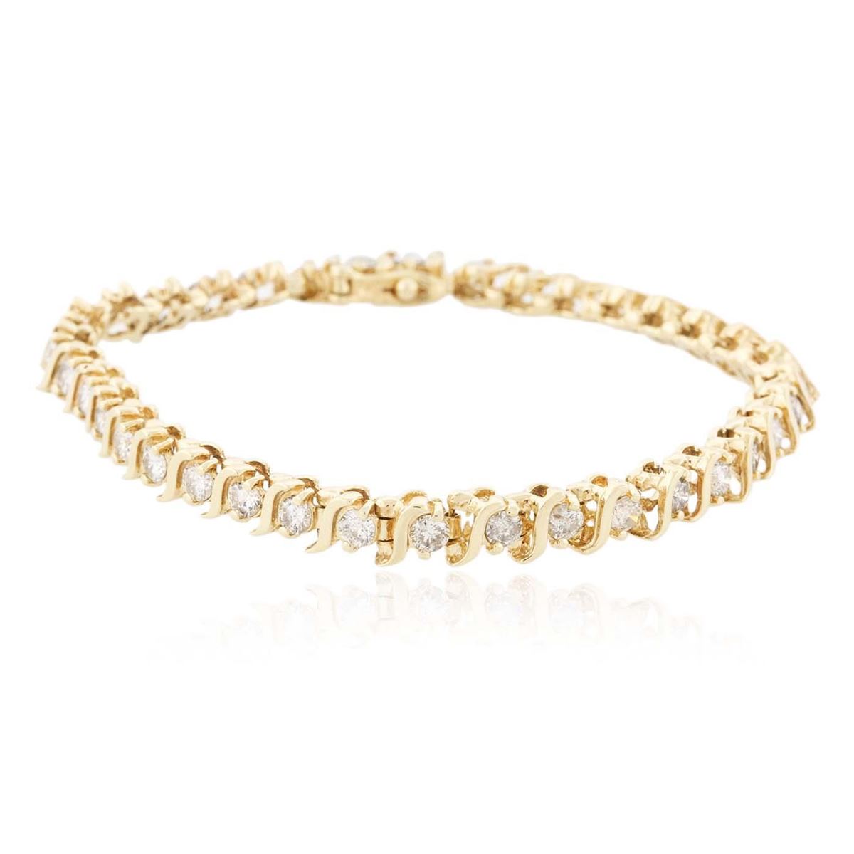 One electronically tested 14KT yellow gold ladies combination cast & assembled tennis bracelet with a hidden box clasp with a bright polish finish. Condition is very good. Measurements: 6.75" in length. Identified with markings of "14K". Containing: Thirty-Six prong set round brilliant cut diamonds, measuring 3.00 - 3.00 x 1.80mm (depth est.) approximate. Total Weight of 36 Stones = 3.56ct. Clarity: SI-2 to I-2. Color: I - K, Cut is Good. All diamonds are graded in the mounting, unless otherwise stated. Total Weight of Diamonds 3.56ct. Total Weight of Bracelet 13.90 grams. GGL Appraised at $11,210.00.