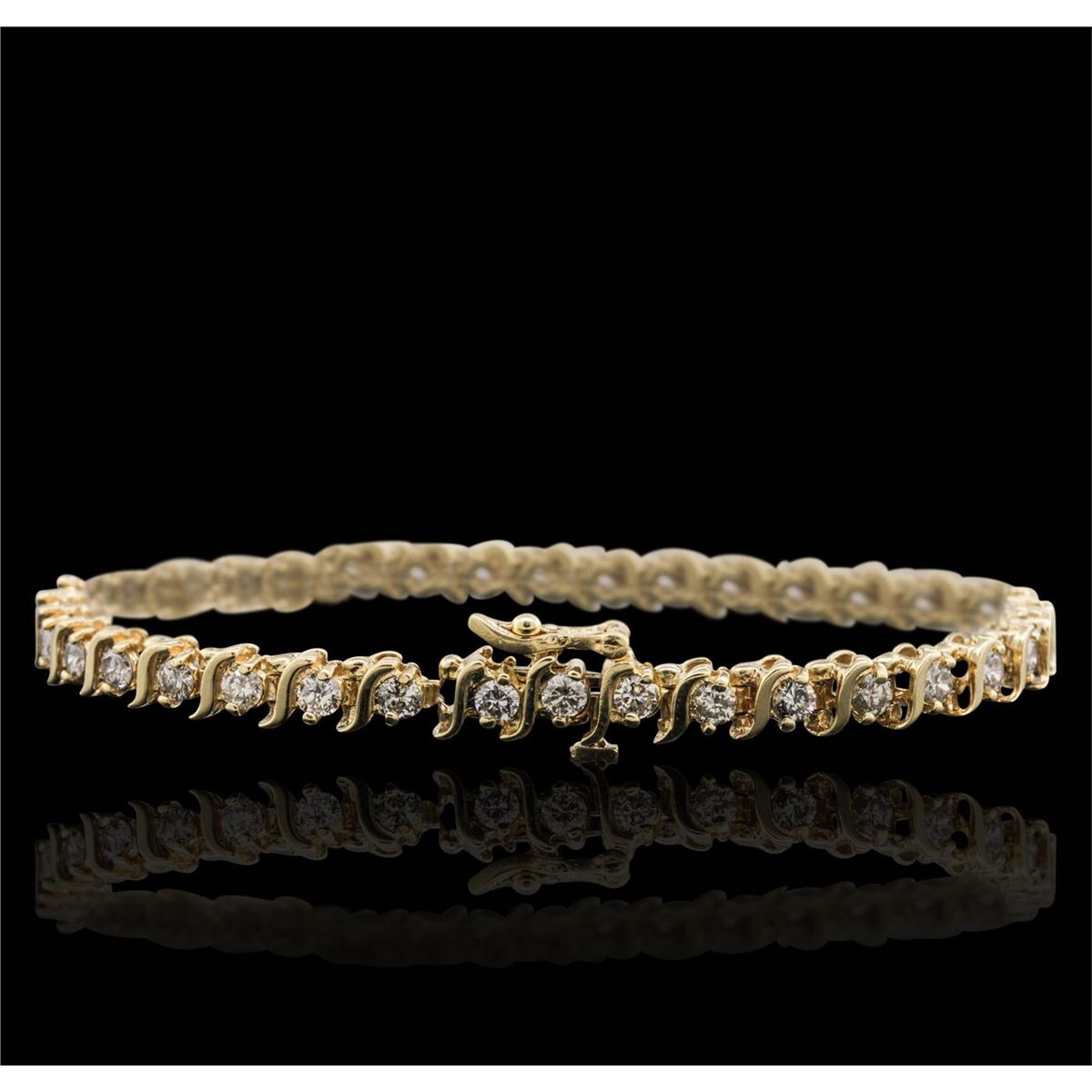 One electronically tested 14KT yellow gold ladies combination cast & assembled tennis bracelet with a hidden box clasp with a bright polish finish. Condition is very good. Measurements: 6.75" in length. Identified with markings of "14K". Containing: Thirty-Six prong set round brilliant cut diamonds, measuring 3.00 - 3.00 x 1.80mm (depth est.) approximate. Total Weight of 36 Stones = 3.56ct. Clarity: SI-2 to I-2. Color: I - K, Cut is Good. All diamonds are graded in the mounting, unless otherwise stated. Total Weight of Diamonds 3.56ct. Total Weight of Bracelet 13.90 grams. GGL Appraised at $11,210.00.