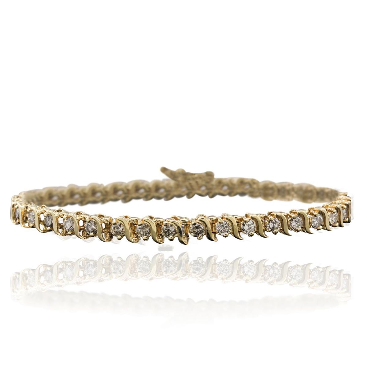 One electronically tested 14KT yellow gold ladies combination cast & assembled tennis bracelet with a hidden box clasp with a bright polish finish. Condition is very good. Measurements: 6.75" in length. Identified with markings of "14K". Containing: Thirty-Six prong set round brilliant cut diamonds, measuring 3.00 - 3.00 x 1.80mm (depth est.) approximate. Total Weight of 36 Stones = 3.56ct. Clarity: SI-2 to I-2. Color: I - K, Cut is Good. All diamonds are graded in the mounting, unless otherwise stated. Total Weight of Diamonds 3.56ct. Total Weight of Bracelet 13.90 grams. GGL Appraised at $11,210.00.