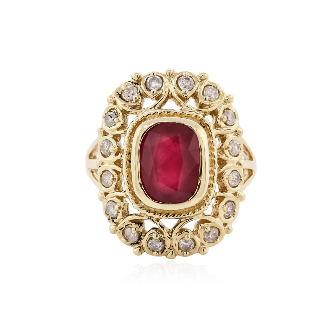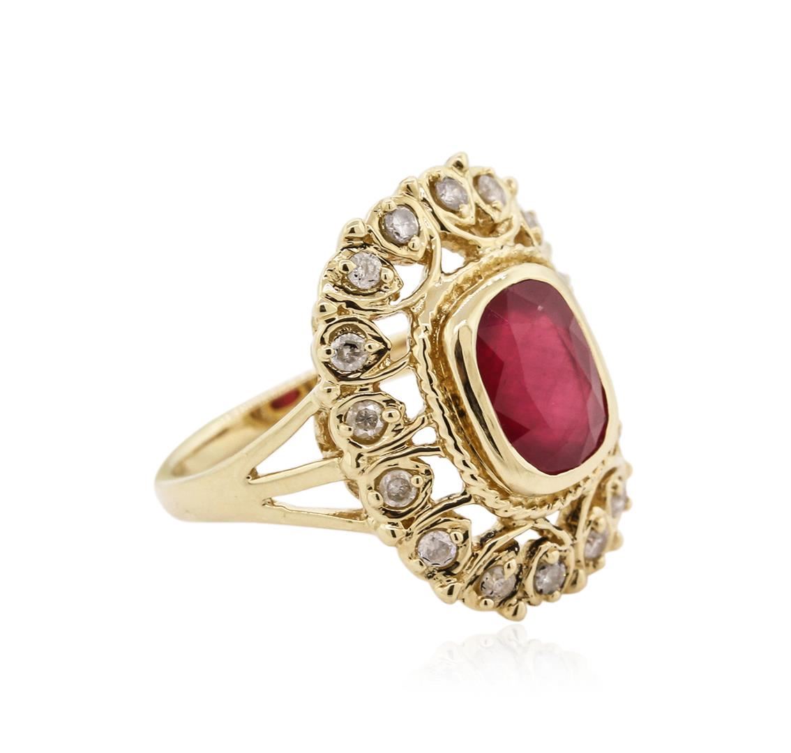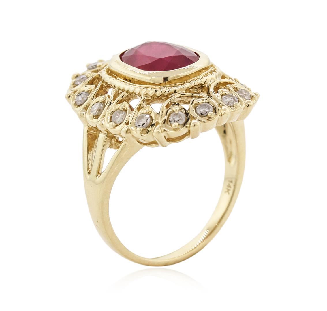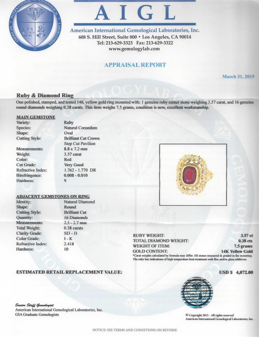 One polished, stamped, and tested 14K yellow gold ring mounted with: 1 genuine ruby center stone weighing 3.57 carat, and 16 genuine round diamonds weighing 0.38 carats. This item weighs 7.5 grams, condition is new, excellent workmanship. MAIN GEMSTONE: Variety: Ruby. Species: Natural Corundum. Shape: Oval. Cutting Style: Brilliant Cut Crown Step Cut Pavilion. Measurements: 8.8 x 7.2 mm. Weight: 3.57 carat. Color: Red. Cut Grade: Very Good. Refractive Index: 1.762 - 1.770 DR. Birefringence: 0.008 - 0.010. Hardness: 9. ADJACENT GEMSTONES ON RING: Identity: Natural Diamond. Shape: Round. Cutting Style: Brilliant Cut. Quantity: 16 Diamonds. Measurements: 2.5 - 2.7 mm. Total Weight: 0.38 carats. Clarity Grade: SI3 - I1. Color Grade: I - K. Refractive Index: 2.418. Hardness: 10. Ruby Weight: 3.57 ct. Total Diamond Weight: 0.38 cts. Weight of Item: 7.5 grams. Gold Content: 14K Yellow Gold. AIGL Appraised at $4,072.00.