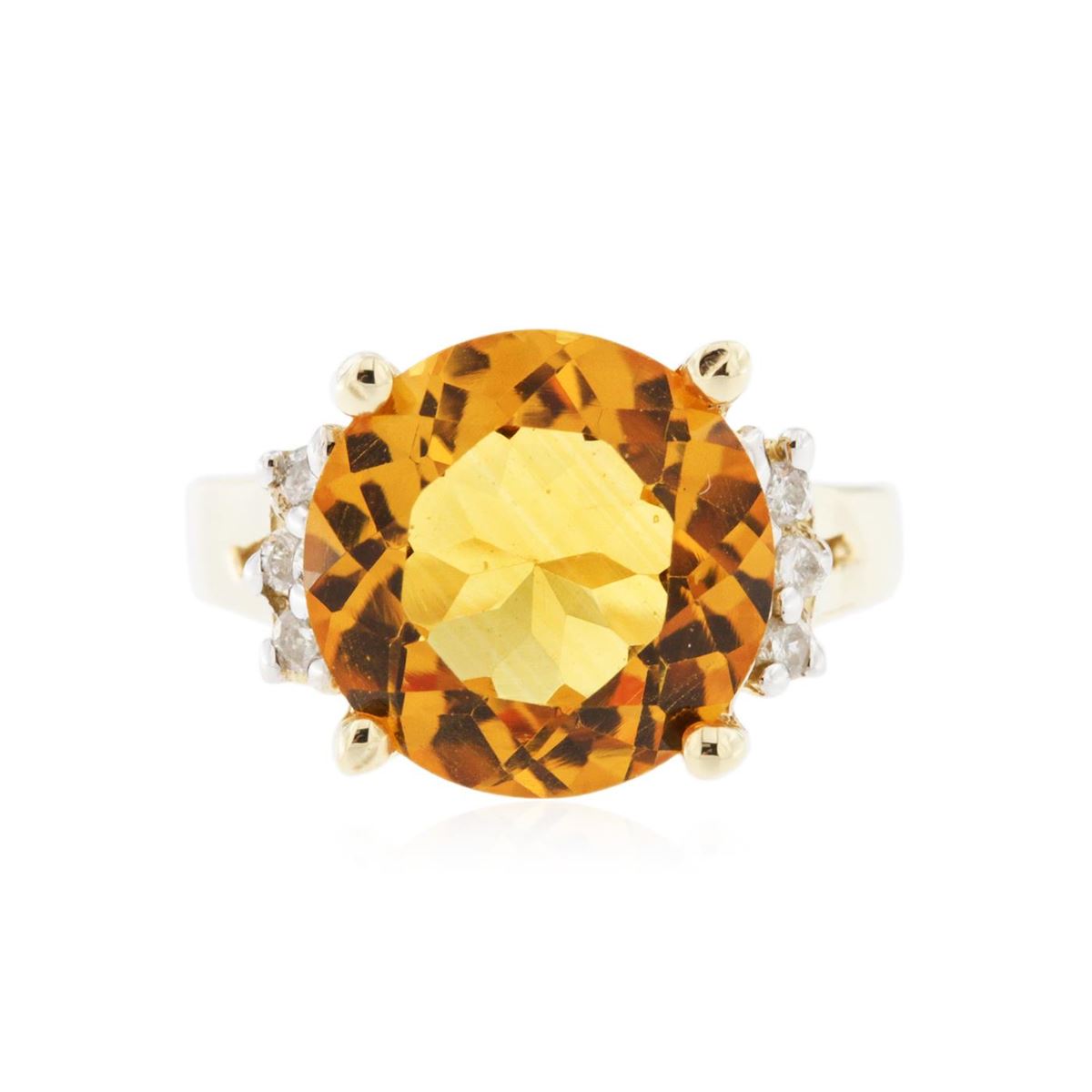 One polished, stamped, and electronically tested solid 14K yellow gold ring mounted with: 1 genuine citrine center stone weighing 3.58 carats and 6 genuine round full cut diamonds weighing 0.15 carats. This item weighs 7.6 grams, condition is new, very good workmanship. AIGL Appraised at $2,900.00.