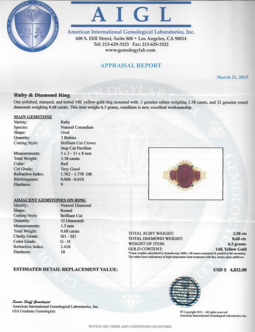 One polished, stamped, and tested 14K yellow gold ring mounted with: 3 genuine rubies weighing 3.58 carats, and 32 genuine round diamonds weighing 0.68 carats. This item weighs 6.5 grams, condition is new, excellent workmanship. MAIN GEMSTONE: Variety: Ruby. Species: Natural Corundum. Shape: Oval. Quantity: 3 Rubies. Cutting Style: Brilliant Cut Crown Step Cut Pavilion. Measurements: 5 x 3 - 11 x 8 mm. Total Weight: 3.58 carats. Color: Red. Cut Grade: Very Good. Refractive Index: 1.762 - 1.770 DR. Birefringence: 0.008 - 0.010. Hardness: 9. ADJACENT GEMSTONES ON RING: Identity: Natural Diamond. Shape: Round. Cutting Style: Brilliant Cut. Quantity: 32 Diamonds. Measurements: 1.5 mm. Total Weight: 0.68 carats. Clarity Grade: SI1 - SI3. Color Grade: G - H. Refractive Index: 2.418. Hardness: 10. Total Ruby Weight: 3.58 cts. Total Diamond Weight: 0.68 cts. Weight of Item: 6.5 grams. Gold Content: 14K Yellow Gold. AIGL Appraised at $4,832.00.