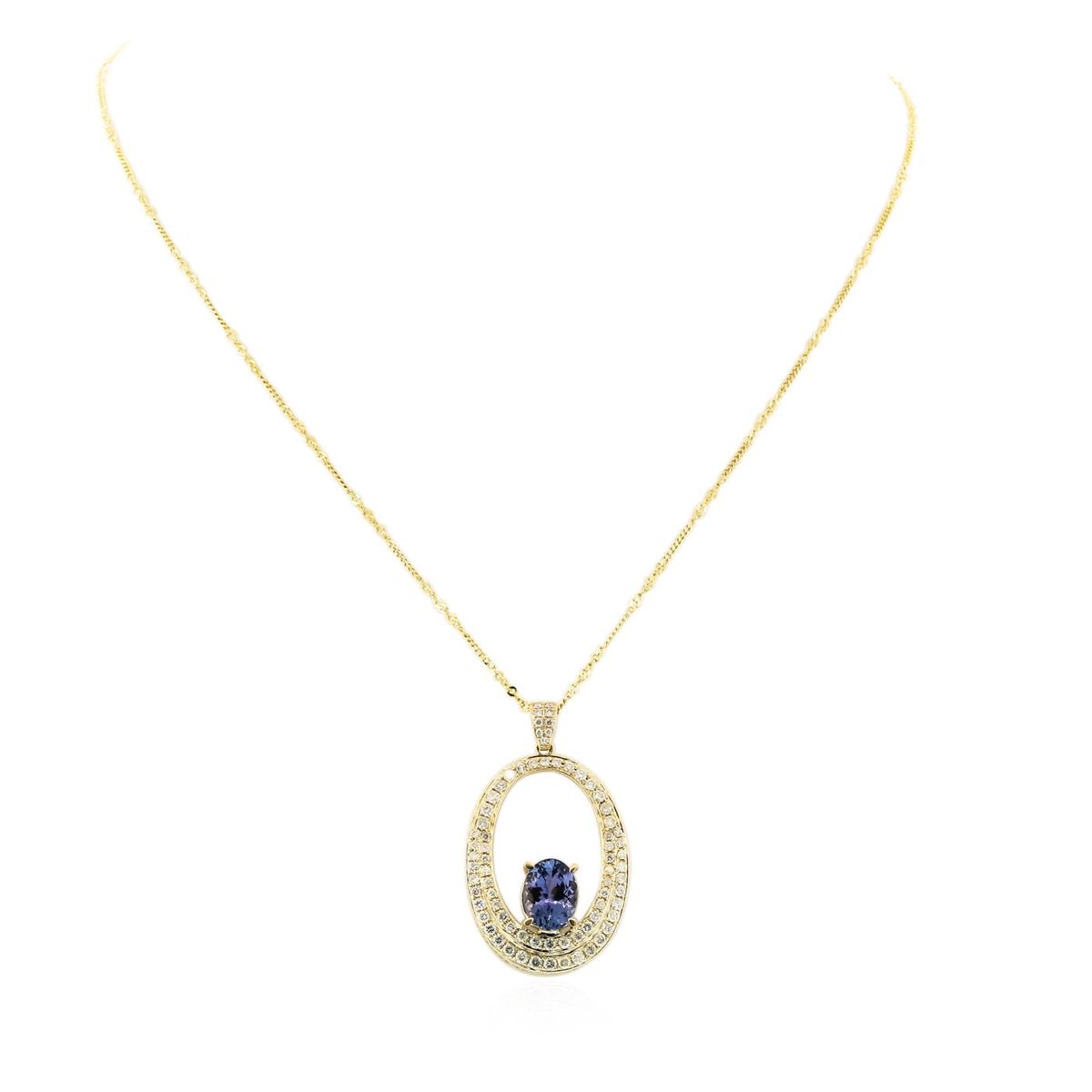 One electronically tested 14KT yellow gold ladies cast & assembled tanzanite and diamond pendant with chain. The pendant features a tanzanite set within a stylized diamond frame, completed by a diamond set bail. The pendant is supported by an eighteen inch length 14KT yellow gold designer style chain, terminating in a spring ring clasp. Bright polish finish. Trademark is Orianne. Identified with markings of "14K". Condition is new, good workmanship. Containing: One prong set oval brilliant cut natural tanzanite, measuring 11.00 x 8.20 x 5.50mm, 6% bulge factor, approximate weight of 3.60ct., clarity is eye clean, type I, medium dark, very slightly grayish, bluish violet color, (GIA bV 6/3), cut is good. Transmitting light with no distortion, transparent. Graded in the setting. Tanzanite is a very rare gemstone that is only found in the country of Tanzania. Originally discovered in 1967. Tiffany & Company, named the stone Tanzanite. It is found in the Usumburu Mountains that border the Umba Valley of northern Tanzania. Tanzanite occurs in gray, brown, violet, blue, reddish-purple, & green. The gem is interesting because of its exceptional pleochroism. Rotated in different directions a tanzanite will exhibit multiple changes of color. Tanzanite has a low tolerance to ultrasonic cleaning, and should not be cleaned using this method. Seventy-Four prong set round brilliant cut diamonds approximate total weight of 74 Stones = 3.38ct. Graded in the setting. Clarity: SI-2 to I-1. Color: G - I. Total Weight of Colored Stones 3.60ct. Total Weight of Diamonds 3.38ct. Total Weight of Pendant With Chain 9.00 grams. AIG Appraised at $20,305.00.
