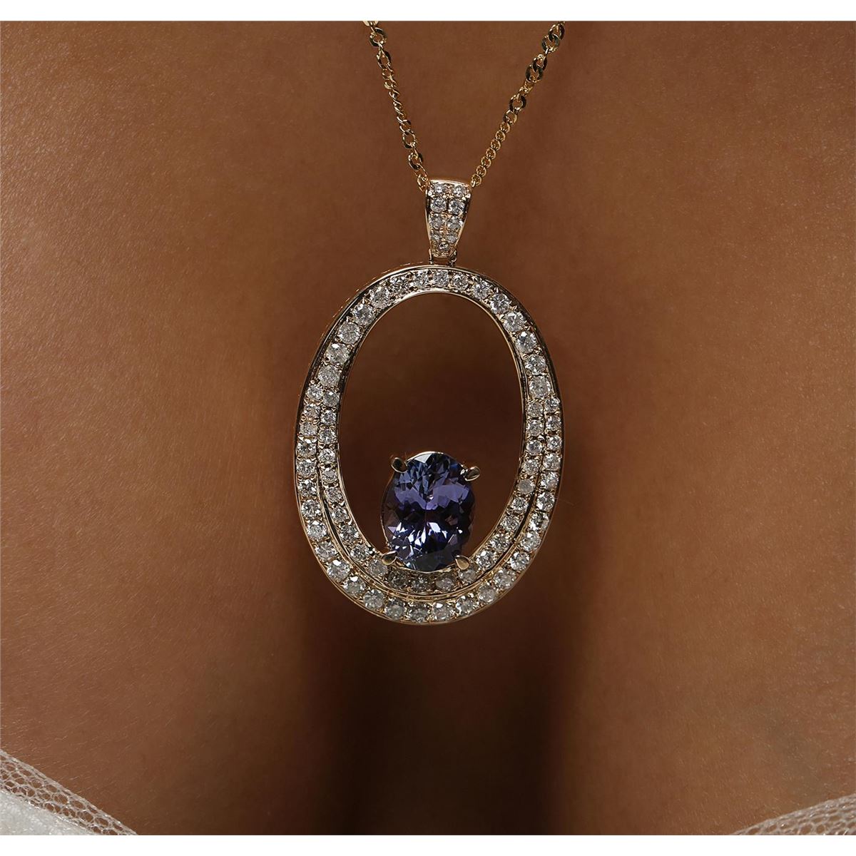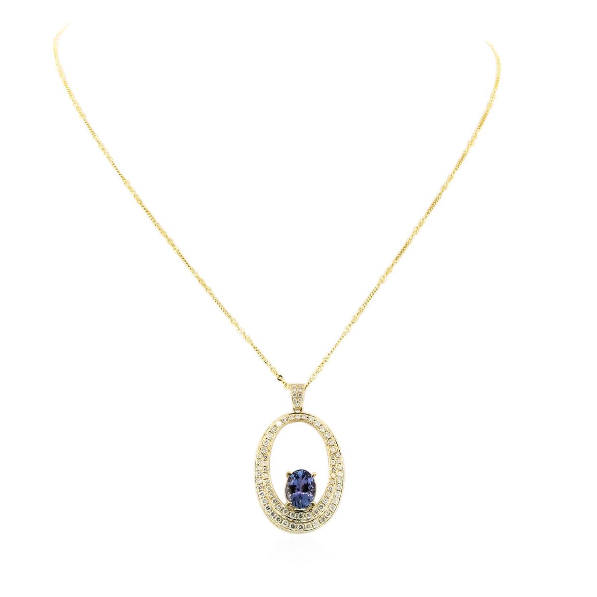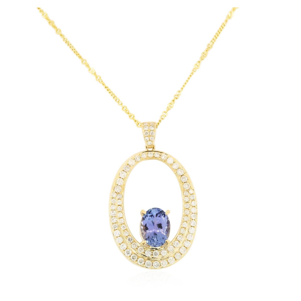 One electronically tested 14KT yellow gold ladies cast & assembled tanzanite and diamond pendant with chain. The pendant features a tanzanite set within a stylized diamond frame, completed by a diamond set bail. The pendant is supported by an eighteen inch length 14KT yellow gold designer style chain, terminating in a spring ring clasp. Bright polish finish. Trademark is Orianne. Identified with markings of "14K". Condition is new, good workmanship. Containing: One prong set oval brilliant cut natural tanzanite, measuring 11.00 x 8.20 x 5.50mm, 6% bulge factor, approximate weight of 3.60ct., clarity is eye clean, type I, medium dark, very slightly grayish, bluish violet color, (GIA bV 6/3), cut is good. Transmitting light with no distortion, transparent. Graded in the setting. Tanzanite is a very rare gemstone that is only found in the country of Tanzania. Originally discovered in 1967. Tiffany & Company, named the stone Tanzanite. It is found in the Usumburu Mountains that border the Umba Valley of northern Tanzania. Tanzanite occurs in gray, brown, violet, blue, reddish-purple, & green. The gem is interesting because of its exceptional pleochroism. Rotated in different directions a tanzanite will exhibit multiple changes of color. Tanzanite has a low tolerance to ultrasonic cleaning, and should not be cleaned using this method. Seventy-Four prong set round brilliant cut diamonds approximate total weight of 74 Stones = 3.38ct. Graded in the setting. Clarity: SI-2 to I-1. Color: G - I. Total Weight of Colored Stones 3.60ct. Total Weight of Diamonds 3.38ct. Total Weight of Pendant With Chain 9.00 grams. AIG Appraised at $20,305.00.