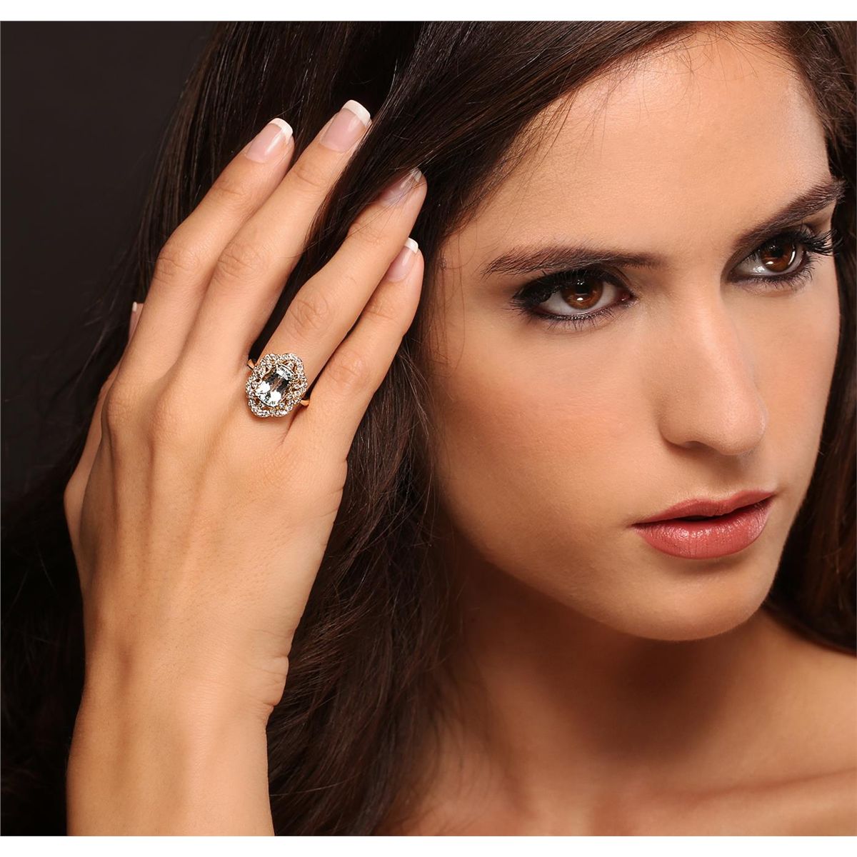 One electronically tested 14KT yellow gold ladies cast aquamarine and diamond ring with a bright polish finish. Condition is new, good workmanship. The featured aquamarine is set within a diamond floral bezel, completed by a two millimeter wide band. Identified with markings of "K14". Containing: One prong set rectangular cushion mixed cut natural aquamarine, measuring 11.00 x 8.25 x 5.80mm, 8%. bulge factor, approximate weight of 3.63ct., clarity is eye clean, type I, medium light, very slightly grayish, very slightly greenish blue color, (GIA vslgB 4/3), cut is good. Transmitting light with no distortion, transparent. Refractive index testing results of 1.56 to 1.57. This is a conclusive result for Aquamarine (Beryl). Graded in the setting. Thirty-Eight prong set round brilliant cut diamonds, measuring 1.80 - 1.60 x 1.02mm (depth est.) approximate. Total Weight of 38 Stones = 0.78ct. Graded in the setting. Clarity: SI-2 to I-2. Color: H - J. Total Weight of Colored Stones 3.63ct. Total Weight of Diamonds 0.78ct. Total Weight of Ring 6.10 grams. AIG Appraised at $4,555.00.