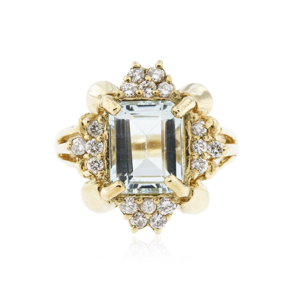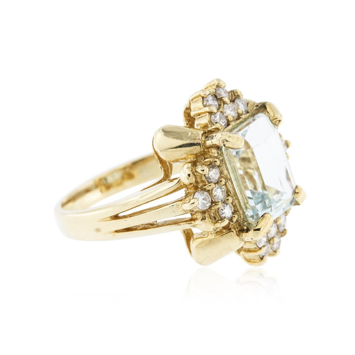 One electronically tested 14KT yellow gold ladies cast aquamarine & diamond ring with a bright polish finish. Condition is new, good workmanship. The featured aquamarine is set within a diamond bezel completed by a three millimeter wide band. Identified with markings of "K14". Containing: One prong set rectangular step cut natural aquamarine, measuring 9.80 x 7.80 x 5.35mm, 10%. bulge factor, approximate weight of 3.67ct., clarity is eye clean, type I, light, very slightly grayish, very slightly greenish blue color, (GIA vslgB 3/3), cut is good. Transmitting light with no distortion, transparent. Refractive index testing results of 1.55 to 1.56. This is a conclusive result for (beryl) aquamarine. Graded in the setting. Eighteen prong set round brilliant cut diamonds, measuring 1.90 - 1.80 x 1.13mm (depth est.) approximate. Total Weight of 18 Stones = 0.53ct. Graded in the setting. Clarity: I-1 to I-2. Color: G - I. Total Weight of Colored Stones 3.67ct. Total Weight of Diamonds 0.53ct. Total Weight of Ring 6.99 grams. AIG Appraised at $3,930.00.
