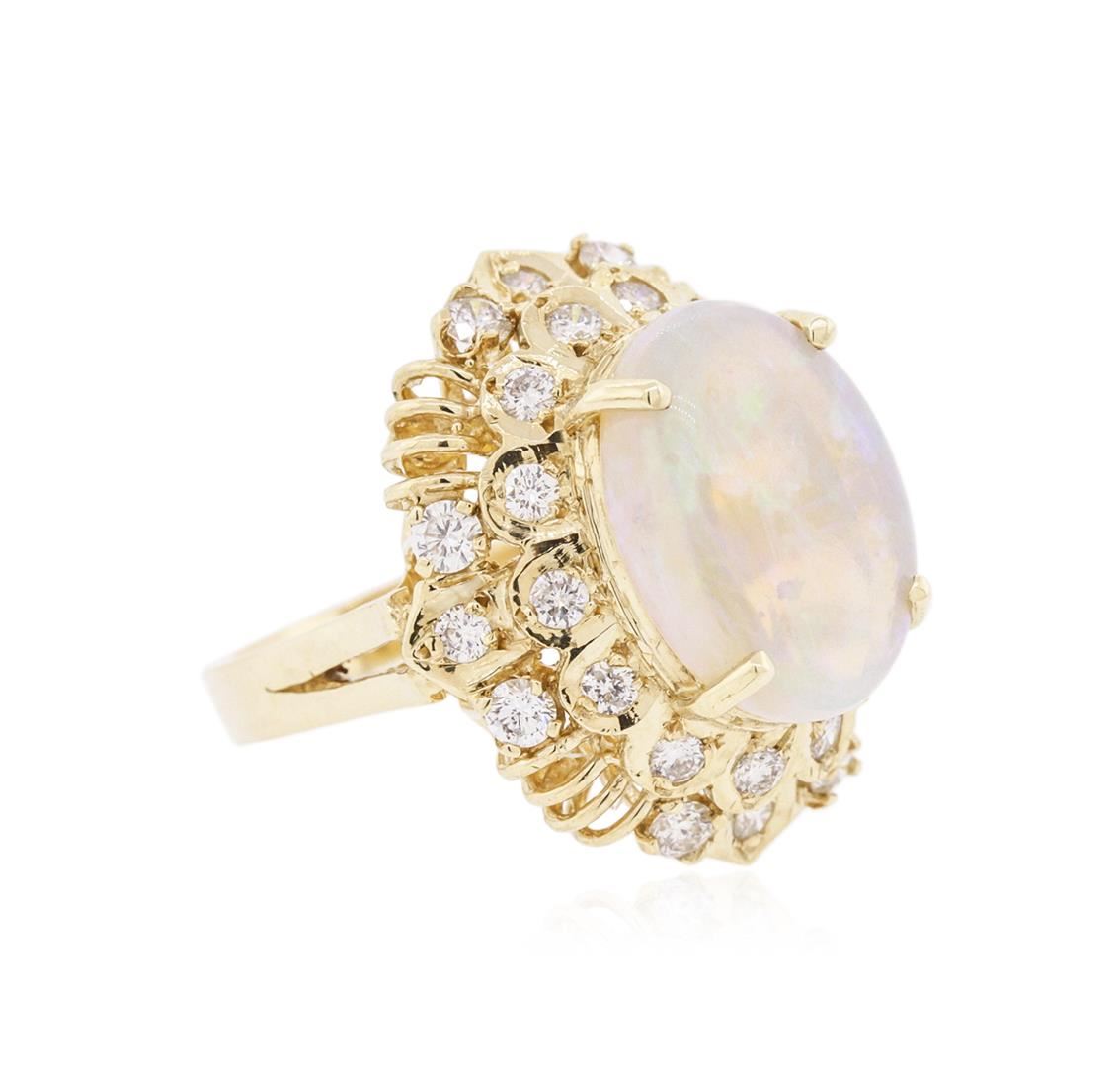 One electronically tested 14KT yellow gold ladies cast opal and diamond ring with a bright polish finish. Identified with markings of "14K". Condition is new. Containing: One white opal that is cut in a oval shape and is prong set, measuring 16.00 mm long x 11.00 mm wide, and 4.70 mm thick and the approximate weight is 3.68 carats. The opal has a somewhat bright, blue-green play of color (fire) in a flashfire pattern; a medium dome; a good cut; no inclusions; consistent in its brightness and pattern; and is somewhat directional. Twenty-Seven prong set round brilliant cut diamonds, measuring 2.80 - 2.00 x 1.44mm (depth est.) approximate total weight of 27 Stones = 1.37ct. Clarity: SI-1 to SI-2. Color: I - J, Cut is Good. Colored gemstones are presumed to have been subjected to commonly used enhancement processes. All diamonds and colored gemstones are graded in the mounting, unless otherwise stated. Total Weight of Diamonds 1.37ct. Total Weight of Opals 3.68ct. Total Weight of Ring 11.40 grams. GGL Appraised at $5,165.00.