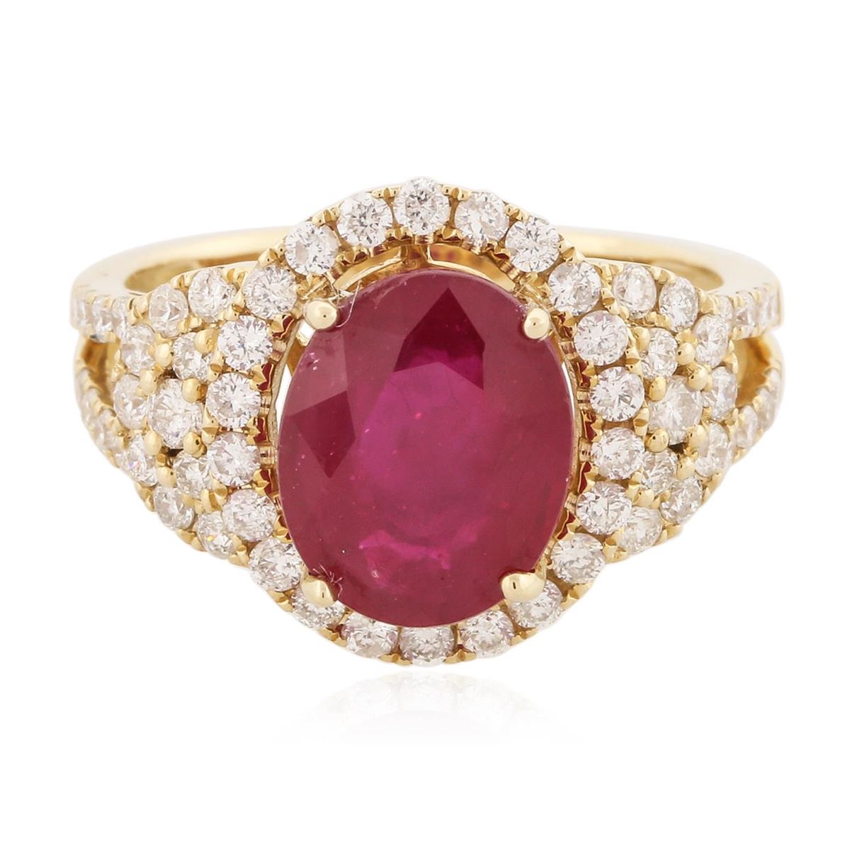 One electronically tested 14KT yellow gold Ladies combination cast & assembled ring with a bright polish finish. Condition is new. Identified with markings of "14K". Containing: One prong set oval modified mixed cut natural ruby, measuring 11.00 x 9.00 x 4.30mm, approximate weight of 3.68ct., clarity is heavily included, type II, medium, moderately strong, slightly purplish red color, (GIA slpR 5/4), cut is good. Colored gemstones are presumed to have been subjected to commonly used color/clarity enhancement processes. Forty-Eight prong set round brilliant cut diamonds, measuring 2.00 - 1.30 x 0.99mm (depth est.) approximate. Total Weight of 48 Stones = 0.79ct. Clarity: I-1 to I-2. Color: H - I, Cut is Good. Total Weight of Colored Stones 3.68ct. Total Weight of Diamonds 0.79ct. Total Weight of Ring 5.20 grams. GGL Appraised at $5,030.00.