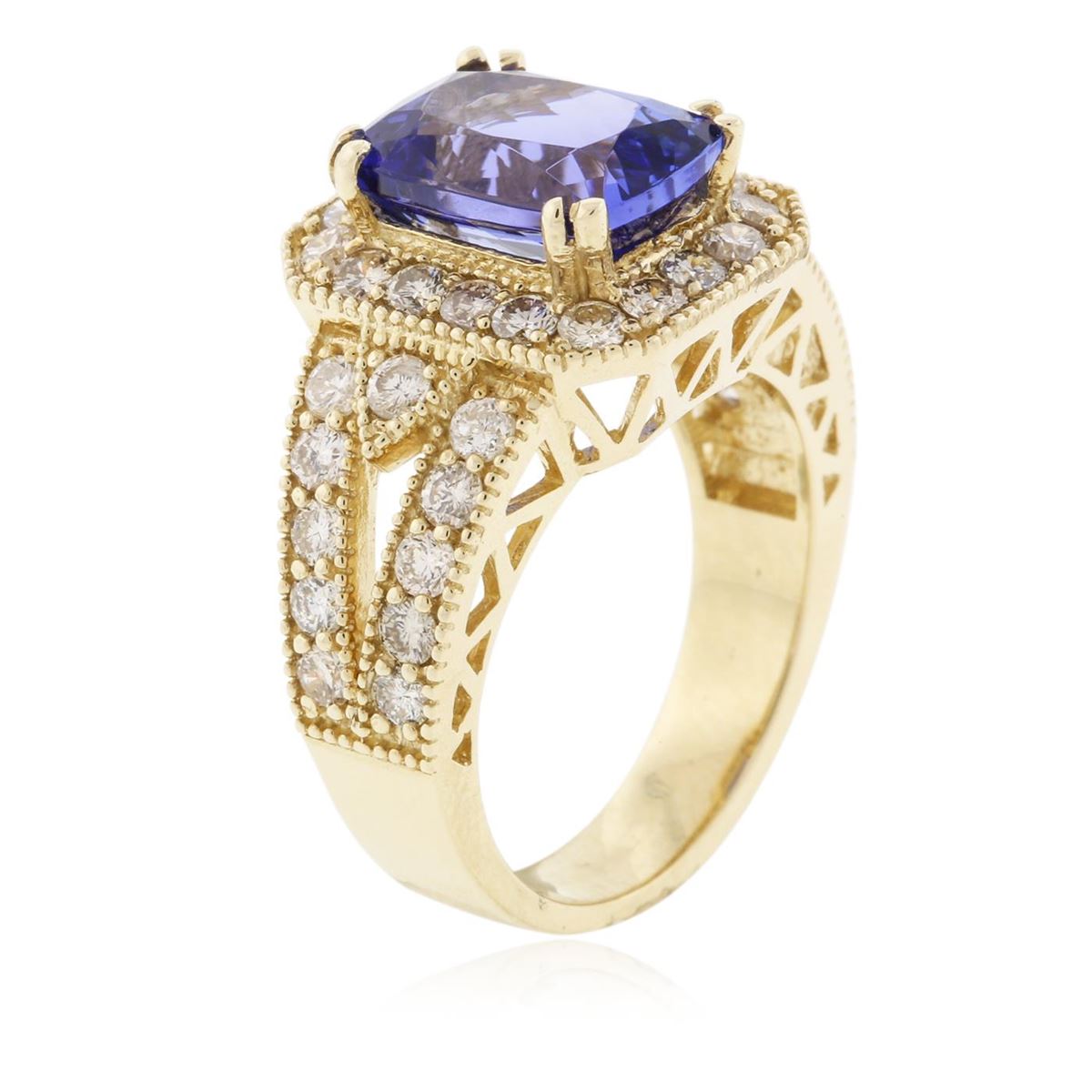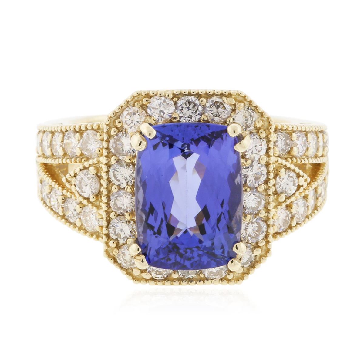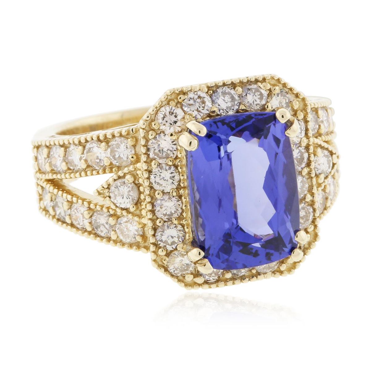 One electronically tested 14KT yellow gold ladies cast tanzanite and diamond ring with a bright and milgrain finish. Condition is new, good workmanship. The featured tanzanite is set within a diamond lattice gallery, supported by diamond set shoulders and completed by a four millimeter wide band. Identified with markings of "K14". Containing: One prong set rectangular cushion mixed cut natural tanzanite, measuring 10.70 x 7.70 x 5.25mm, 8%. bulge factor, approximate weight of 3.68ct., clarity is eye clean, type I, medium dark, very slightly grayish, bluish violet color, (GIA bV 6/3), cut is good. Transmitting light with no distortion, transparent. Graded in the setting. Tanzanite is a very rare gemstone that is only found in the country of Tanzania. Originally discovered in 1967. Tiffany & Company, named the stone Tanzanite. It is found in the Usumburu Mountains that border the Umba Valley of northern Tanzania. Tanzanite occurs in gray, brown, violet, blue, reddish-purple, & green. The gem is interesting because of its exceptional pleochroism. Rotated in different directions a tanzanite will exhibit multiple changes of color. Tanzanite has a low tolerance to ultrasonic cleaning, and should not be cleaned using this method. Forty bead set round brilliant cut diamonds, measuring 2.20 - 2.00 x 1.26mm (depth est.) approximate. Total Weight of 40 Stones = 1.45ct. Graded in the setting. Clarity: SI-1 to I-1. Color: G - I. Total Weight of Colored Stones 3.68ct. Total Weight of Diamonds 1.45ct. Total Weight of Ring 7.90 grams. AIG Appraised at $14,070.00.