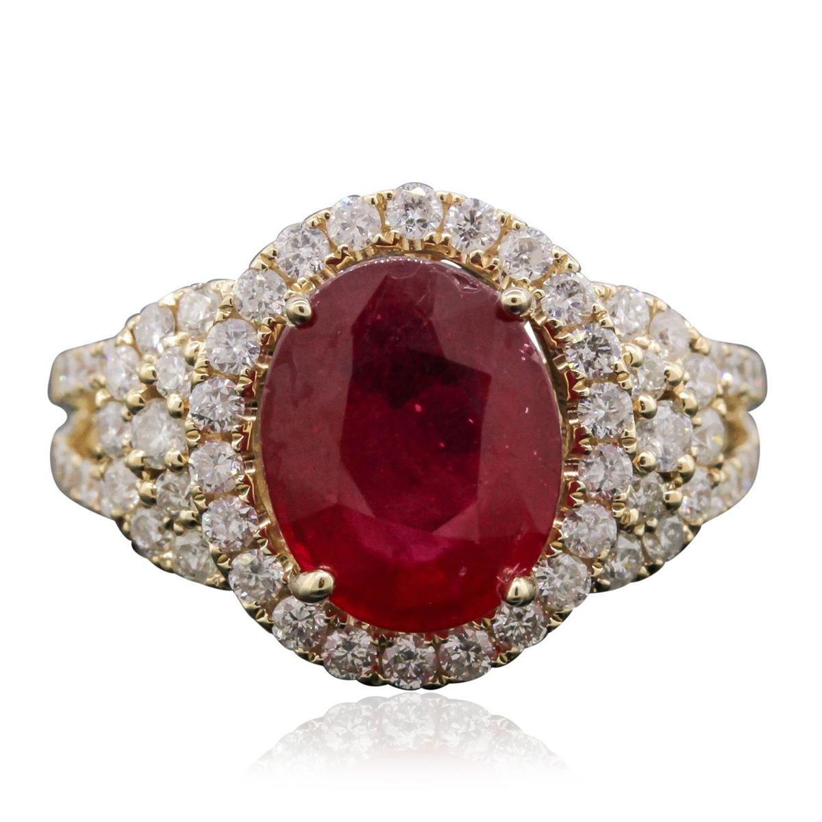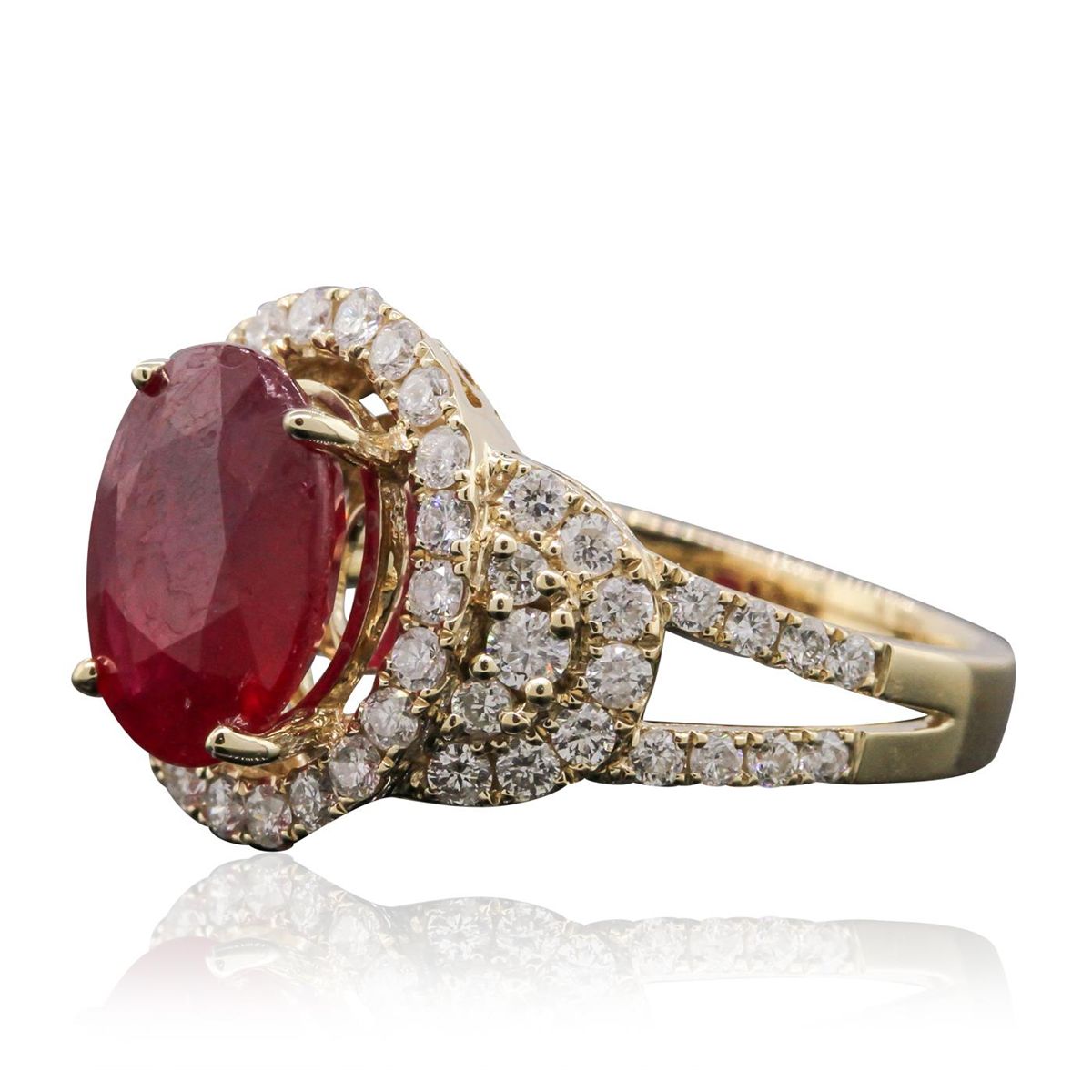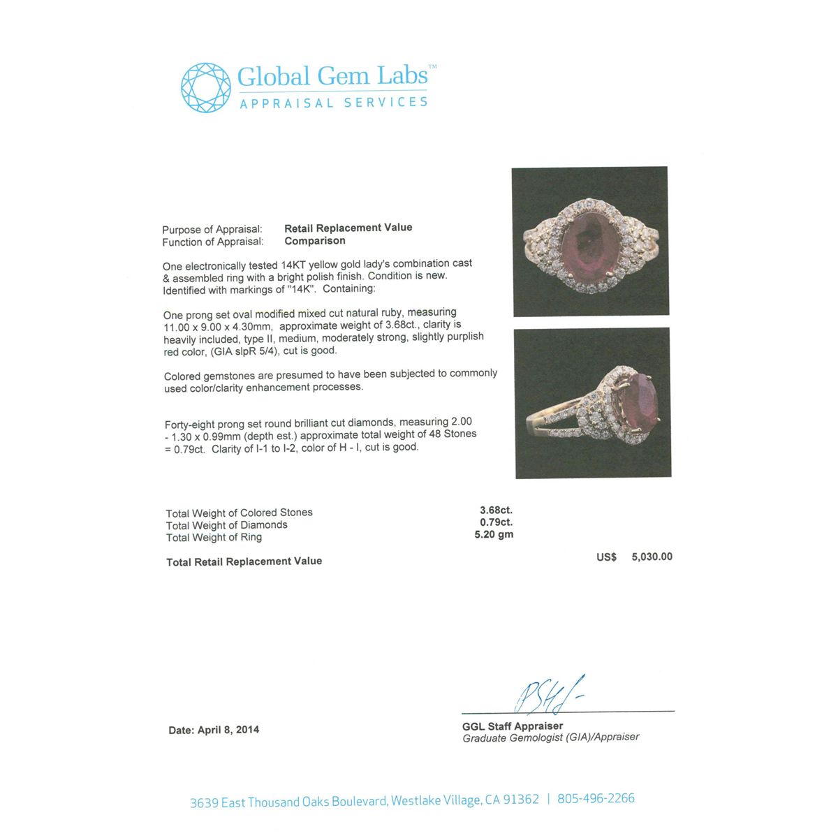 One electronically tested 14KT yellow gold Ladies combination cast & assembled ring with a bright polish finish. Condition is new. Identified with markings of "14K". Containing: One prong set oval modified mixed cut natural ruby, measuring 11.00 x 9.00 x 4.30mm, approximate weight of 3.68ct., clarity is heavily included, type II, medium, moderately strong, slightly purplish red color, (GIA slpR 5/4), cut is good. Colored gemstones are presumed to have been subjected to commonly used color/clarity enhancement processes. Forty-Eight prong set round brilliant cut diamonds, measuring 2.00 - 1.30 x 0.99mm (depth est.) approximate. Total Weight of 48 Stones = 0.79ct. Clarity: I-1 to I-2. Color: H - I, Cut is Good. Total Weight of Colored Stones 3.68ct. Total Weight of Diamonds 0.79ct. Total Weight of Ring 5.20 grams. GGL Appraised at $5,030.00.