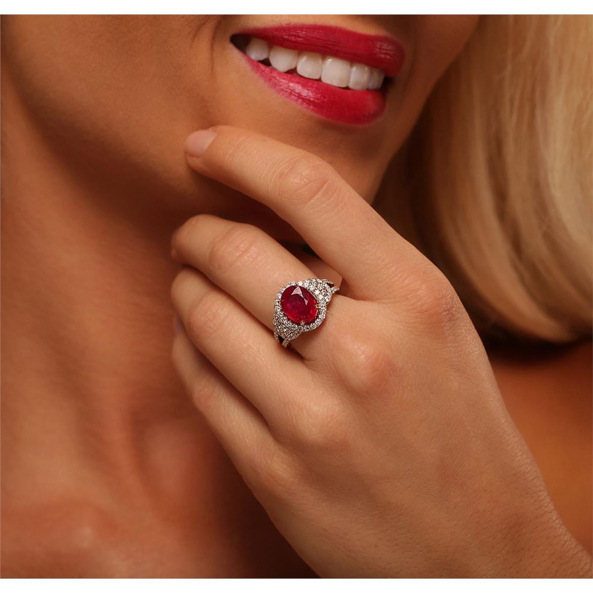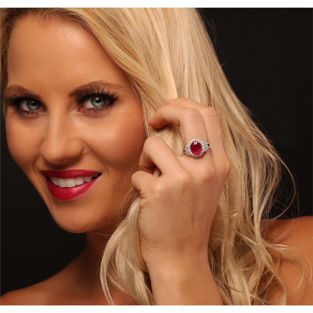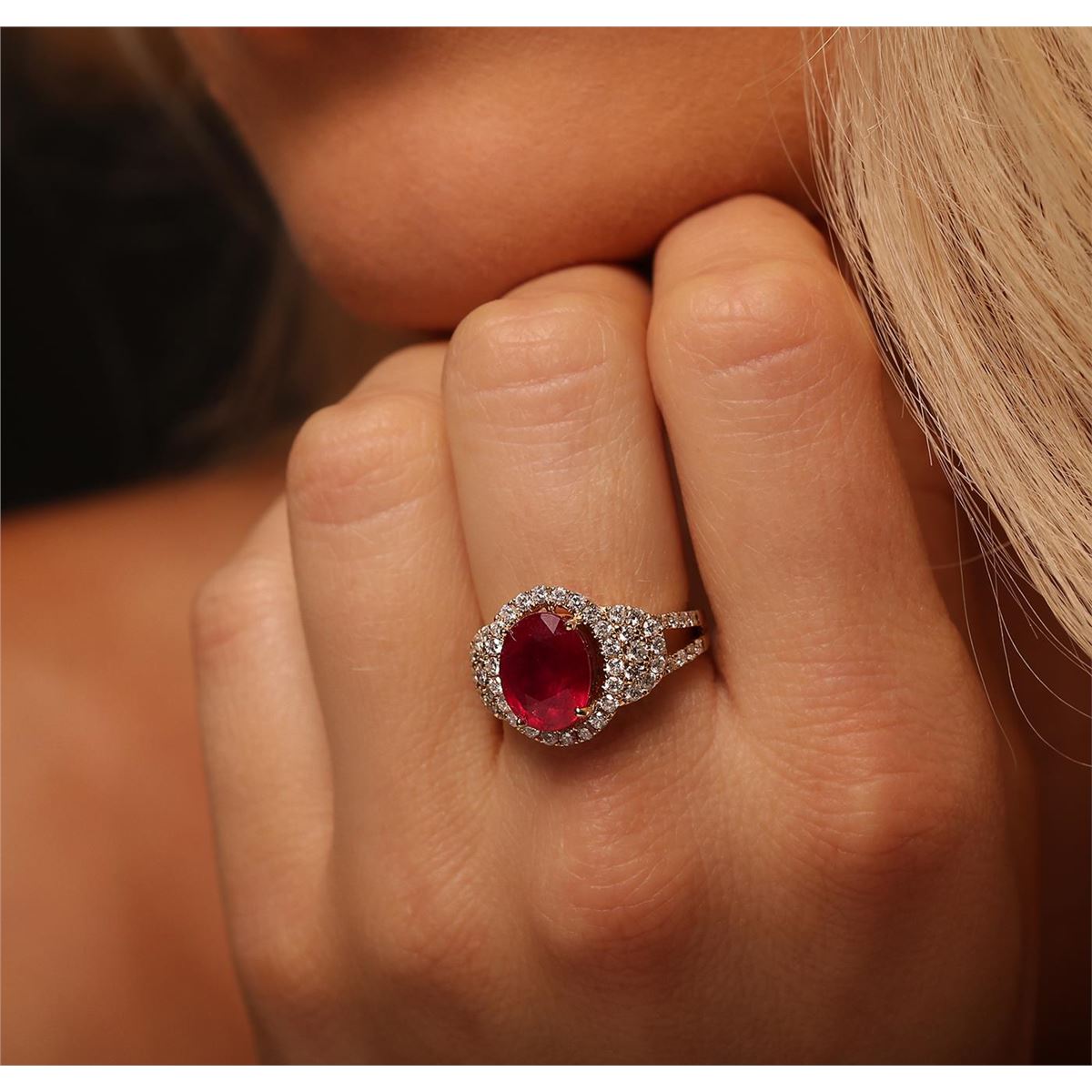 One electronically tested 14KT yellow gold Ladies combination cast & assembled ring with a bright polish finish. Condition is new. Identified with markings of "14K". Containing: One prong set oval modified mixed cut natural ruby, measuring 11.00 x 9.00 x 4.30mm, approximate weight of 3.68ct., clarity is heavily included, type II, medium, moderately strong, slightly purplish red color, (GIA slpR 5/4), cut is good. Colored gemstones are presumed to have been subjected to commonly used color/clarity enhancement processes. Forty-Eight prong set round brilliant cut diamonds, measuring 2.00 - 1.30 x 0.99mm (depth est.) approximate. Total Weight of 48 Stones = 0.79ct. Clarity: I-1 to I-2. Color: H - I, Cut is Good. Total Weight of Colored Stones 3.68ct. Total Weight of Diamonds 0.79ct. Total Weight of Ring 5.20 grams. GGL Appraised at $5,030.00.