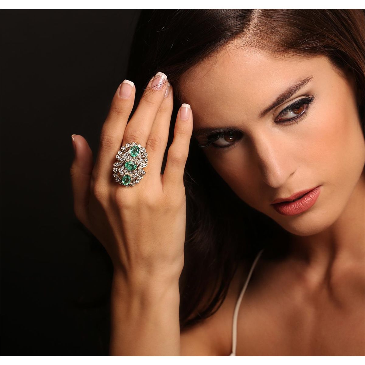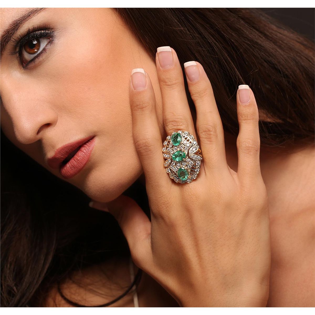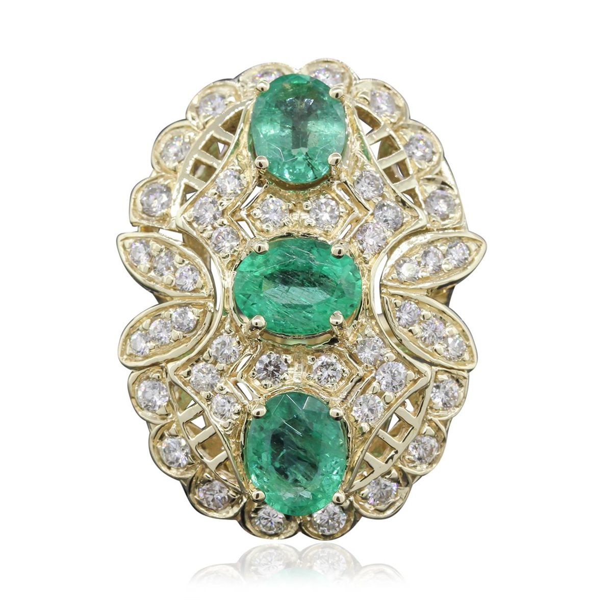 Great Condition! One electronically tested 14KT yellow gold Ladies combination cast & assembled fashion ring with a bright polish finish. Condition is new. Identified with markings of "14K". Containing: Three prong set oval modified mixed cut natural emeralds, measuring 8.80 x 6.80 x 3.50mm, approximate total weight of 3.69ct., clarity is moderately included, type III, medium light, very slightly grayish, green color, (GIA G 4/3), cut is good. Colored gemstones are presumed to have been subjected to commonly used and possible undetectable color/clarity enhancement processes. Sixteen bead set round brilliant cut diamonds, measuring 2.30 - 2.30 x 1.38mm (depth est.) approximate total weight of 16 Stones = 0.71ct. Clarity of SI-2 to I-1, Color of I - J, Cut is Good. Twenty-Five bead set round brilliant cut diamonds, measuring 2.00 - 1.80 x 1.14mm (depth est.) approximate total weight of 25 Stones = 0.63ct. Clarity of SI-2 to I-1, Color of J - K, Cut is Good. Total Weight of Colored Stones 3.69ct. Total Weight of Diamonds 1.34ct. Total Weight of Ring 13.20 grams. GGL Appraised at $14,675.00.