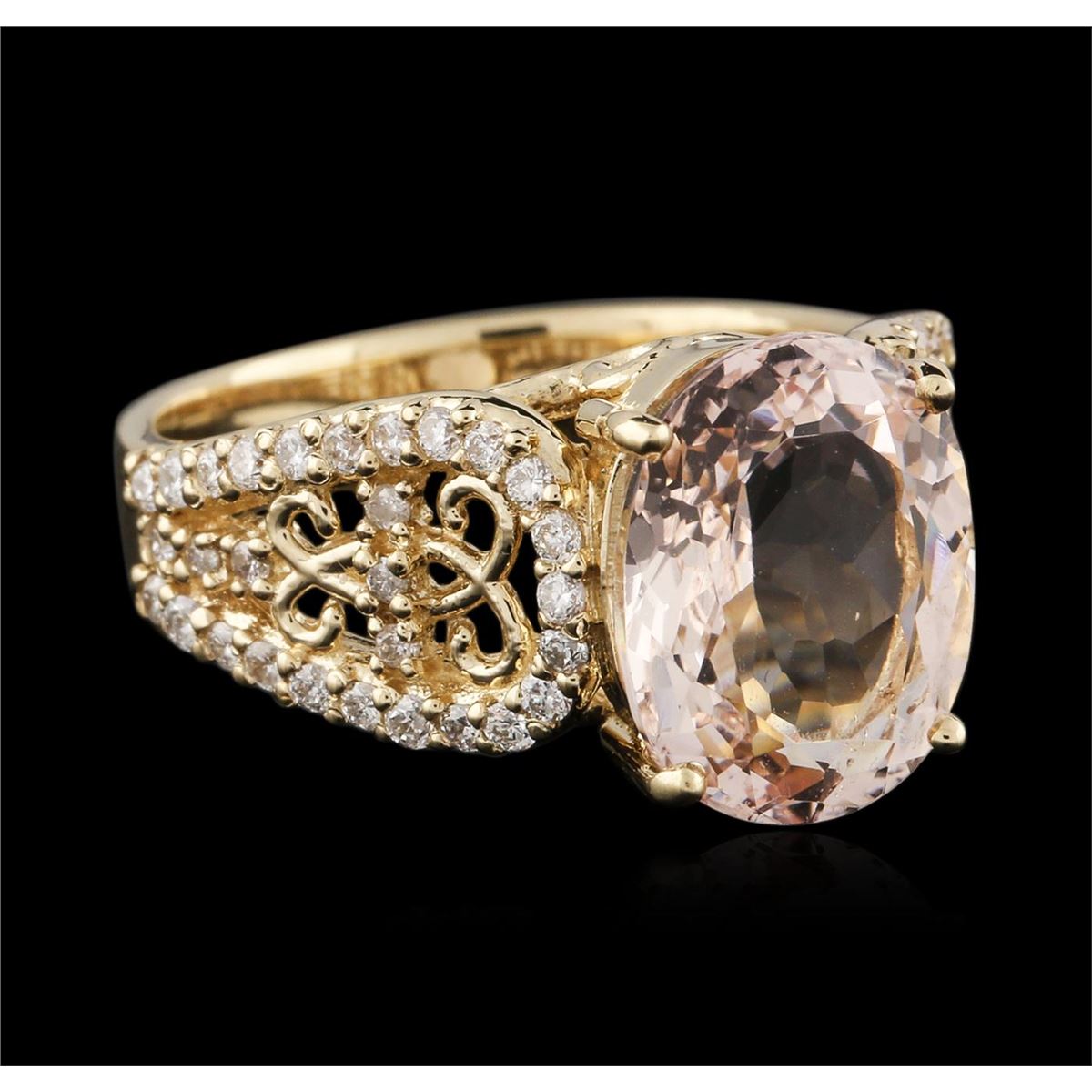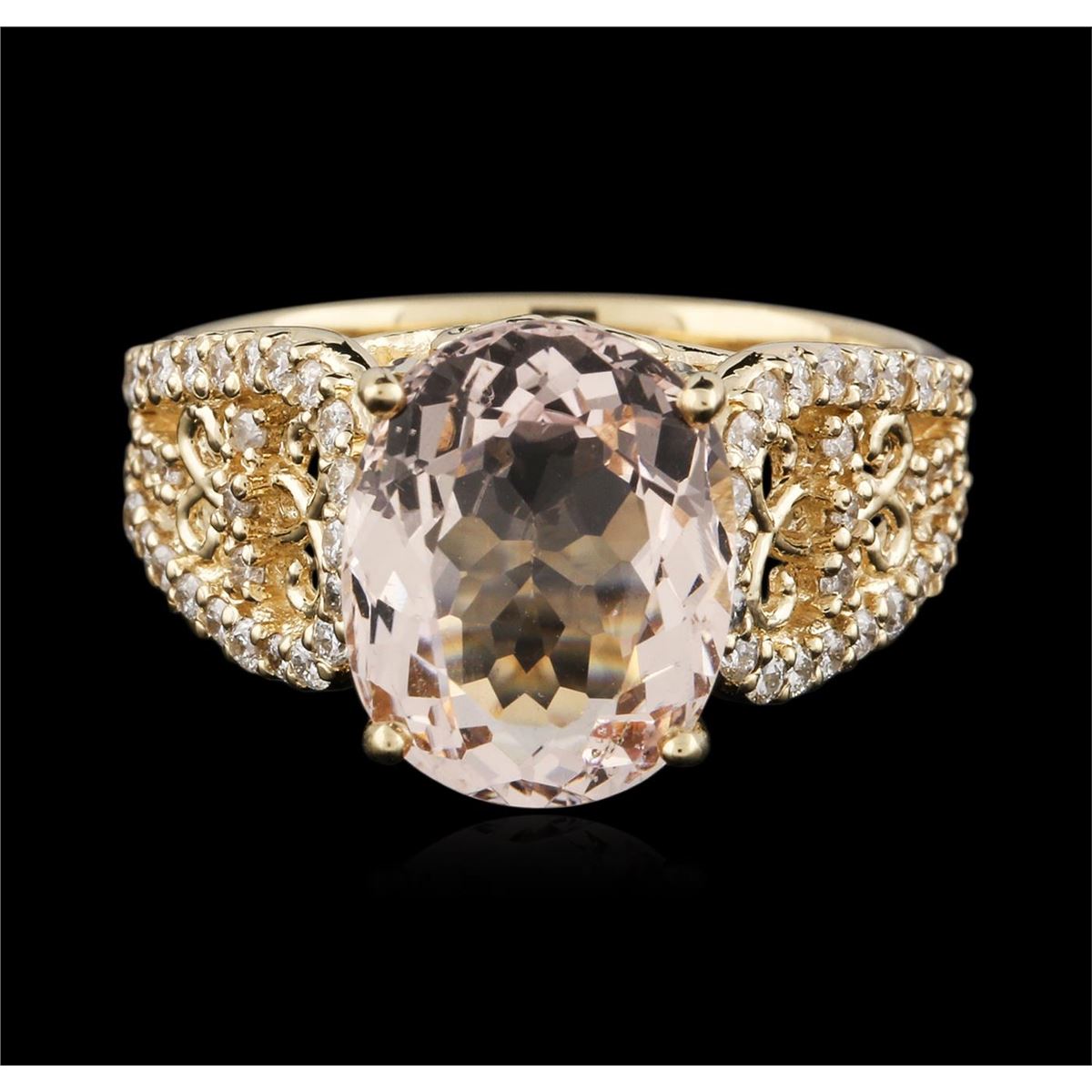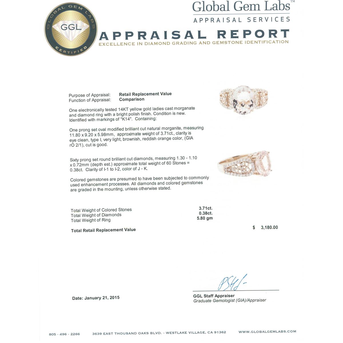 One electronically tested 14KT yellow gold ladies cast morganite and diamond ring with a bright polish finish. Identified with markings of "K14". Condition is new. Containing: One prong set oval modified brilliant cut natural morganite, measuring 11.80 x 9.20 x 5.98mm, approximate weight of 3.71ct., clarity is eye clean, type I, very light, brownish, reddish orange color, (GIA rO 2/1), cut is good. Sixty prong set round brilliant cut diamonds, measuring 1.30 - 1.10 x 0.72mm (depth est.) approximate total weight of 60 Stones = 0.38ct. Clarity: I-1 to I-2. Color: J - K. Colored gemstones are presumed to have been subjected to commonly used enhancement processes. All diamonds and colored gemstones are graded in the mounting, unless otherwise stated. Total Weight of Colored Stones 3.71ct. Total Weight of Diamonds 0.38ct. Total Weight of Ring 5.80 grams. GGL Appraised at $3,180.00.