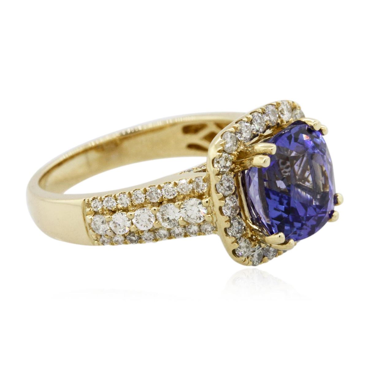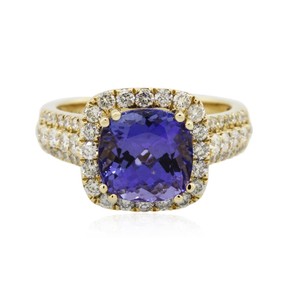 One electronically tested 14KT yellow gold Ladies combination cast & assembled ring with a bright polish finish. Condition is new. Identified with markings of "14K". Containing: One prong set square modified brilliant cut natural tanzanite, measuring 8.80 x 8.80 x 5.72mm, approximate weight of 3.71ct., clarity is eye clean, type I, medium, moderately strong, violet color, (GIA V 5/4), cut is good. Eighty prong set round brilliant cut diamonds, measuring 1.80 - 1.30 x 0.93mm (depth est.) approximate total weight of 80 Stones = 1.09ct. Clarity: SI-2 to I-1. Color: I - J, Cut is Good. Colored gemstones are presumed to have been subjected to commonly used enhancement processes. All diamonds and colored gemstones are graded in the mounting, unless otherwise stated. Total Weight of Colored Stones 3.71ct. Total Weight of Diamonds 1.09ct. Total Weight of Ring 6.10 grams. GGL Appraised at $9,100.00.