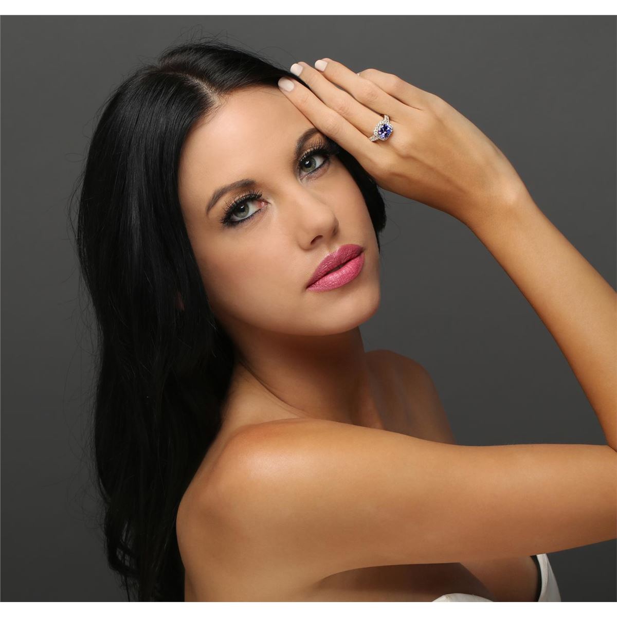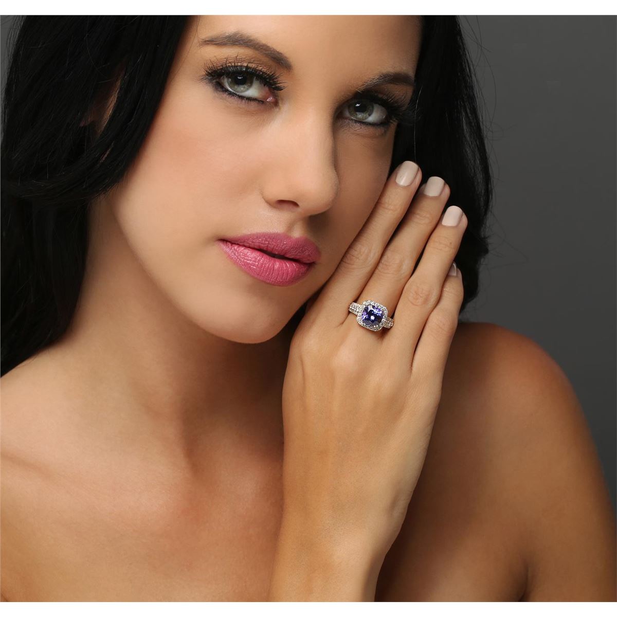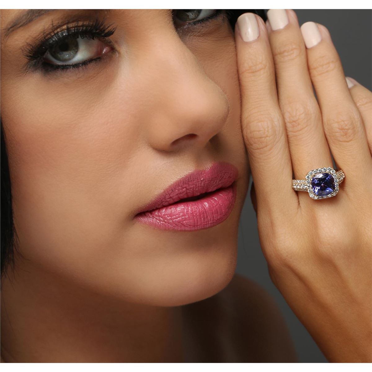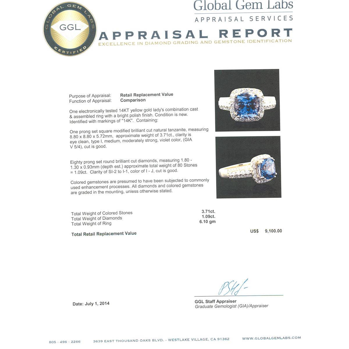 One electronically tested 14KT yellow gold Ladies combination cast & assembled ring with a bright polish finish. Condition is new. Identified with markings of "14K". Containing: One prong set square modified brilliant cut natural tanzanite, measuring 8.80 x 8.80 x 5.72mm, approximate weight of 3.71ct., clarity is eye clean, type I, medium, moderately strong, violet color, (GIA V 5/4), cut is good. Eighty prong set round brilliant cut diamonds, measuring 1.80 - 1.30 x 0.93mm (depth est.) approximate total weight of 80 Stones = 1.09ct. Clarity: SI-2 to I-1. Color: I - J, Cut is Good. Colored gemstones are presumed to have been subjected to commonly used enhancement processes. All diamonds and colored gemstones are graded in the mounting, unless otherwise stated. Total Weight of Colored Stones 3.71ct. Total Weight of Diamonds 1.09ct. Total Weight of Ring 6.10 grams. GGL Appraised at $9,100.00.