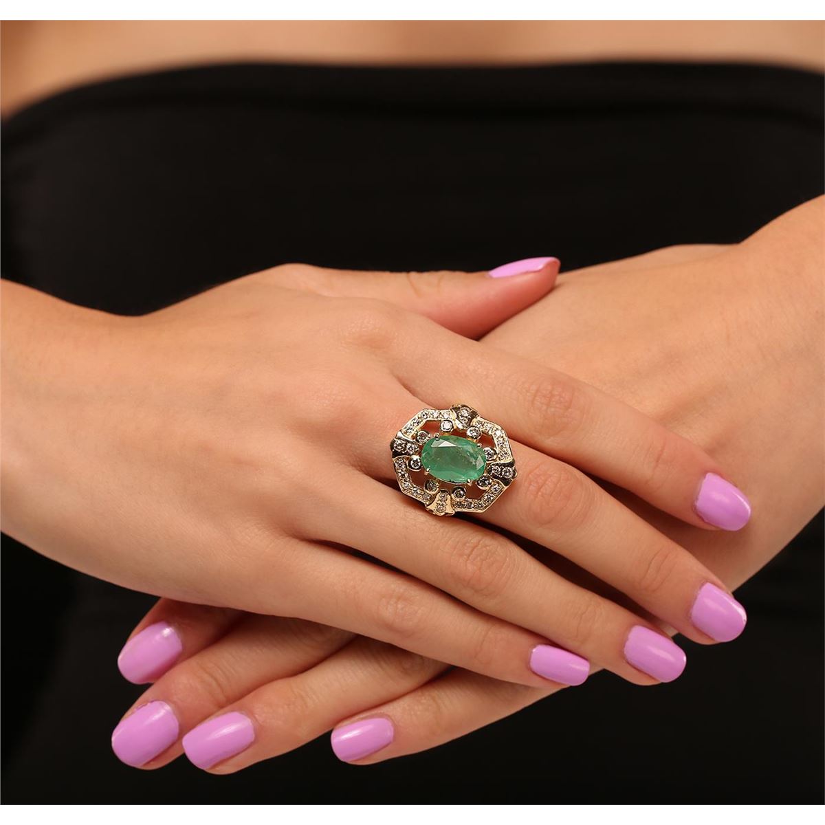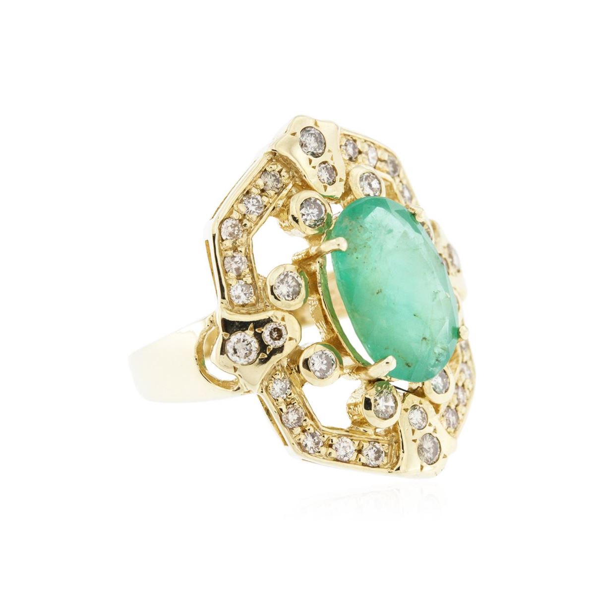 One electronically tested 14KT Yellow Gold ladies cast emerald and diamond ring with a bright polish finish. Condition is new, good workmanship. The featured emerald is set within a stylized diamond set frame supported by tapering shoulders, completed by a three millimeter wide band. Identified with markings of "14K". Containing: One prong set oval mixed cut natural emerald, measuring 12.90 x 9.00 x 5.40mm, 6%. bulge factor, approximate total weight of 3.73ct., clarity is heavily included, type III, medium, very slightly grayish, very slightly bluish green color, (GIA vslbG 5/3), cut is Good. Transmitting light with a minimum of distortion, transparent to translucent. Naturally occurring internal & external characteristics are present. Indications of oil residue. Graded in the setting. Thirty-Six prong and bezel set round brilliant cut diamonds, measuring 1.80 - 1.70 x 1.05mm (depth est.) approximate total weight of 36 Stones = 0.82ct. Faint secondary color throughout. Graded in the setting. Clarity: SI-1 to I-1. Color: I - K. Total Weight of Colored Stones 3.73ct. Total Weight of Diamonds 0.82ct. Total Weight of Ring 8.80 grams. AIG Appraised at $9,445.00.