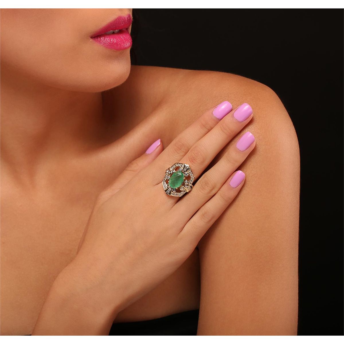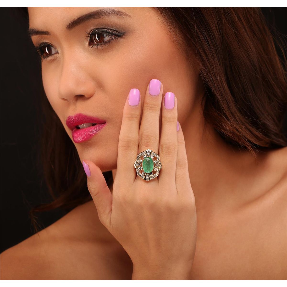 One electronically tested 14KT Yellow Gold ladies cast emerald and diamond ring with a bright polish finish. Condition is new, good workmanship. The featured emerald is set within a stylized diamond set frame supported by tapering shoulders, completed by a three millimeter wide band. Identified with markings of "14K". Containing: One prong set oval mixed cut natural emerald, measuring 12.90 x 9.00 x 5.40mm, 6%. bulge factor, approximate total weight of 3.73ct., clarity is heavily included, type III, medium, very slightly grayish, very slightly bluish green color, (GIA vslbG 5/3), cut is Good. Transmitting light with a minimum of distortion, transparent to translucent. Naturally occurring internal & external characteristics are present. Indications of oil residue. Graded in the setting. Thirty-Six prong and bezel set round brilliant cut diamonds, measuring 1.80 - 1.70 x 1.05mm (depth est.) approximate total weight of 36 Stones = 0.82ct. Faint secondary color throughout. Graded in the setting. Clarity: SI-1 to I-1. Color: I - K. Total Weight of Colored Stones 3.73ct. Total Weight of Diamonds 0.82ct. Total Weight of Ring 8.80 grams. AIG Appraised at $9,445.00.