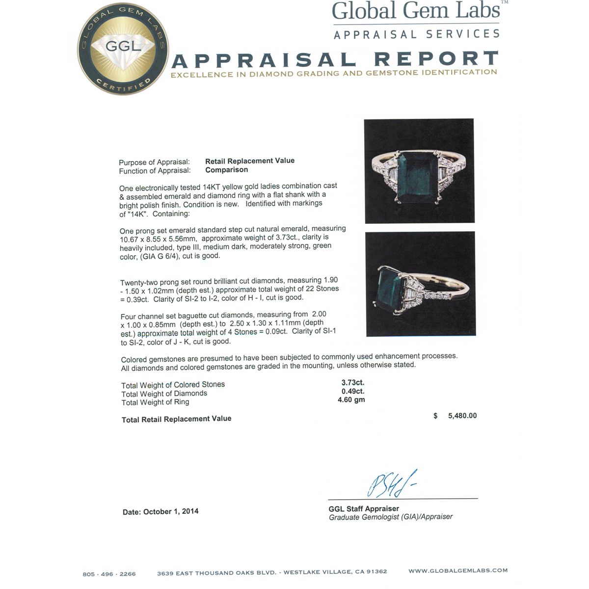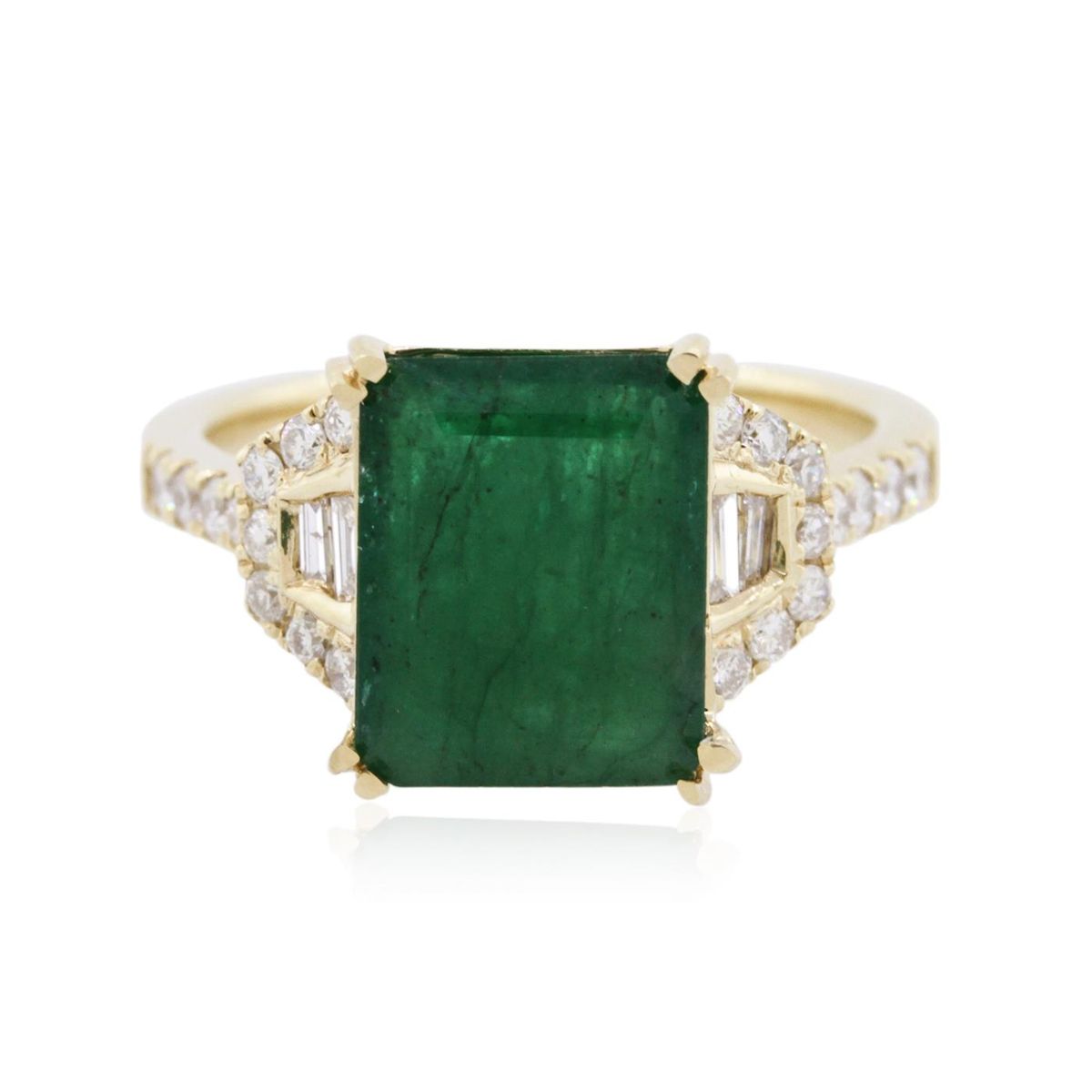One electronically tested 14KT yellow gold ladies combination cast & assembled emerald and diamond ring with a flat shank with a bright polish finish. Identified with markings of "14K". Condition is new. Containing: One prong set emerald standard step cut natural emerald, measuring 10.67 x 8.55 x 5.56mm, approximate weight of 3.73ct., clarity is heavily included, type III, medium dark, moderately strong, green color, (GIA G 6/4), cut is good. Twenty-Two prong set round brilliant cut diamonds, measuring 1.90 - 1.50 x 1.02mm (depth est.) approximate total weight of 22 Stones = 0.39ct. Clarity: SI-2 to I-2. Color: H - I, Cut is Good. Four channel set baguette cut diamonds, measuring from 2.00 x 1.00 x 0.85mm (depth est.) to 2.50 x 1.30 x 1.11mm (depth est.) approximate total weight of 4 Stones = 0.09ct. Clarity: SI-1 to SI-2. Color: J - K, Cut is Good. Colored gemstones are presumed to have been subjected to commonly used enhancement processes. All diamonds and colored gemstones are graded in the mounting, unless otherwise stated. Total Weight of Colored Stones 3.73ct. Total Weight of Diamonds 0.49ct. Total Weight of Ring 4.60 grams. GGL Appraised at $5,480.00.