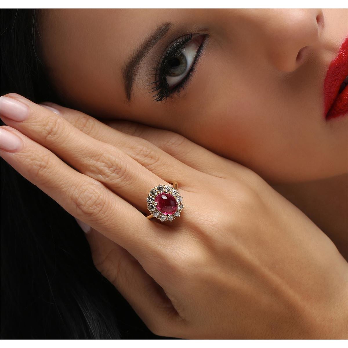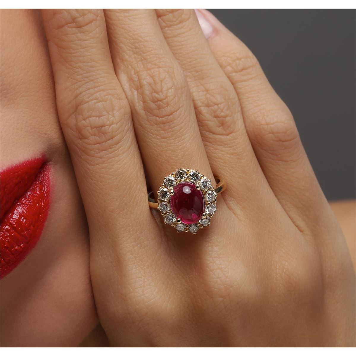 One electronically tested 14KT yellow gold ladies cast rubellite tourmaline and diamond ring with a bright polish finish. The featured rubellite tourmaline is set within a diamond bezel, completed by a two and one-half millimeter wide band. Identified with markings of "K14". Condition is new, good workmanship. Containing: One prong set oval cabochon cut natural rubellite, measuring 10.50 x 8.35 x 4.75mm, 6% bulge factor, approximate weight of 3.75ct., clarity is moderately included, type III, medium dark, moderately strong, slightly purplish red color, (GIA slpR 6/4), cut is good. Transmitting light with a minimum of distortion, transparent. Naturally occurring internal & external characteristics are present. Refractive index spot testing results of 1.62. This is a conclusive result for tourmaline. Graded in the setting. Twelve prong set round brilliant cut diamonds, measuring 2.70 - 2.60 x 1.59mm (depth est.) approximate total weight of 12 Stones = 0.91ct. Graded in the setting. Clarity: VS-2 to SI-2. Color: I - K. Total Weight of Colored Stones 3.75ct. Total Weight of Diamonds 0.91ct. Total Weight of Ring 5.41 grams. AIG Appraised at $5,545.00.