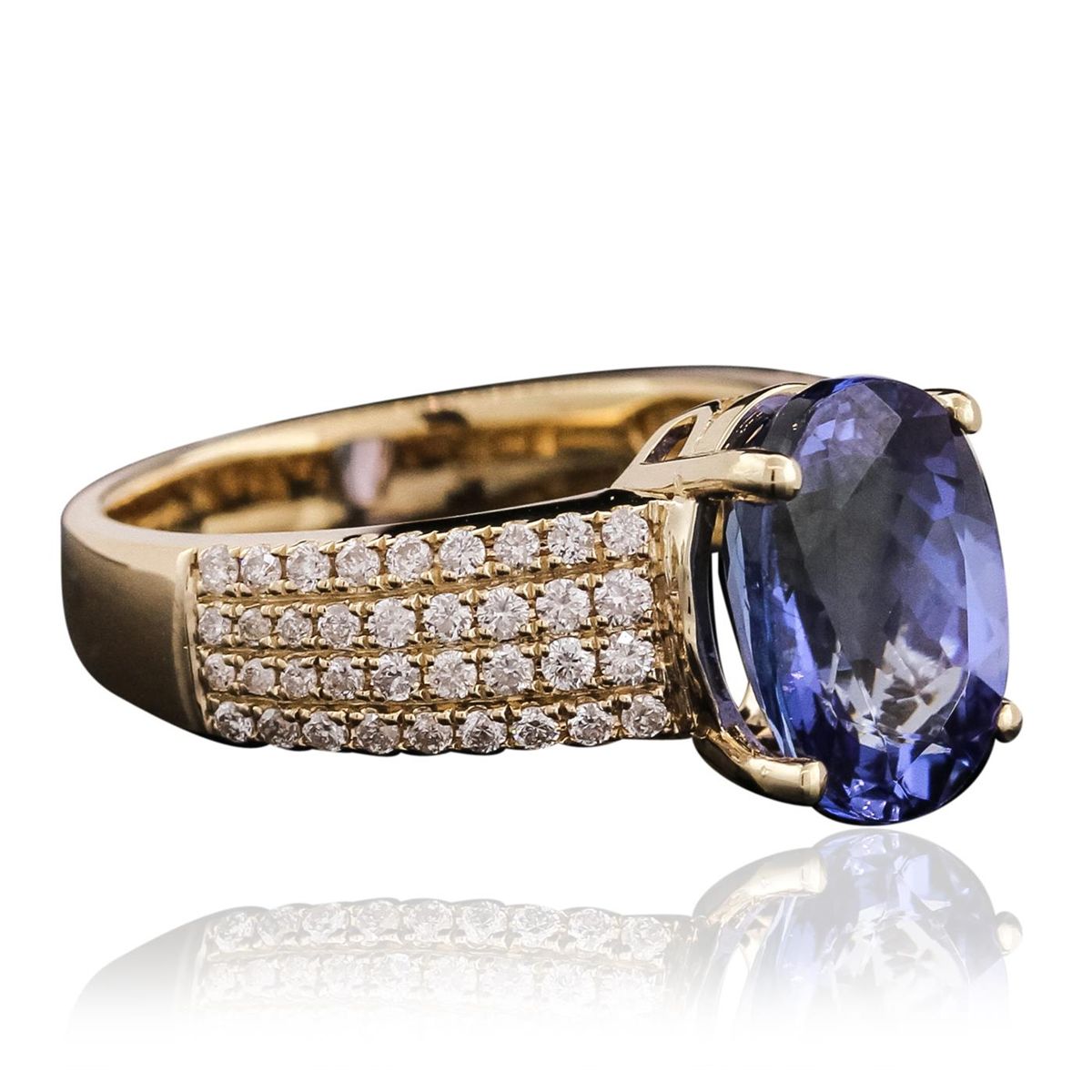 One electronically tested 14KT yellow gold ladies combination cast & assembled tanzanite and diamond ring with a flat shank with a bright polish finish. Identified with markings of "14K". Condition is new. Containing: One prong set oval modified brilliant cut natural tanzanite, measuring 11.28 x 8.09 x 5.96mm, approximate weight of 3.75ct., clarity is eye clean, type I, medium, moderately strong, bluish violet color, (GIA bV 5/4), cut is good. Seventy-Two prong set round brilliant cut diamonds, measuring 1.10 - 1.10 x 0.66mm (depth est.) approximate total weight of 72 Stones = 0.35ct. Clarity: I-1 to I-2. Color: J - K, Cut is Good. Colored gemstones are presumed to have been subjected to commonly used enhancement processes. All diamonds and colored gemstones are graded in the mounting, unless otherwise stated total weight of Colored Stones 3.75ct. Total Weight of Diamonds 0.35ct. Total Weight of Ring 6.30 grams. GGL Appraised at $8,475.00.
