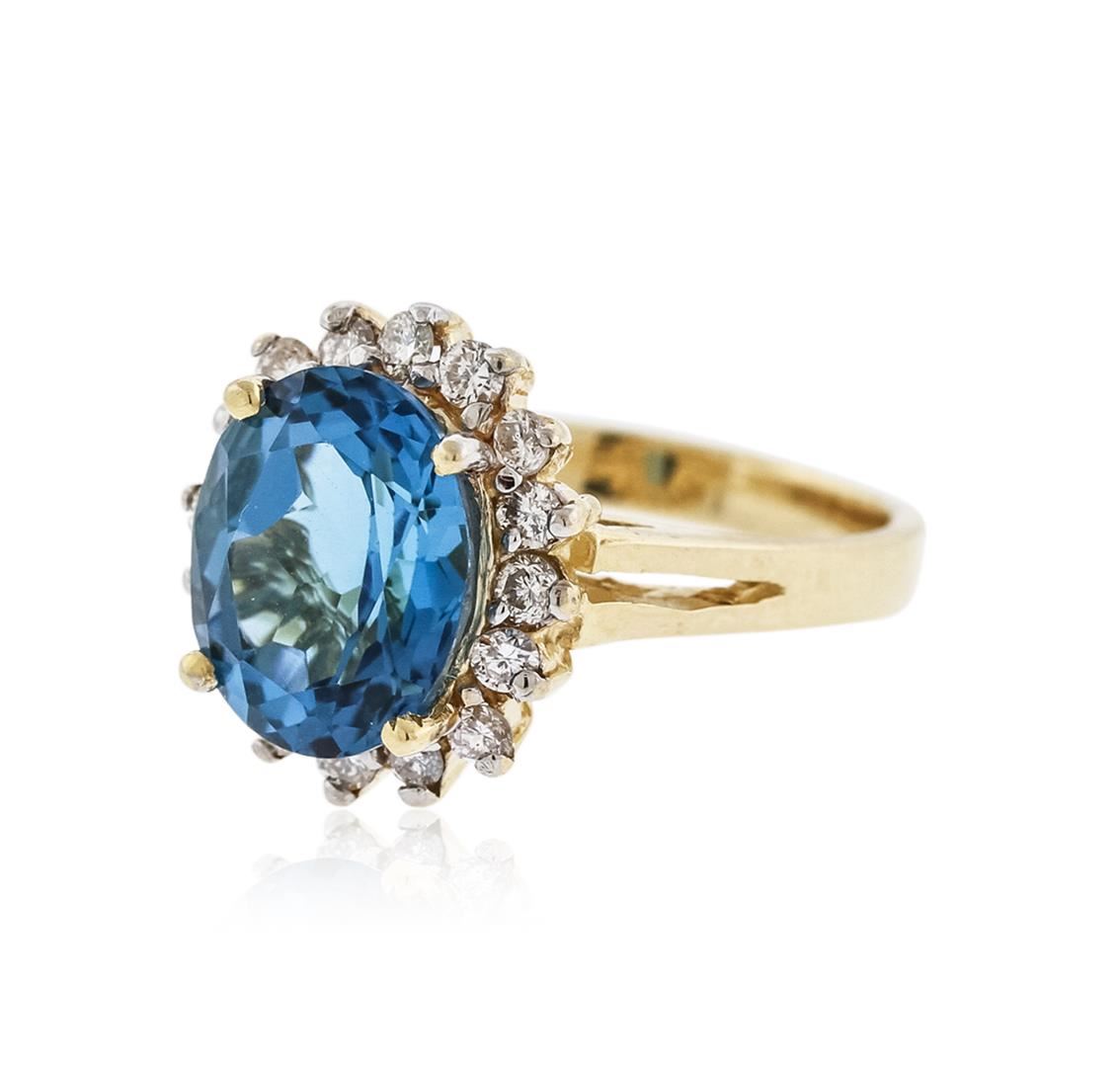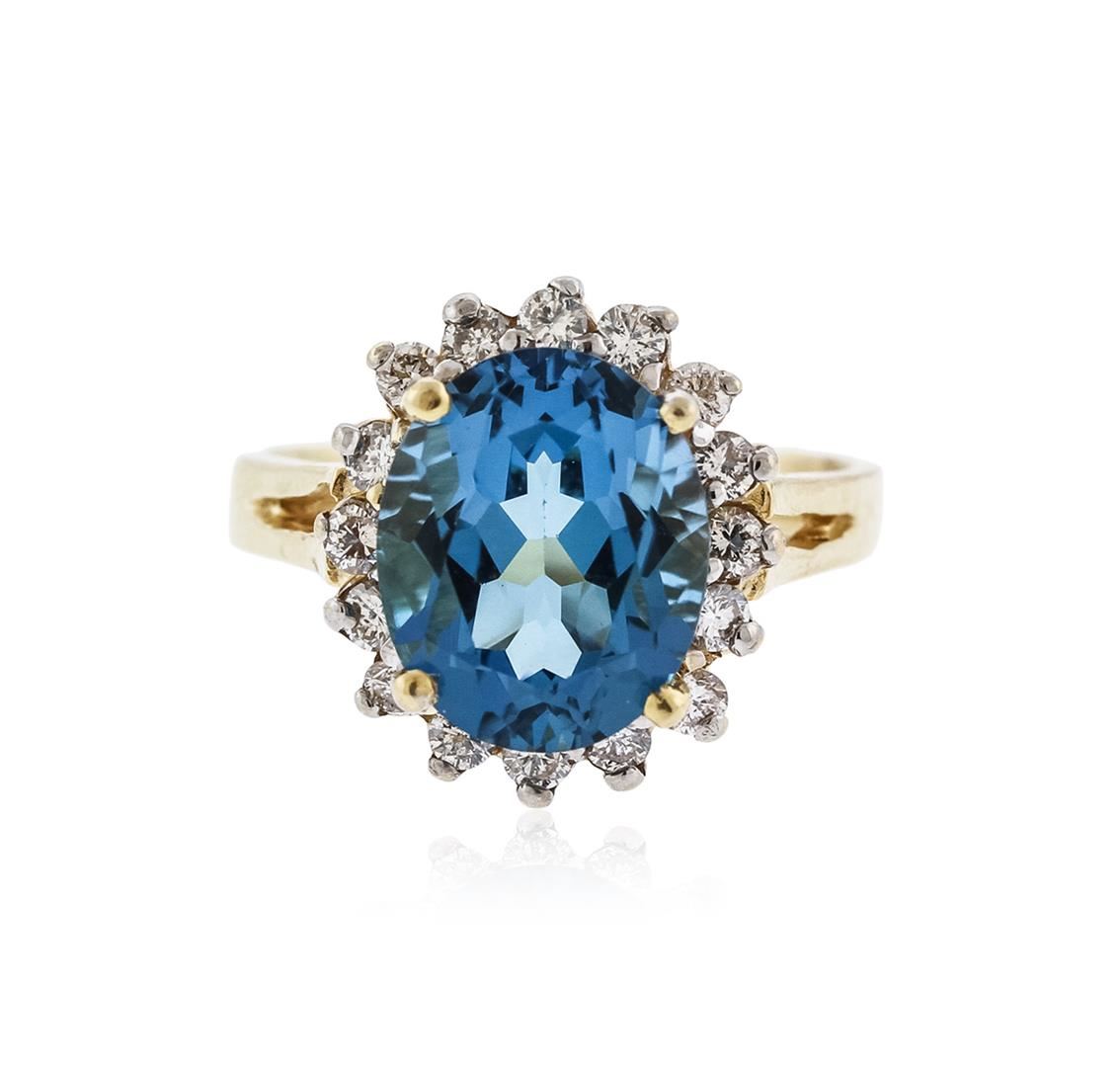 One ring featuring: 14KT yellow gold weighing 5.55 grams containing one blue topaz center weighing 3.80ct and diamonds weighing a total of 0.56ct.