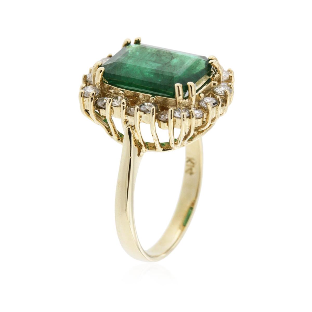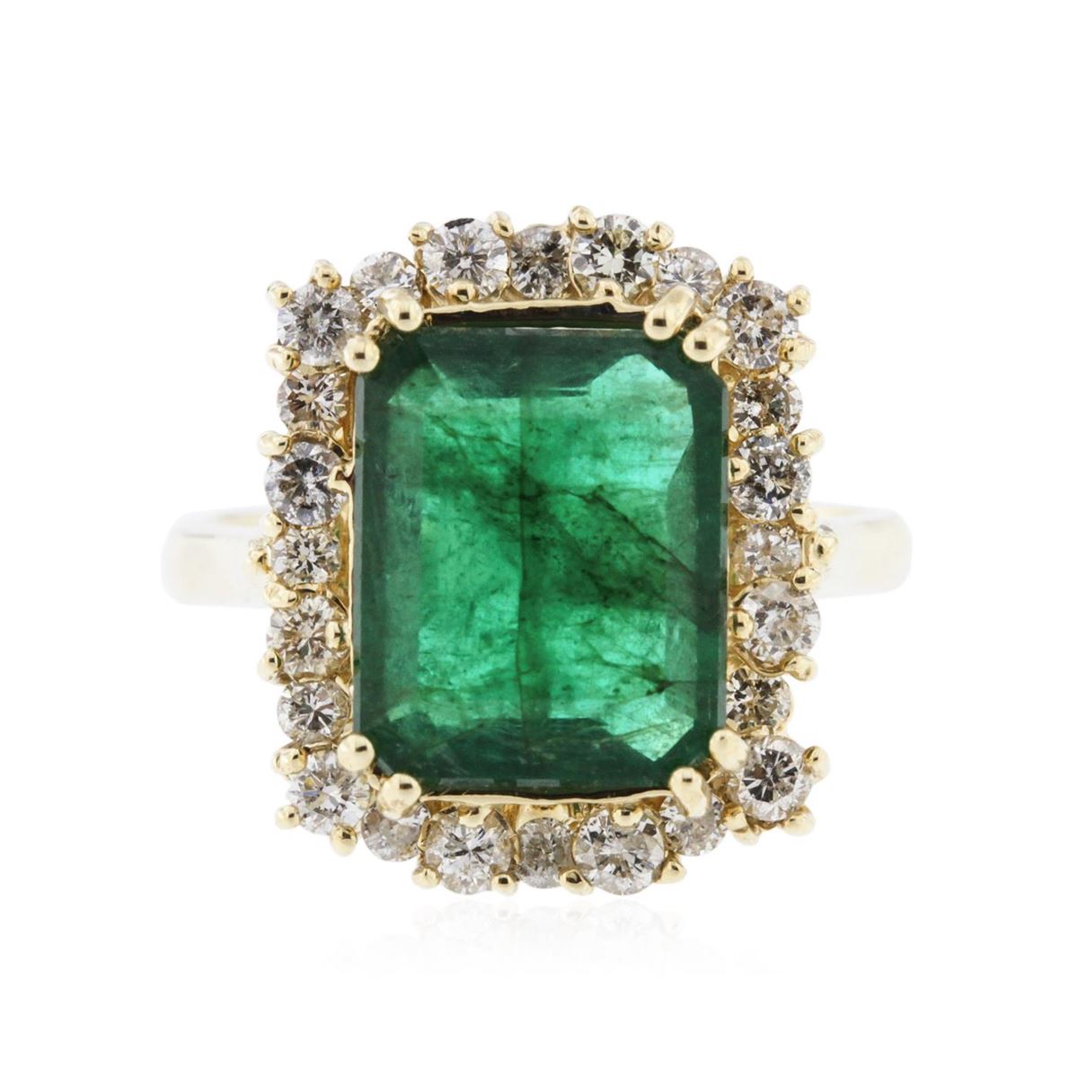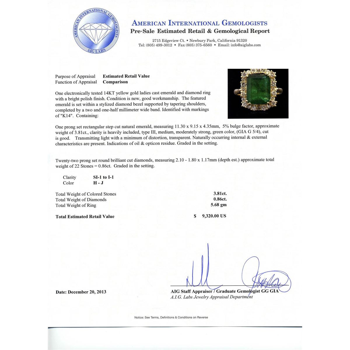 14KT yellow gold 3.81ct Emerald and Diamond Ring A6611. One electronically tested 14KT yellow gold ladies cast emerald and diamond ring with a bright polish finish. The featured emerald is set within a stylized diamond bezel supported by tapering shoulders, completed by a two and one-half millimeter wide band. Identified with markings of "K14". Condition is new, good workmanship. Containing: One prong set rectangular step cut natural emerald, measuring 11.30 x 9.15 x 4.35mm, 5%. bulge factor, approximate weight of 3.81ct., clarity is heavily included, type III, medium, moderately strong, green color, (GIA G 5/4), cut is good. Transmitting light with a minimum of distortion, transparent. Naturally occurring internal & external characteristics are present. Indications of oil & opticon residue. Graded in the setting.Twenty-Two prong set round brilliant cut diamonds, measuring 2.10 - 1.80 x 1.17mm (depth est.) approximate. Total Weight of 22 Stones = 0.86ct. Graded in the setting. Clarity: SI-1 to I-1. Color: H - J. Total Weight of Colored Stones 3.81ct. Total Weight of Diamonds 0.86ct. AIG Appraised at $9,320.00.