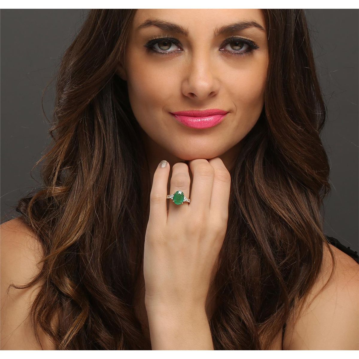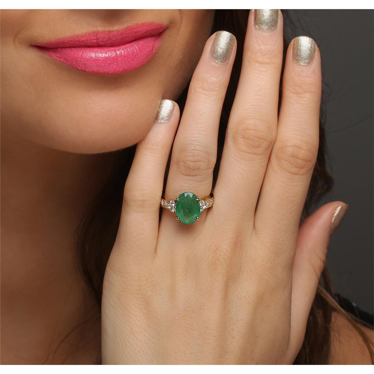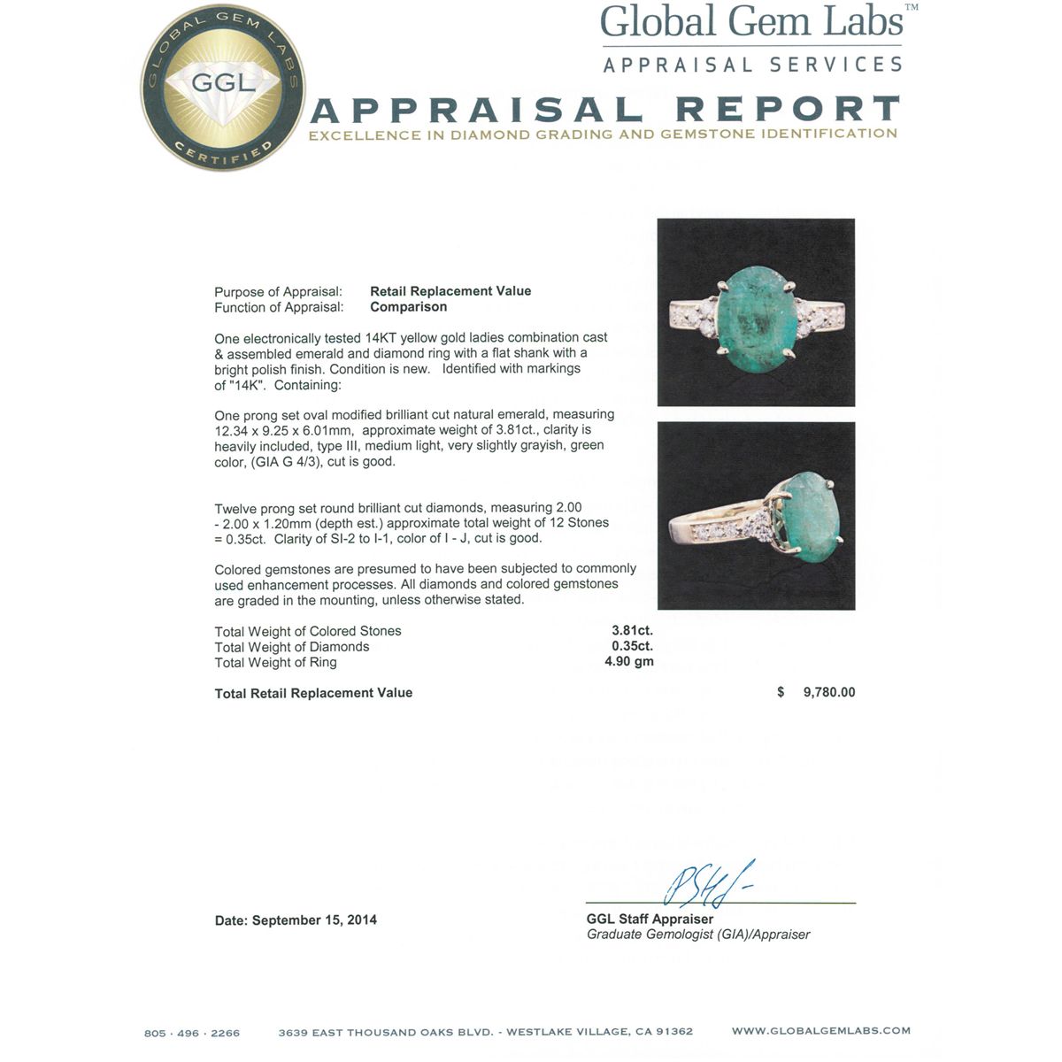 One electronically tested 14KT yellow gold ladies combination cast & assembled emerald and diamond ring with a flat shank with a bright polish finish. Identified with markings of "14K". Condition is new. Containing: One prong set oval modified brilliant cut natural emerald, measuring 12.34 x 9.25 x 6.01mm, approximate weight of 3.81ct., clarity is heavily included, type III, medium light, very slightly grayish, green color, (GIA G 4/3), cut is good. Twelve prong set round brilliant cut diamonds, measuring 2.00 - 2.00 x 1.20mm (depth est.) approximate total weight of 12 Stones = 0.35ct. Clarity: SI-2 to I-1. Color: I - J, Cut is Good. Colored gemstones are presumed to have been subjected to commonly used enhancement processes. All diamonds and colored gemstones are graded in the mounting, unless otherwise stated total weight of Colored Stones 3.81ct. Total Weight of Diamonds 0.35ct. Total Weight of Ring 4.90 grams. GGL Appraised at $9,780.00.