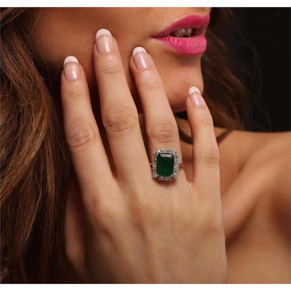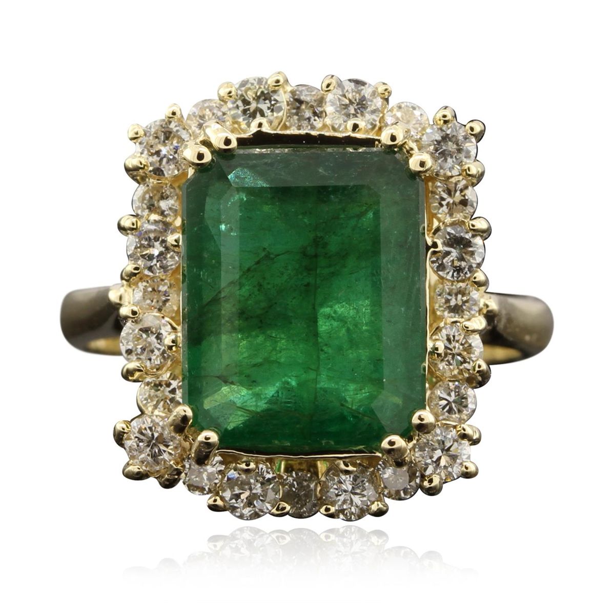 14KT yellow gold 3.81ct Emerald and Diamond Ring A6611. One electronically tested 14KT yellow gold ladies cast emerald and diamond ring with a bright polish finish. The featured emerald is set within a stylized diamond bezel supported by tapering shoulders, completed by a two and one-half millimeter wide band. Identified with markings of "K14". Condition is new, good workmanship. Containing: One prong set rectangular step cut natural emerald, measuring 11.30 x 9.15 x 4.35mm, 5%. bulge factor, approximate weight of 3.81ct., clarity is heavily included, type III, medium, moderately strong, green color, (GIA G 5/4), cut is good. Transmitting light with a minimum of distortion, transparent. Naturally occurring internal & external characteristics are present. Indications of oil & opticon residue. Graded in the setting.Twenty-Two prong set round brilliant cut diamonds, measuring 2.10 - 1.80 x 1.17mm (depth est.) approximate. Total Weight of 22 Stones = 0.86ct. Graded in the setting. Clarity: SI-1 to I-1. Color: H - J. Total Weight of Colored Stones 3.81ct. Total Weight of Diamonds 0.86ct. AIG Appraised at $9,320.00.