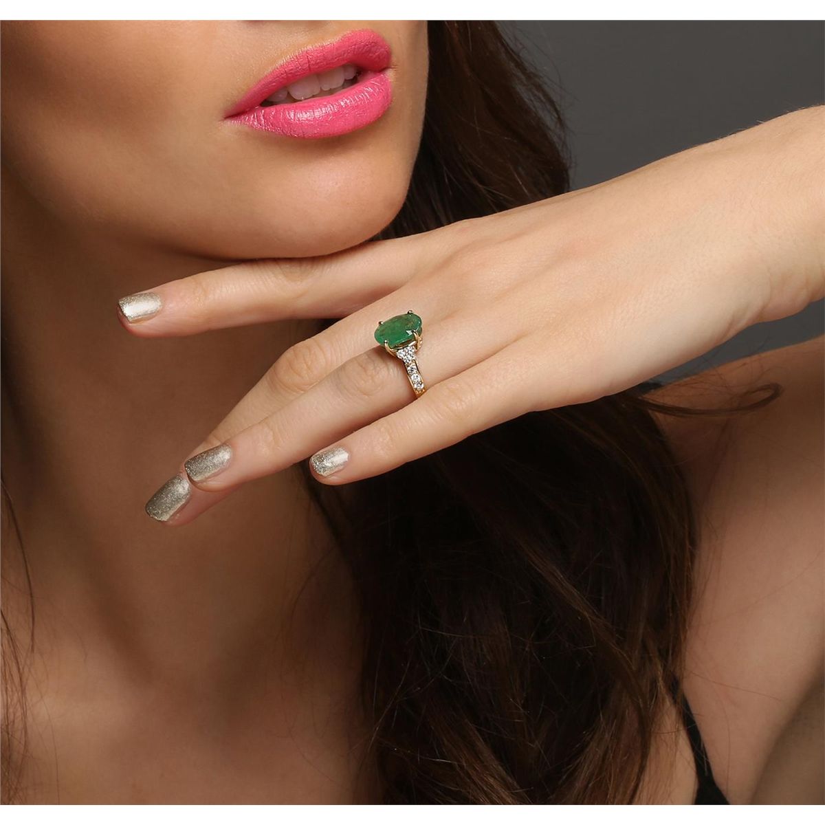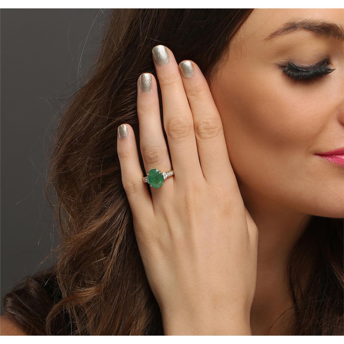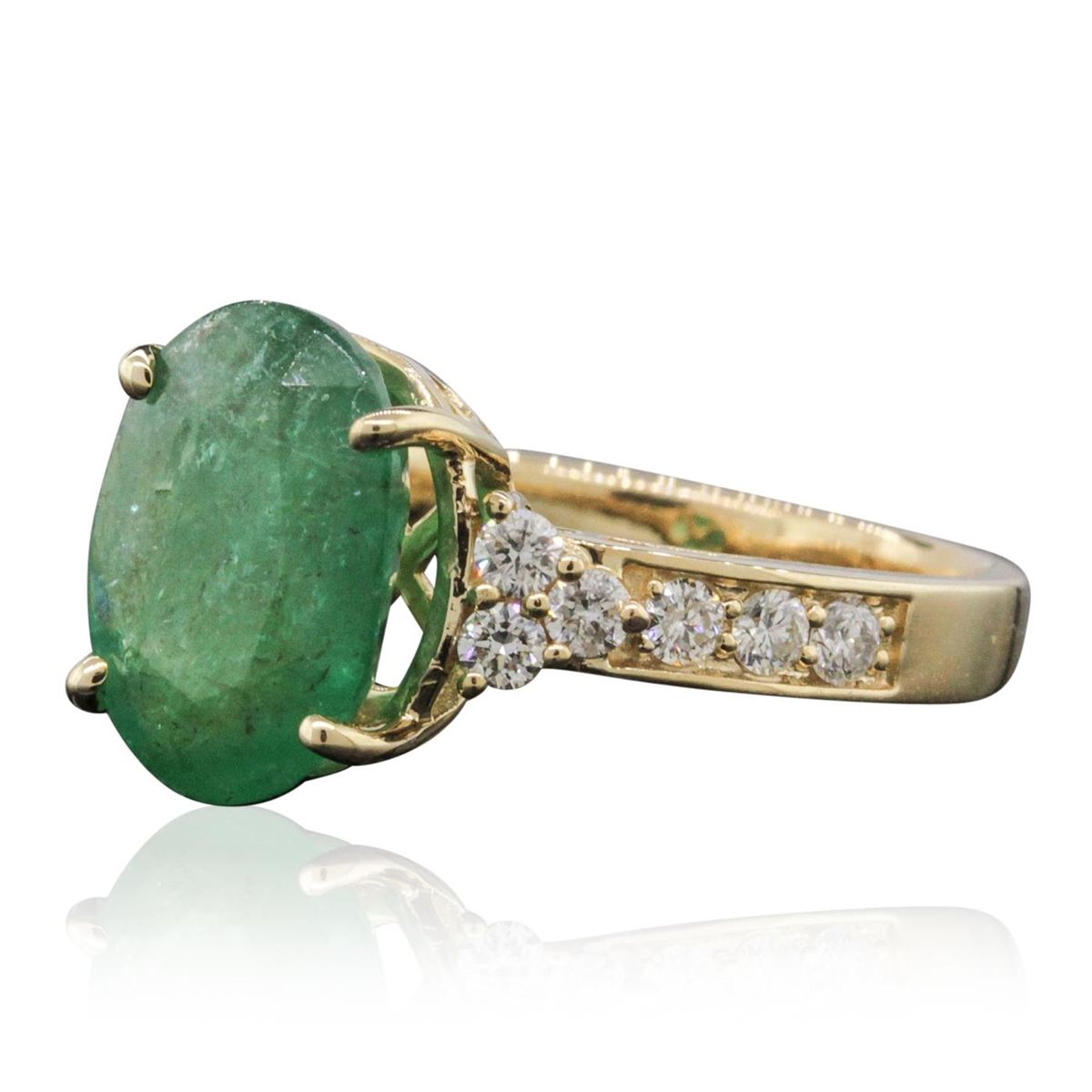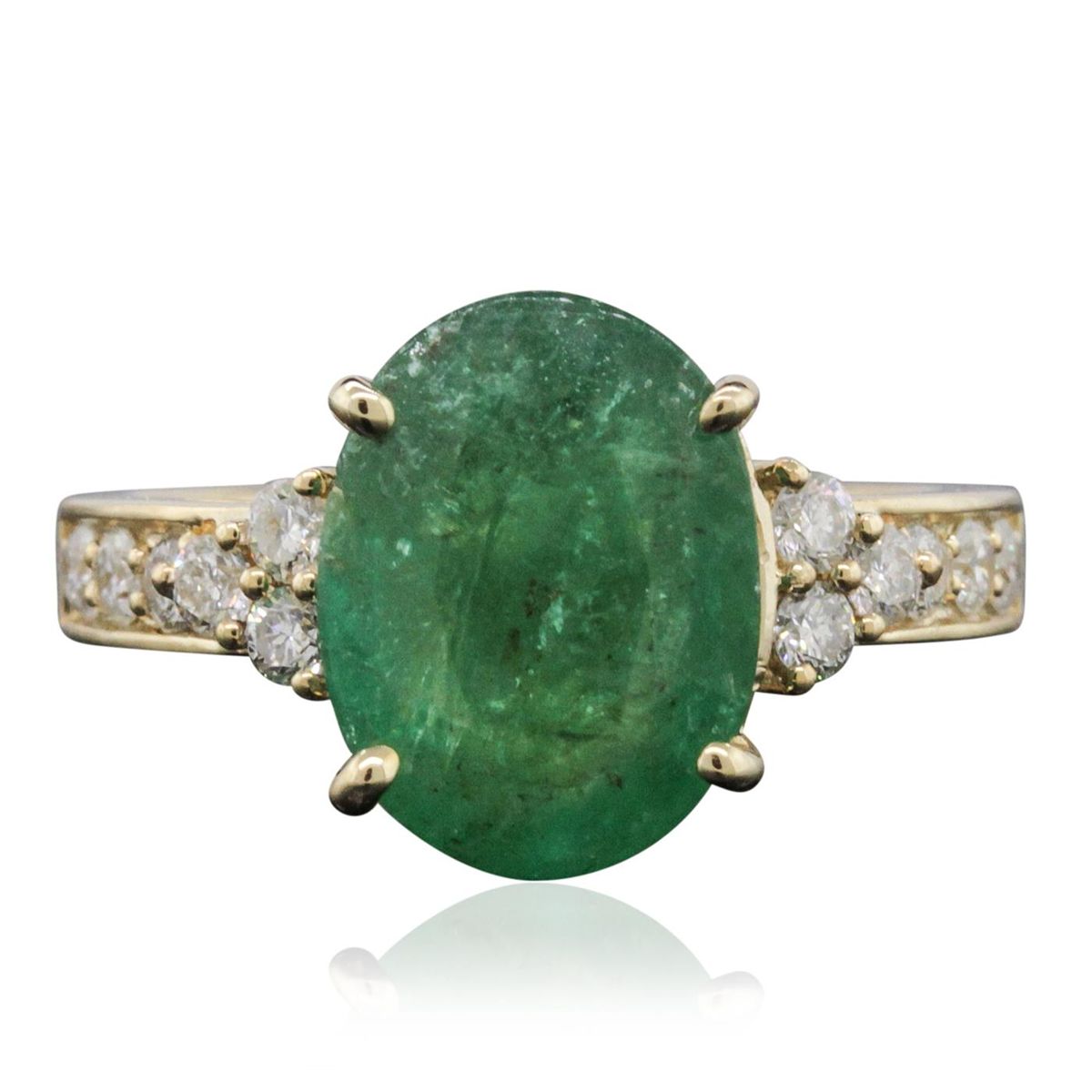One electronically tested 14KT yellow gold ladies combination cast & assembled emerald and diamond ring with a flat shank with a bright polish finish. Identified with markings of "14K". Condition is new. Containing: One prong set oval modified brilliant cut natural emerald, measuring 12.34 x 9.25 x 6.01mm, approximate weight of 3.81ct., clarity is heavily included, type III, medium light, very slightly grayish, green color, (GIA G 4/3), cut is good. Twelve prong set round brilliant cut diamonds, measuring 2.00 - 2.00 x 1.20mm (depth est.) approximate total weight of 12 Stones = 0.35ct. Clarity: SI-2 to I-1. Color: I - J, Cut is Good. Colored gemstones are presumed to have been subjected to commonly used enhancement processes. All diamonds and colored gemstones are graded in the mounting, unless otherwise stated total weight of Colored Stones 3.81ct. Total Weight of Diamonds 0.35ct. Total Weight of Ring 4.90 grams. GGL Appraised at $9,780.00.