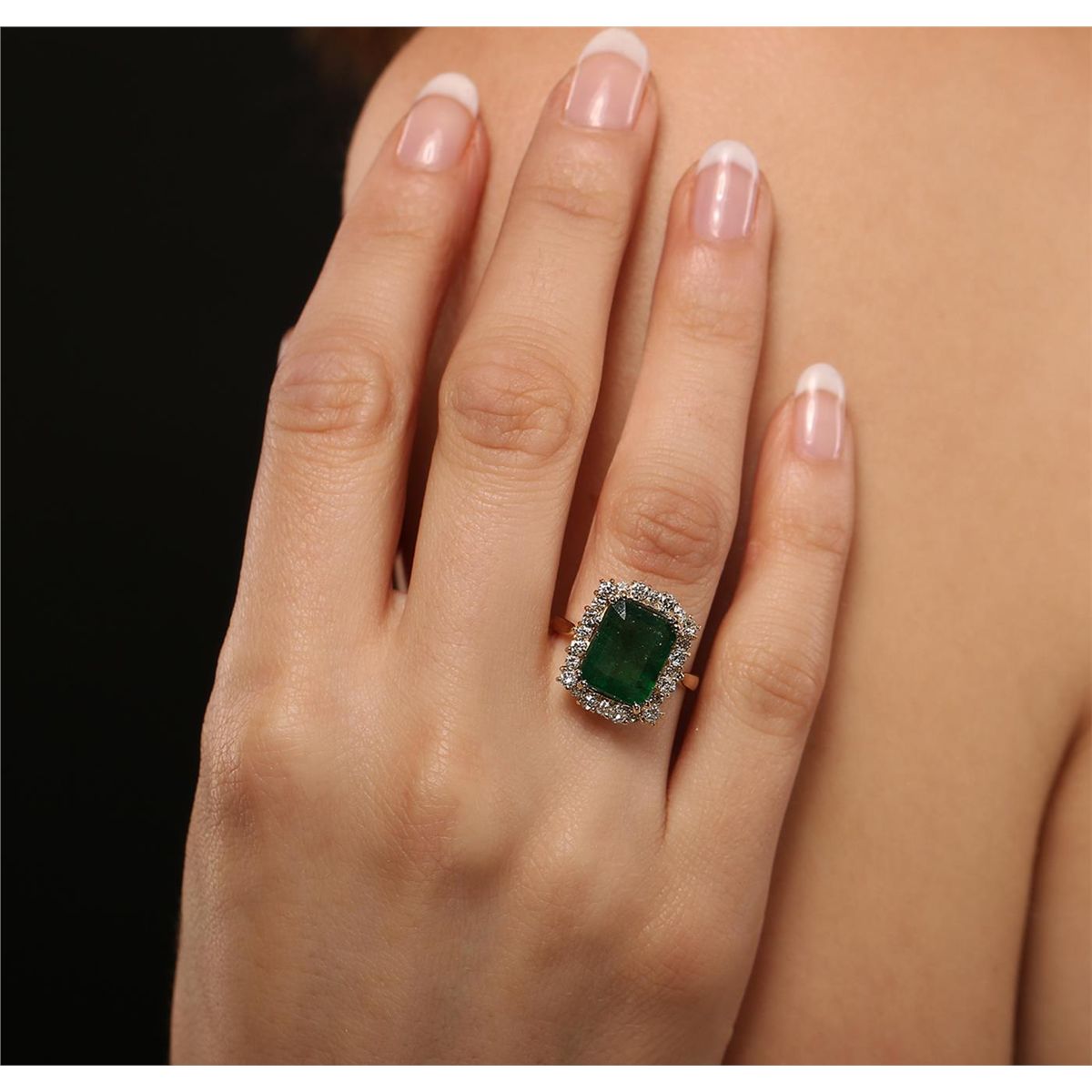 14KT yellow gold 3.81ct Emerald and Diamond Ring A6611. One electronically tested 14KT yellow gold ladies cast emerald and diamond ring with a bright polish finish. The featured emerald is set within a stylized diamond bezel supported by tapering shoulders, completed by a two and one-half millimeter wide band. Identified with markings of "K14". Condition is new, good workmanship. Containing: One prong set rectangular step cut natural emerald, measuring 11.30 x 9.15 x 4.35mm, 5%. bulge factor, approximate weight of 3.81ct., clarity is heavily included, type III, medium, moderately strong, green color, (GIA G 5/4), cut is good. Transmitting light with a minimum of distortion, transparent. Naturally occurring internal & external characteristics are present. Indications of oil & opticon residue. Graded in the setting.Twenty-Two prong set round brilliant cut diamonds, measuring 2.10 - 1.80 x 1.17mm (depth est.) approximate. Total Weight of 22 Stones = 0.86ct. Graded in the setting. Clarity: SI-1 to I-1. Color: H - J. Total Weight of Colored Stones 3.81ct. Total Weight of Diamonds 0.86ct. AIG Appraised at $9,320.00.