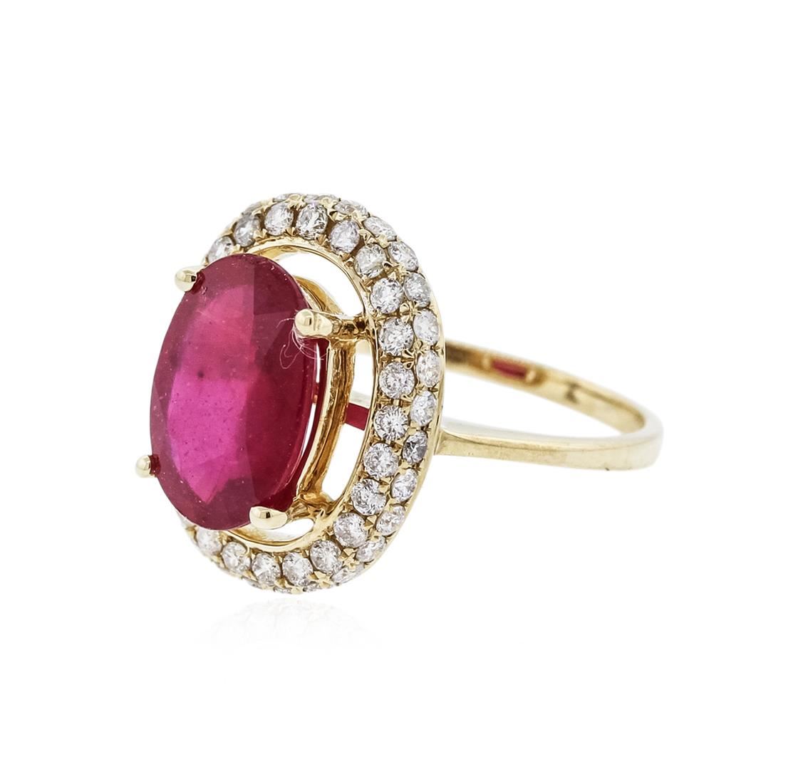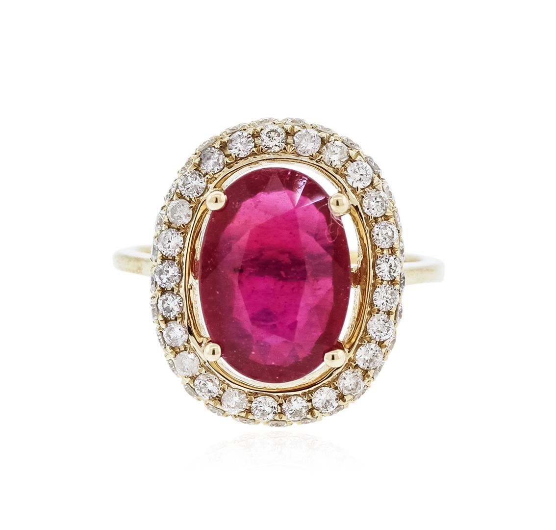 One electronically tested 14KT yellow gold ladies cast ruby and diamond ring with a cathedral shank with a bright polish finish. Trademark is Orianne. Identified with markings of "14K". Condition is new. Containing: One prong set oval modified brilliant cut natural ruby, measuring 12.00 x 8.00 x 4.83mm, approximate weight of 3.89ct., clarity is heavily included, type II, medium dark, very slightly brownish, strongly purplish red color, (GIA stpR 6/3), cut is good. Forty-Eight prong set round brilliant cut diamonds, measuring 1.30 - 1.30 x 0.78mm (depth est.) approximate total weight of 48 Stones = 0.38ct. Clarity: I-1 to I-2. Color: J - K. All diamonds and colored gemstones are graded in the mounting, unless otherwise stated. Colored gemstones are presumed to have been subjected to commonly used enhancement processes. Total Weight of Colored Stones 3.89ct. Total Weight of Diamonds 0.38ct. Total Weight of Ring 5.30 grams. GGL Appraised at $4,300.00.