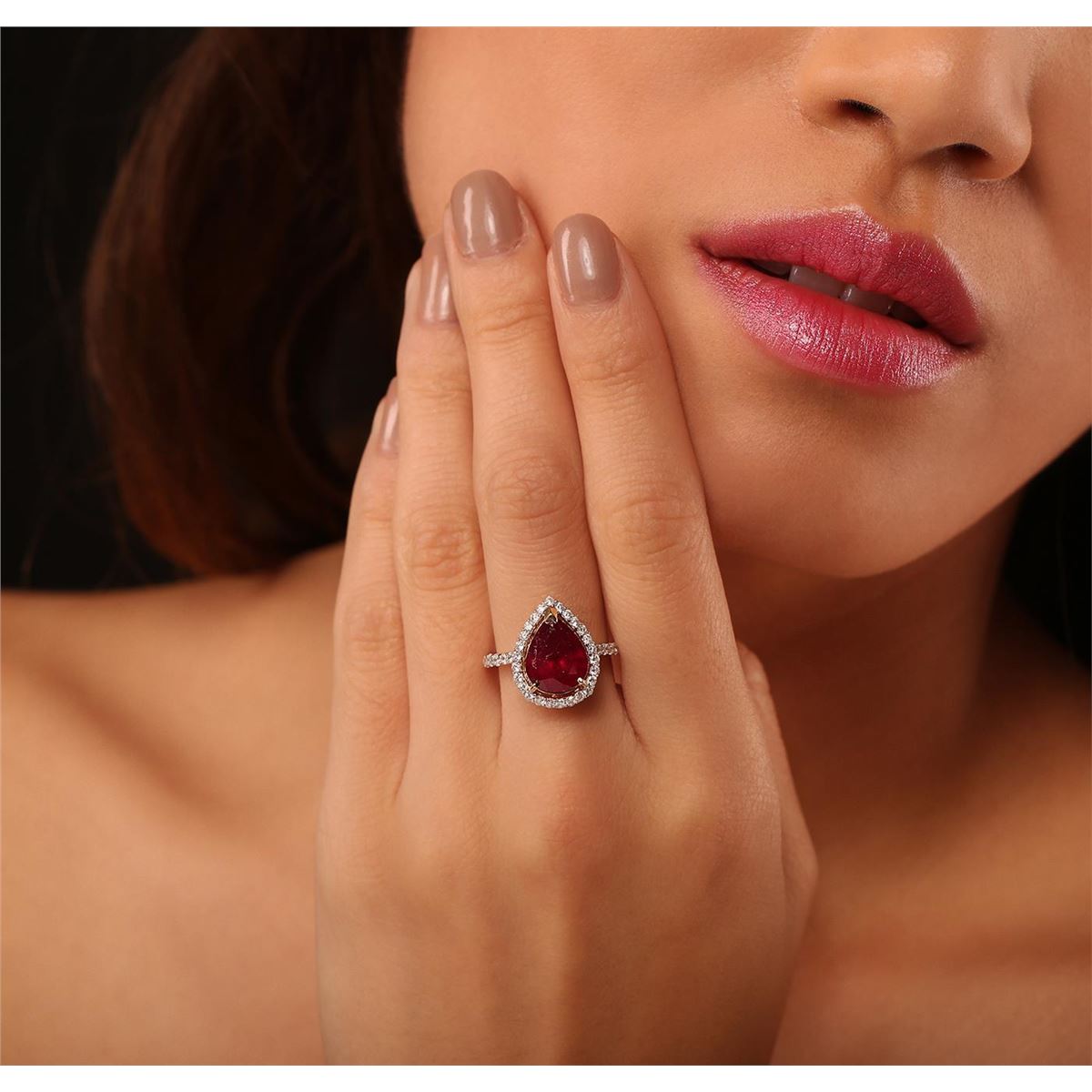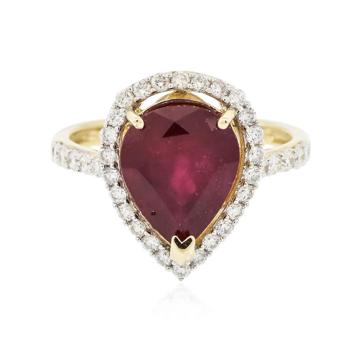 One electronically tested 14KT yellow gold Ladies combination cast & assembled ring with a bright polish finish. Condition is new. Identified with markings of "14K". Containing: One prong set pear modified brilliant cut natural ruby, measuring 11.00 x 9.00 x 5.85mm, approximate weight of 3.98ct., clarity is heavily included, type II, medium dark, moderately strong, strongly purplish red color, (GIA stpR 6/4), cut is good. Colored gemstones are presumed to have been subjected to commonly used color/clarity enhancement processes. Thirty-Six prong set round brilliant cut diamonds, measuring 1.50 - 1.50 x 0.90mm (depth est.) approximate. Total Weight of 36 Stones = 0.59ct. Clarity: I-1 to I-2. Color: I - J, Cut is Good. Total Weight of Colored Stones 3.98ct. Total Weight of Diamonds 0.59ct. Total Weight of Ring 3.90 grams. GGL Appraised at $4,405.00.