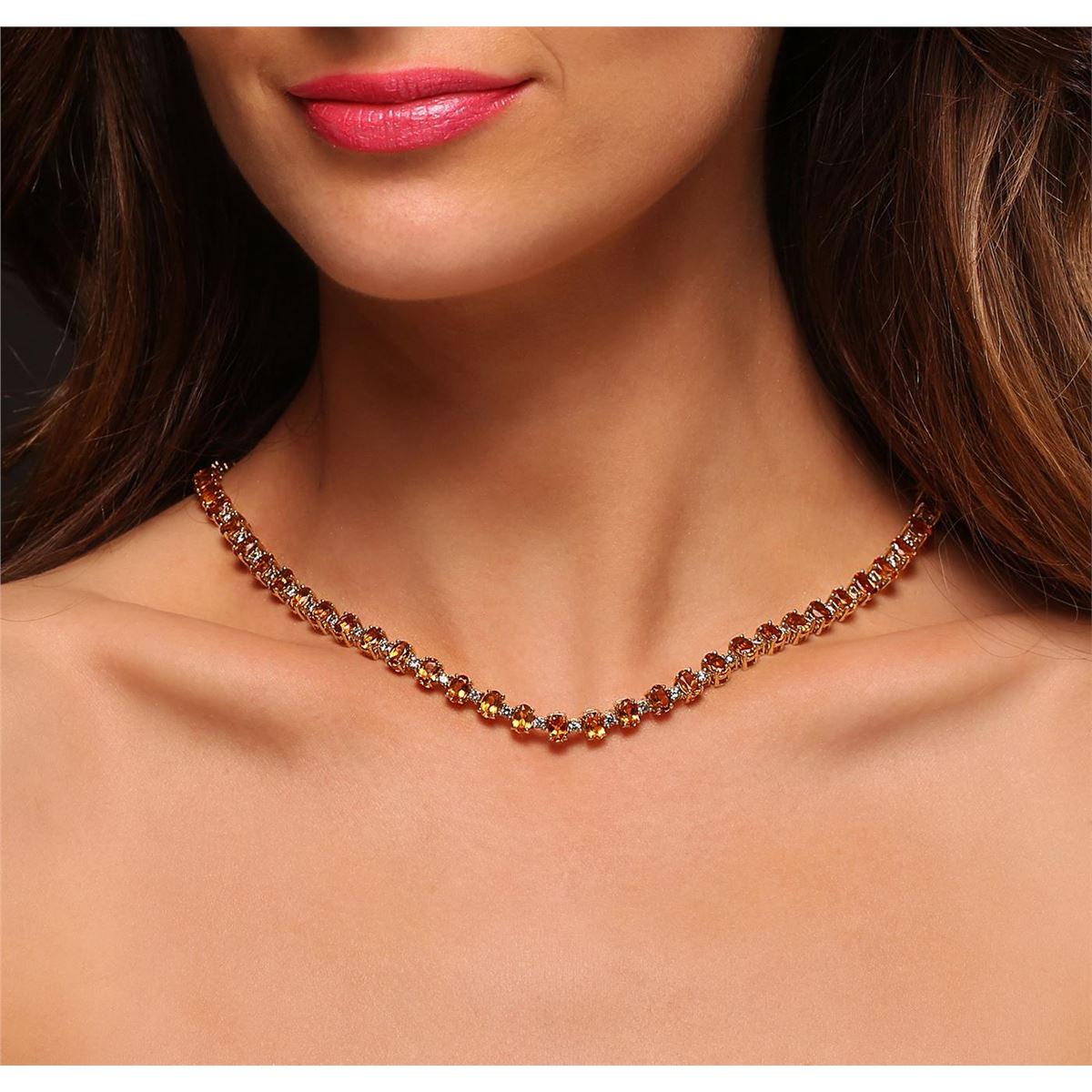 One electronically tested 14KT yellow gold ladies cast & assembled citrine and diamond necklace with a bright polish finish. Condition is new, good workmanship. Seventeen and one-half inch length necklace features a flexible ribbon of citrine and diamonds transitioning into a flexible citrine ribbon, terminating in a concealed clasp with safety. Identified with markings of "14K". Containing: Eighty prong set oval mixed cut natural citrine quartz's, measuring 6.00 x 4.00 x 2.70mm, 6%. bulge factor, approximate. Total Weight of 30.50ct., clarity is eye clean, type I, medium dark, slightly brownish, yellowish orange color, (GIA yO 6/2), cut is good. Transmitting light with no distortion, transparent. Measurements & the color grade are an average for the group. Refractive index testing results of 1.54 to 1.55. This is a conclusive result for quartz (citrine). Graded in the setting. Thirty-One prong set round brilliant cut diamonds, measuring 2.40 - 2.30 x 1.41mm (depth est.) approximate. Total Weight of 31 Stones = 1.57ct. Faint secondary color throughout. Graded in the setting. Clarity: I-1 to I-3. Color: K - M. Total Weight of Colored Stones 30.50ct. Total Weight of Diamonds 1.57ct. Total Weight of Necklace 36.80 grams. AIG Appraised at $9,670.00.