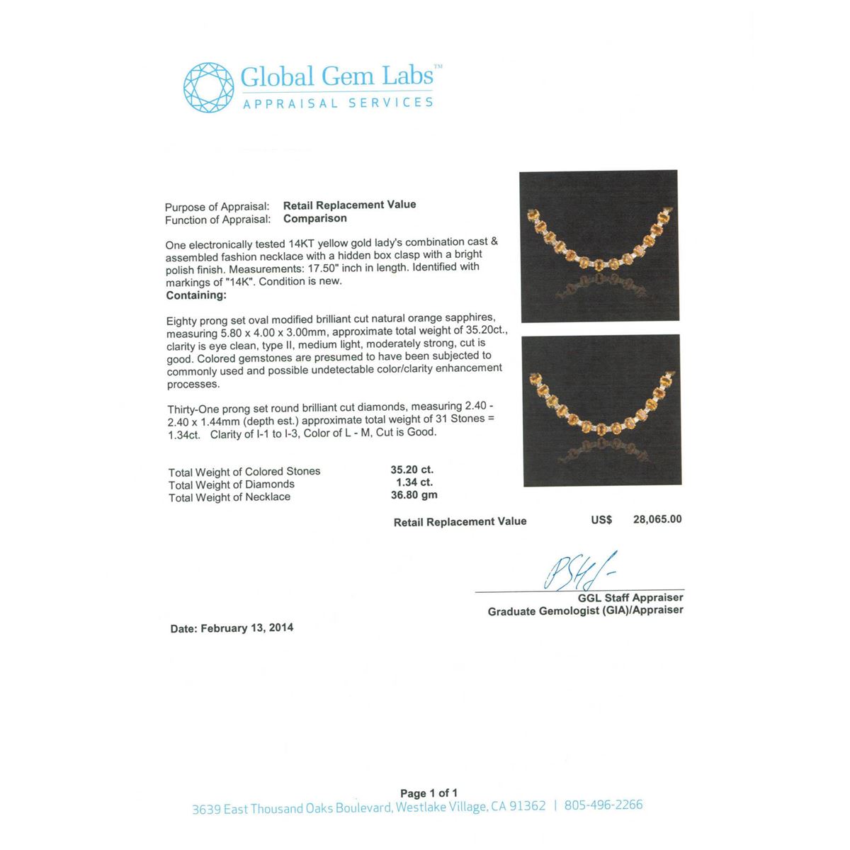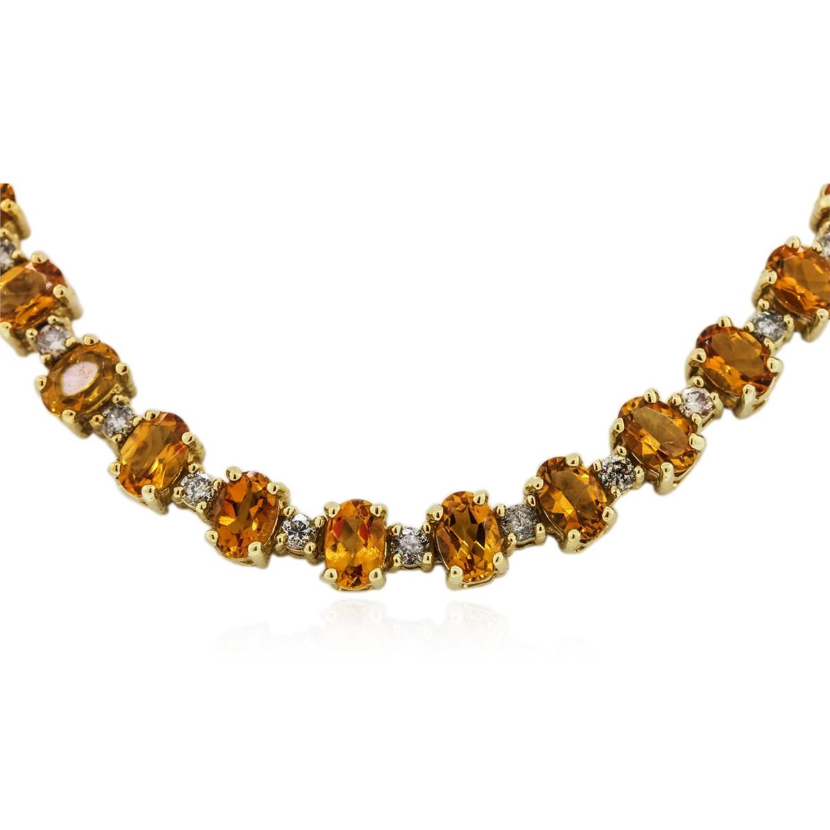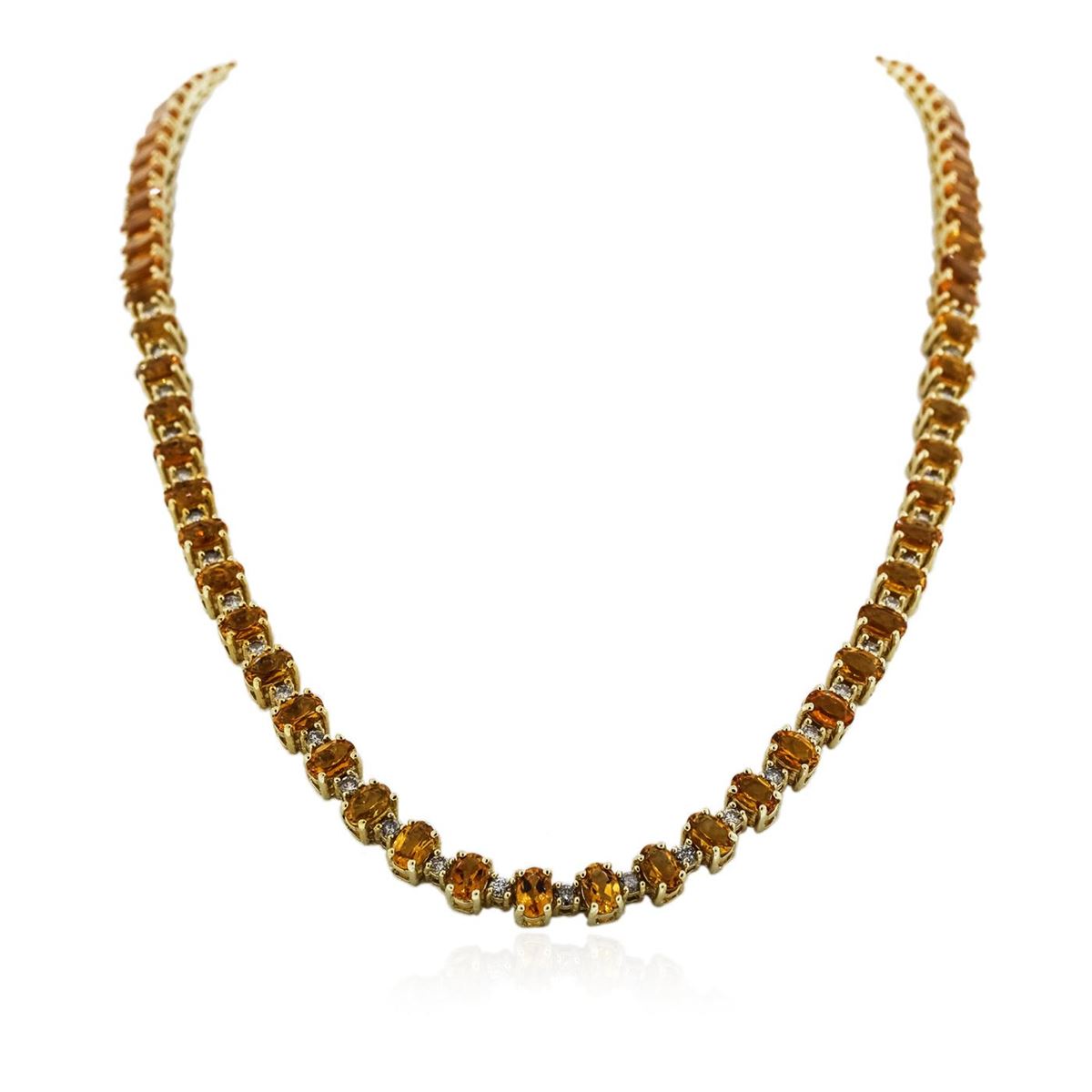 One electronically tested 14KT yellow gold ladies cast & assembled citrine and diamond necklace with a bright polish finish. Condition is new, good workmanship. Seventeen and one-half inch length necklace features a flexible ribbon of citrine and diamonds transitioning into a flexible citrine ribbon, terminating in a concealed clasp with safety. Identified with markings of "14K". Containing: Eighty prong set oval mixed cut natural citrine quartz's, measuring 6.00 x 4.00 x 2.70mm, 6%. bulge factor, approximate. Total Weight of 30.50ct., clarity is eye clean, type I, medium dark, slightly brownish, yellowish orange color, (GIA yO 6/2), cut is good. Transmitting light with no distortion, transparent. Measurements & the color grade are an average for the group. Refractive index testing results of 1.54 to 1.55. This is a conclusive result for quartz (citrine). Graded in the setting. Thirty-One prong set round brilliant cut diamonds, measuring 2.40 - 2.30 x 1.41mm (depth est.) approximate. Total Weight of 31 Stones = 1.57ct. Faint secondary color throughout. Graded in the setting. Clarity: I-1 to I-3. Color: K - M. Total Weight of Colored Stones 30.50ct. Total Weight of Diamonds 1.57ct. Total Weight of Necklace 36.80 grams. AIG Appraised at $9,670.00.