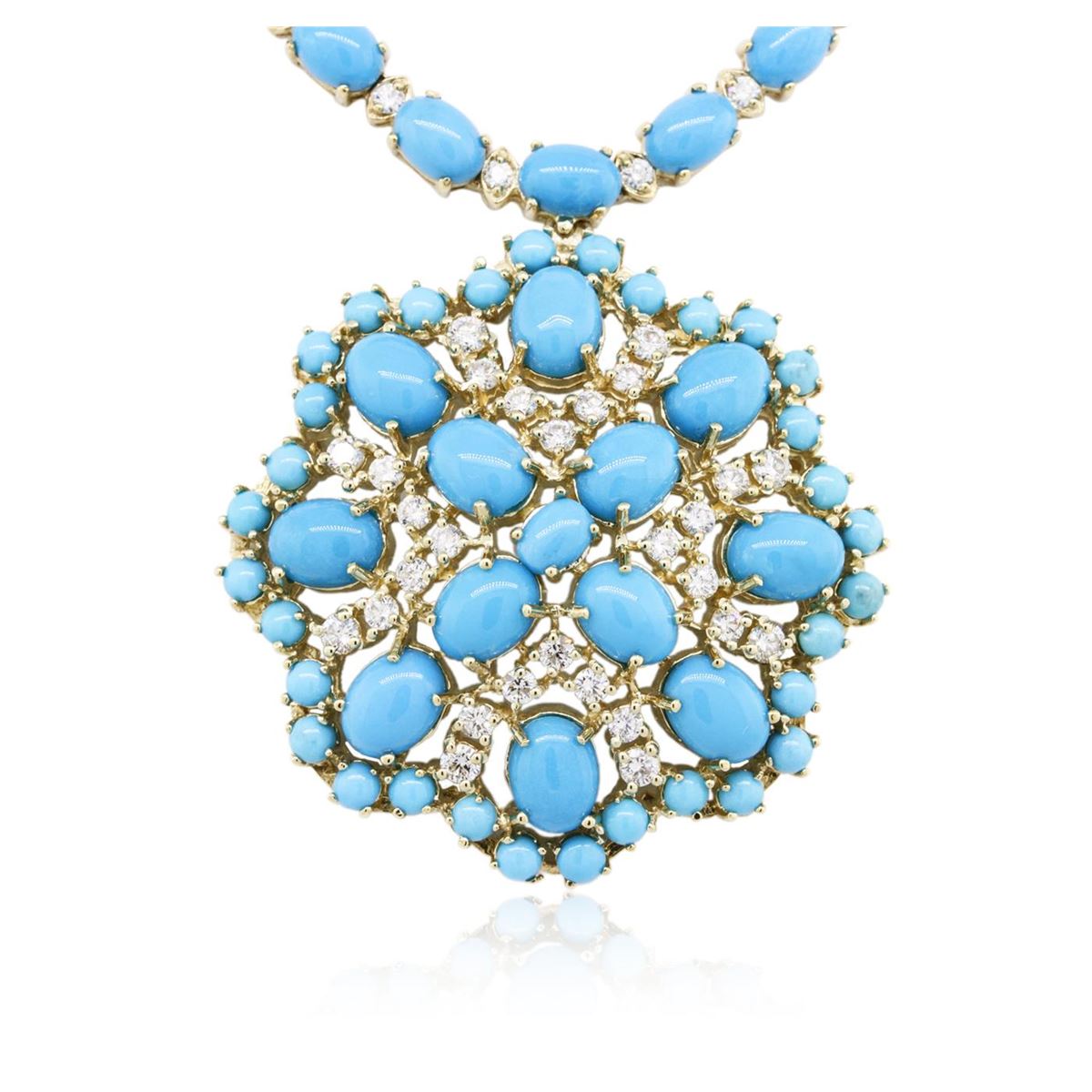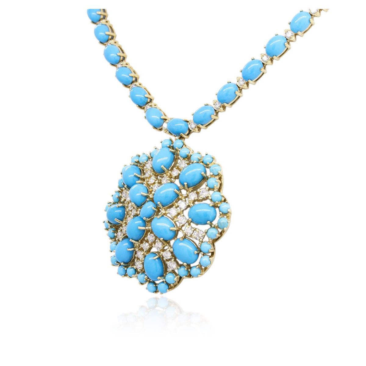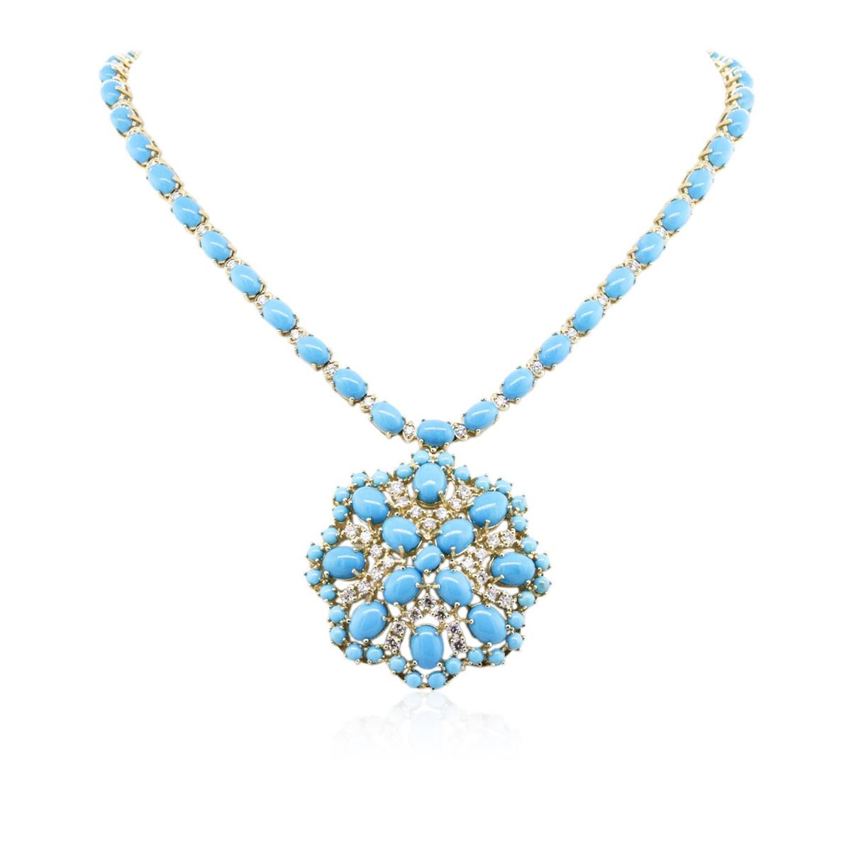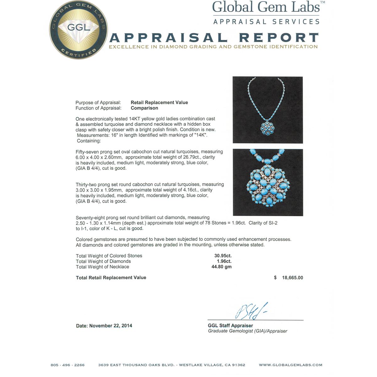 One electronically tested 14KT yellow gold ladies combination cast & assembled turquoise and diamond necklace with a hidden box clasp with safety closer with a bright polish finish. Measurements: 16" in length Identified with markings of "14K". Condition is new. Containing: Fifty-seven prong set oval cabochon cut natural turquoises, measuring 6.00 x 4.00 x 2.60mm, approximate total weight of 26.79ct., clarity is heavily included, medium light, moderately strong, blue color, (GIA B 4/4), cut is good. Thirty-two prong set round cabochon cut natural turquoises, measuring 3.00 x 3.00 x 1.95mm, approximate total weight of 4.16ct., clarity is heavily included, medium light, moderately strong, blue color, (GIA B 4/4), cut is good. Seventy-Eight prong set round brilliant cut diamonds, measuring 2.50 - 1.30 x 1.14mm (depth est.) approximate total weight of 78 Stones = 1.96ct. Clarity: SI-2 to I-1. Color: K - L, Cut is Good. Colored gemstones are presumed to have been subjected to commonly used enhancement processes. All diamonds and colored gemstones are graded in the mounting, unless otherwise stated. Total Weight of Colored Stones 30.95ct. Total Weight of Diamonds 1.96ct. Total Weight of Necklace 44.80 grams. GGL Appraised at $18,665.00.